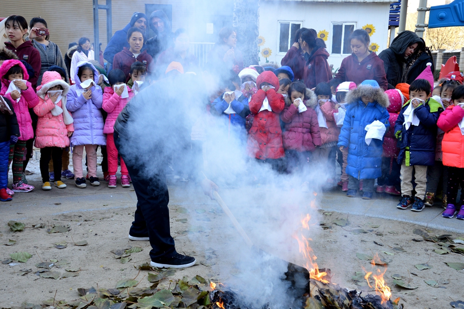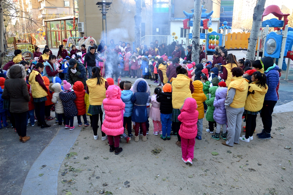 在操场上老师为孩子们讲解消防知识和遇到火灾了应该如何去做 ,最后后勤的师傅们为孩子们展示了灭火的方法和过程。