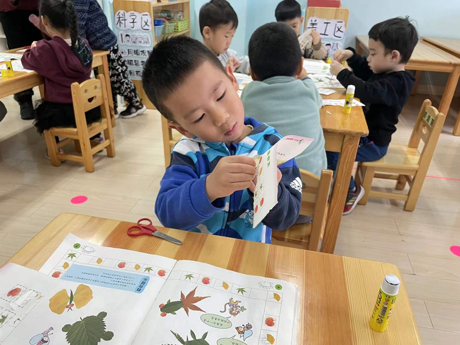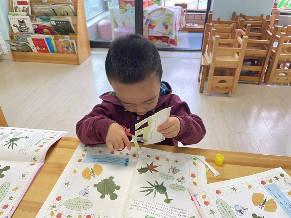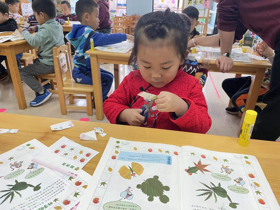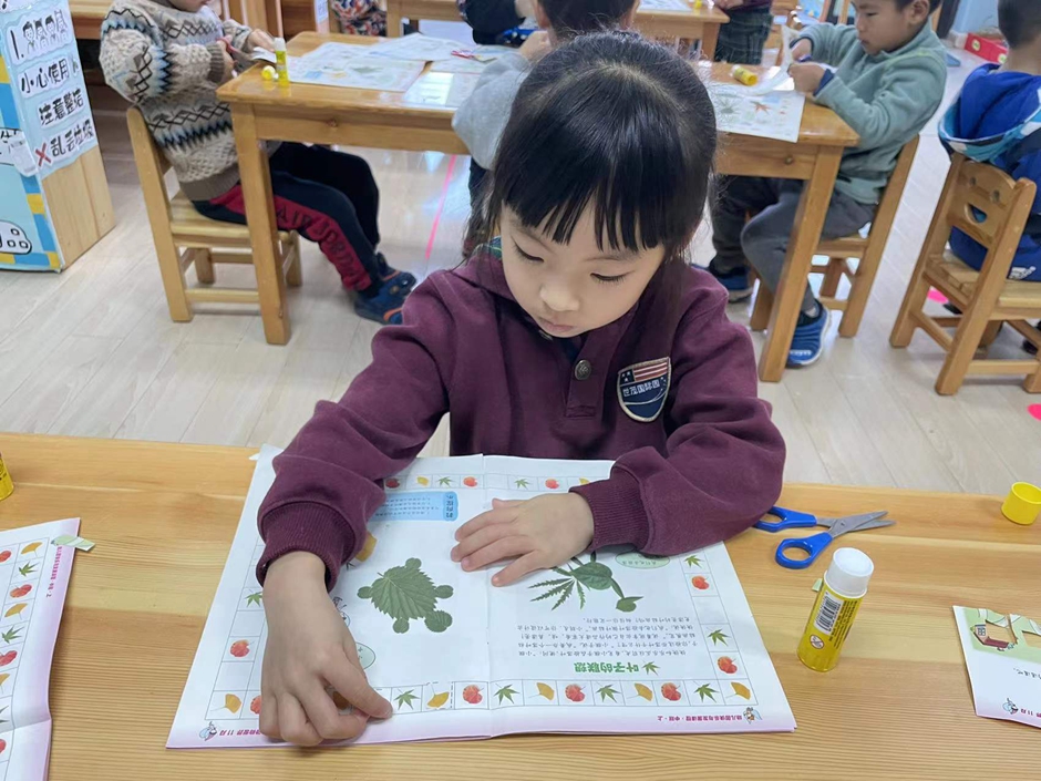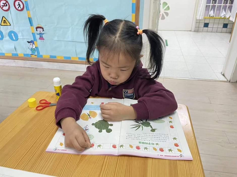 书上的内容太有趣了,今天我们剪了树叶找规律贴在了对应的位置上。给自己点个赞。