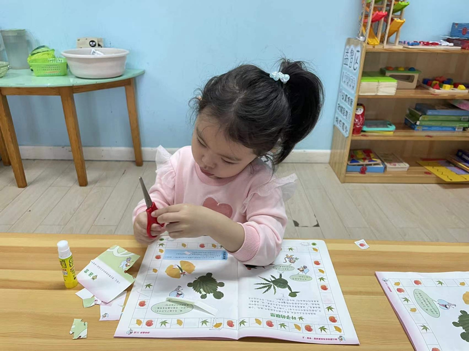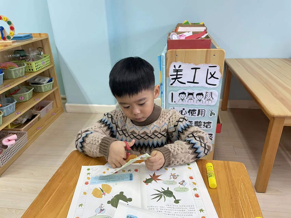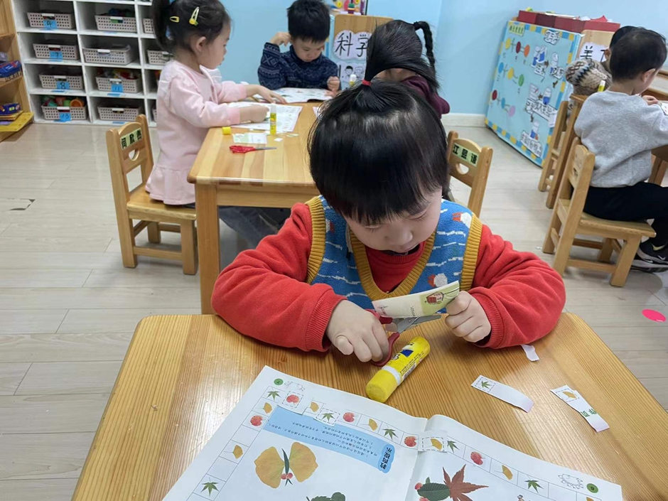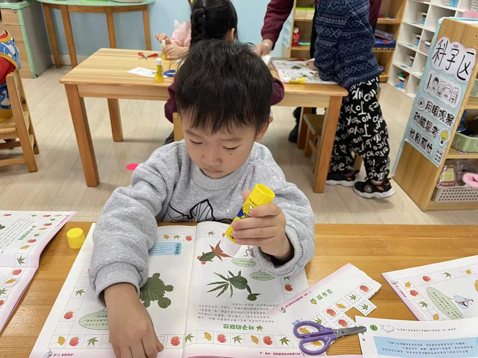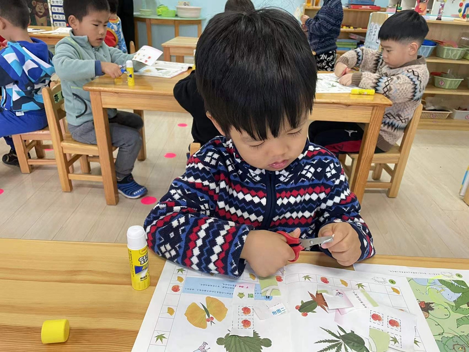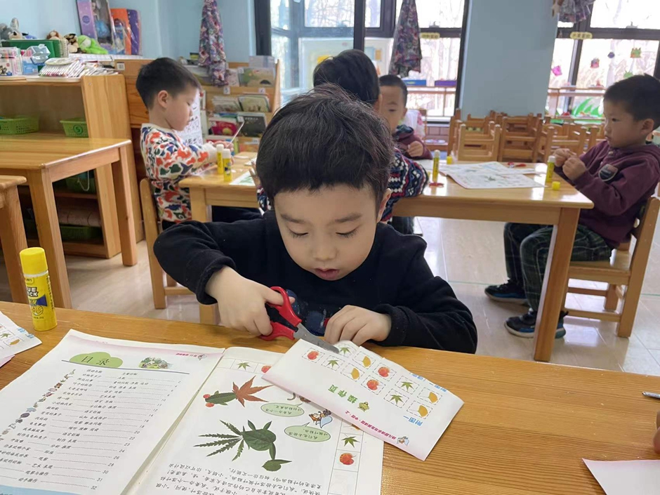 书上的内容太有趣了,今天我们剪了树叶找规律贴在了对应的位置上。给自己点个赞。