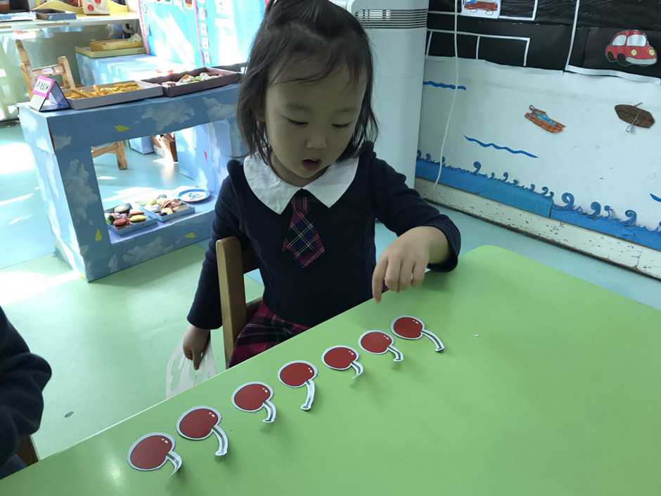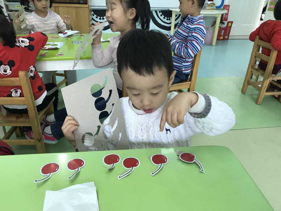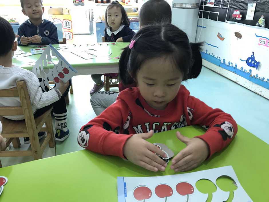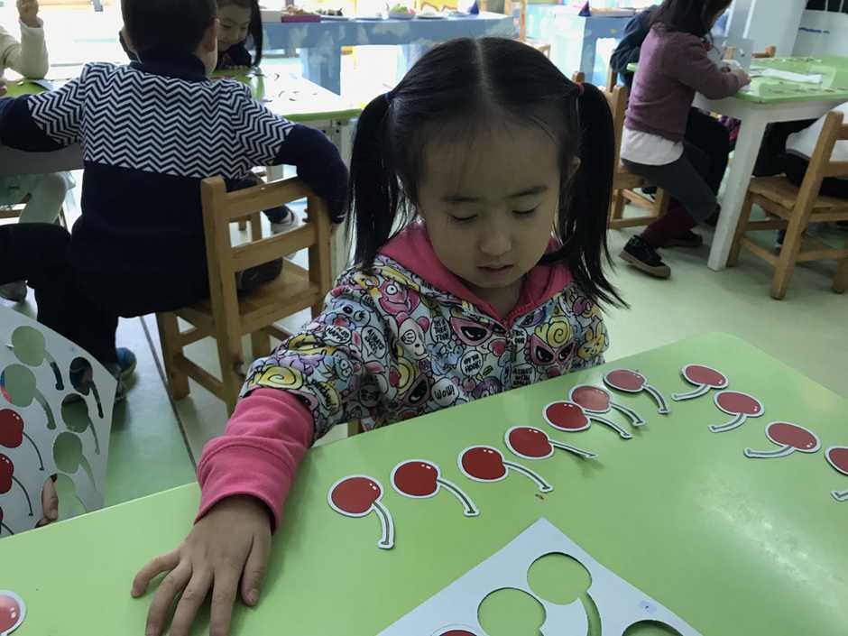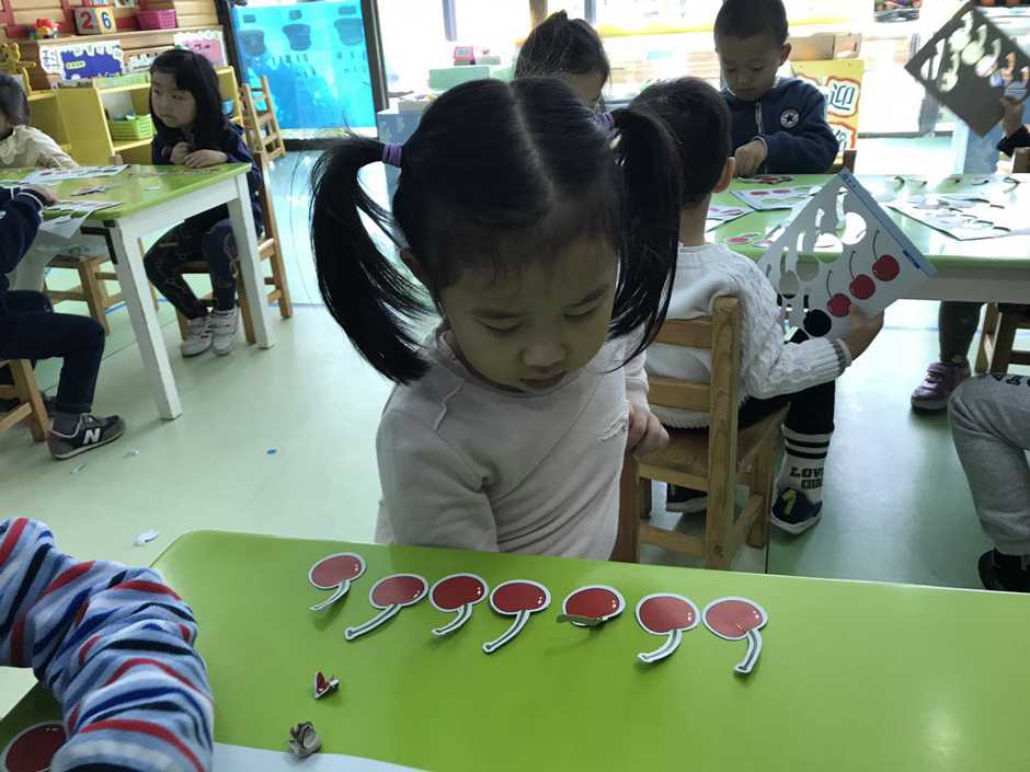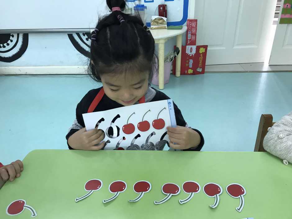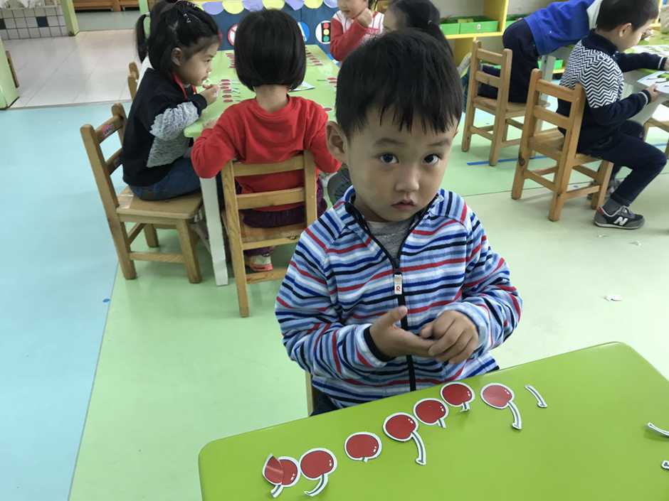 接着我们用他们想吃的食物来操作感知8、9的实际意义,小朋友通过教师拍手次数取出相应数量的樱桃,看谁去取得又快又准确。