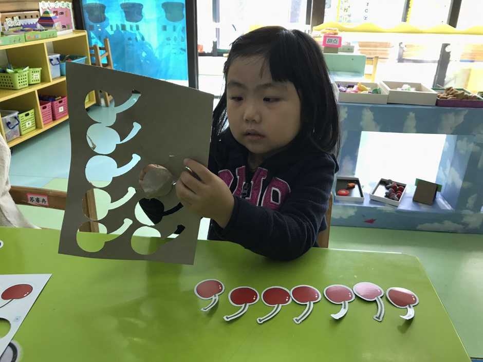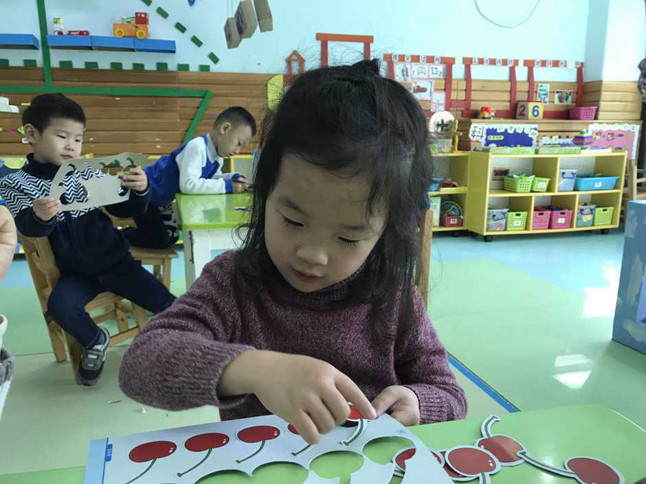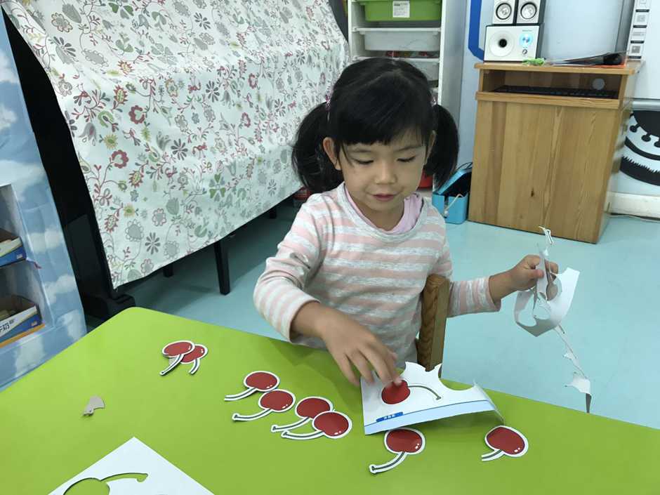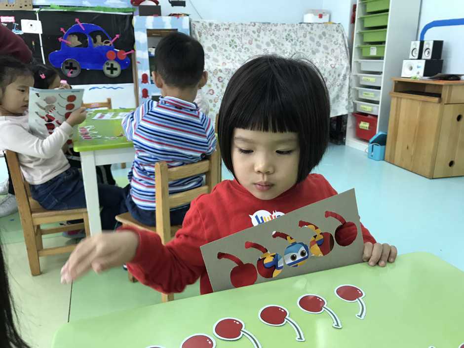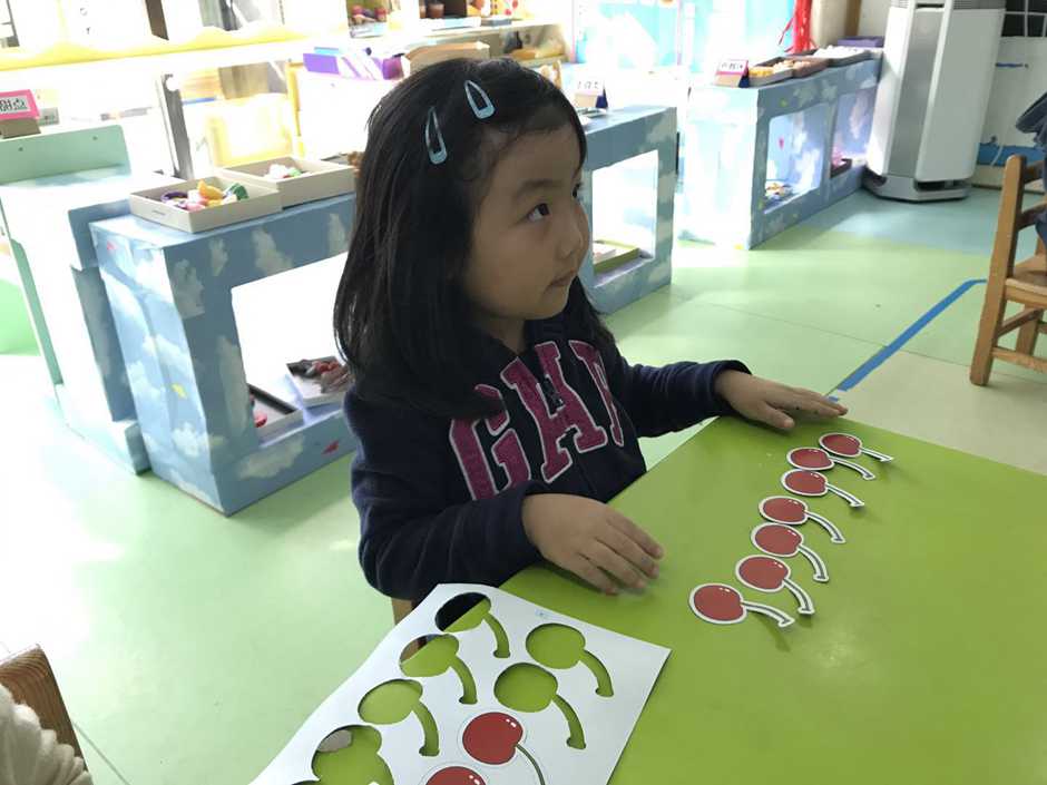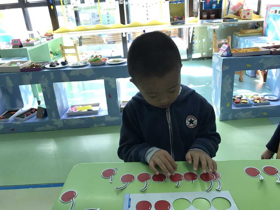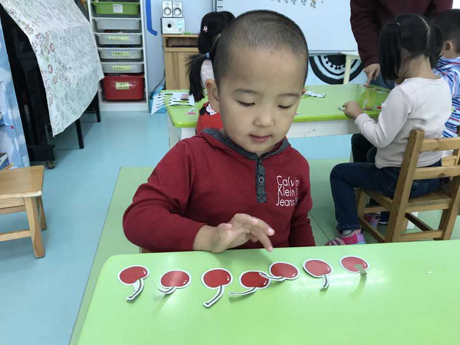 接着我们用他们想吃的食物来操作感知8、9的实际意义,小朋友通过教师拍手次数取出相应数量的樱桃,看谁去取得又快又准确。