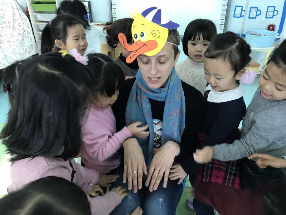 I prepared for the class several masks with animals and asked babies close their eyes for 5 seconds. When they opened their eyes i had a duck mask on my head, then i asked babies “Can you pet a duck?” - babies responded “Yes, we can!” - “Can you,please, pet a duck!”.