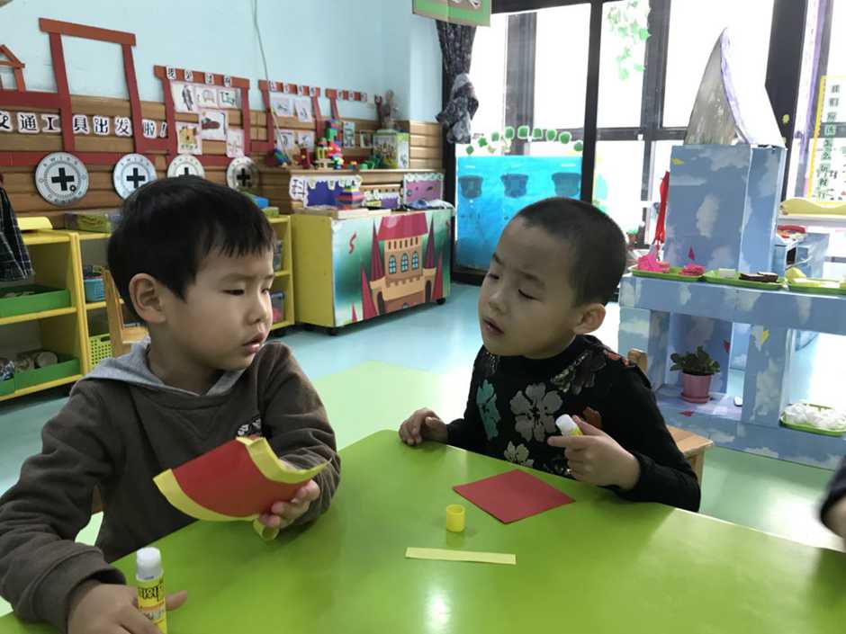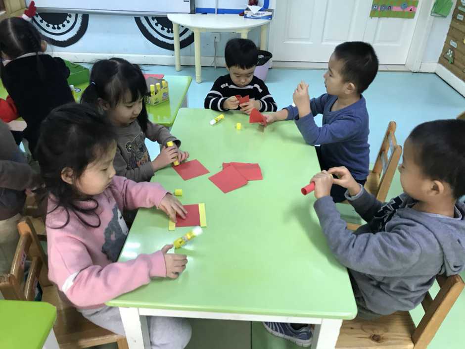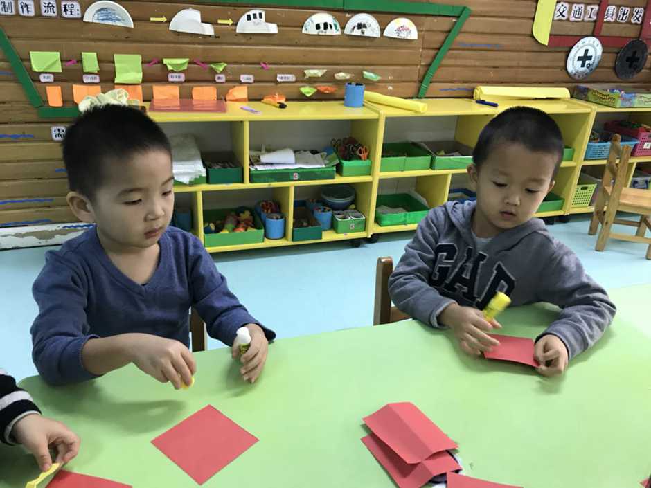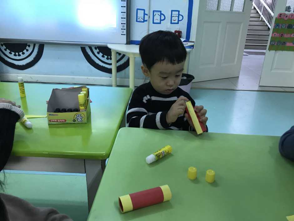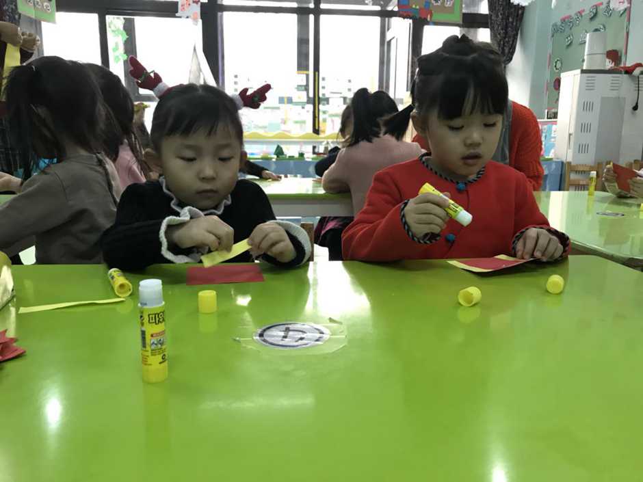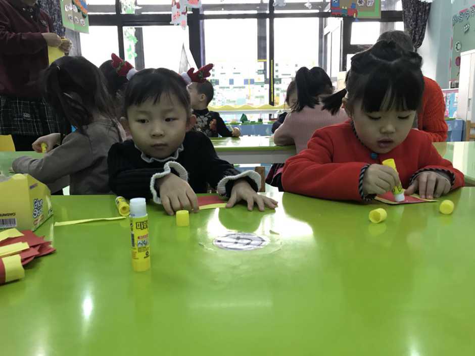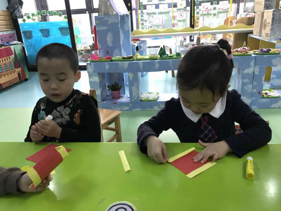 Babies had to stick yellow strips to red paper and make a cylinder using glue.
