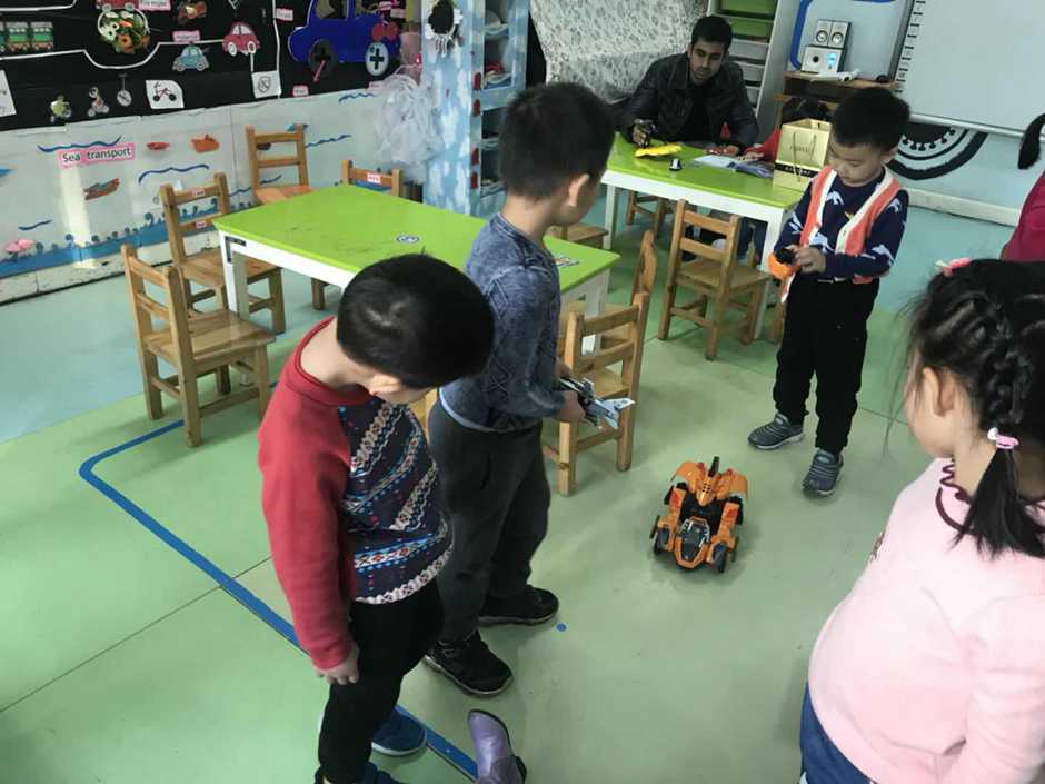 看!这是什么啊?是小男生最爱的遥控汽车。所以我们轮流来玩。