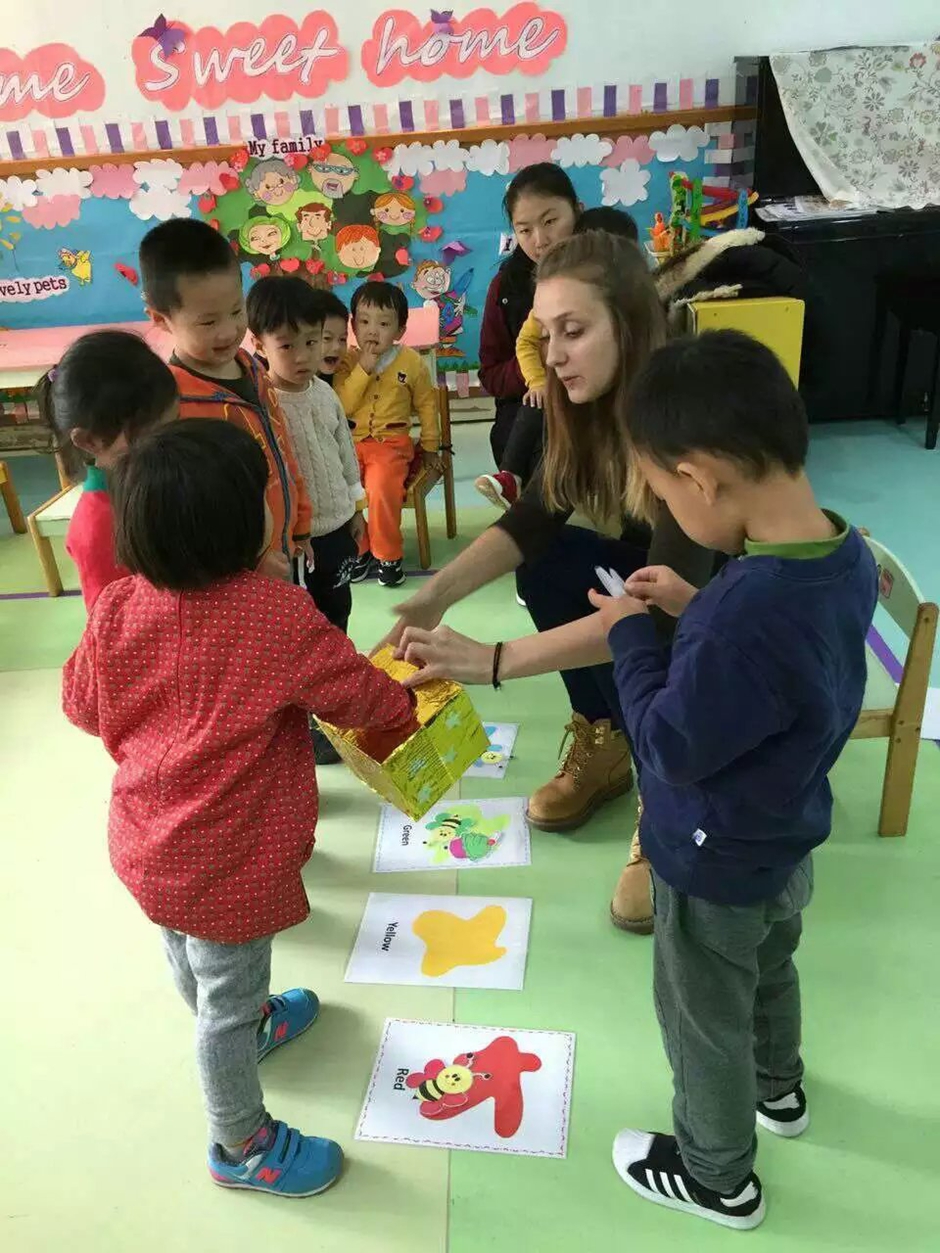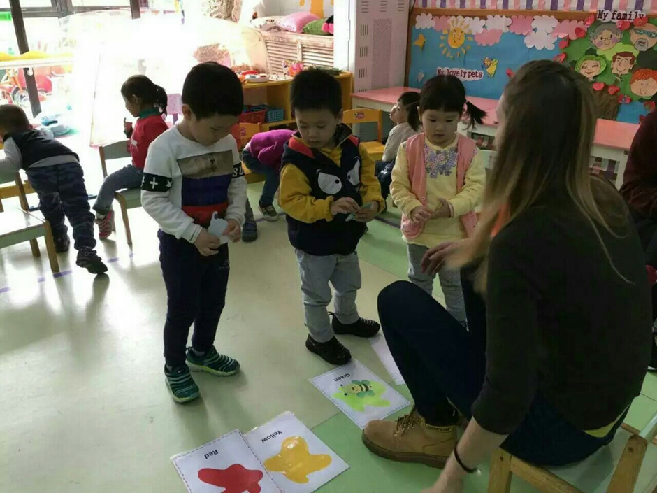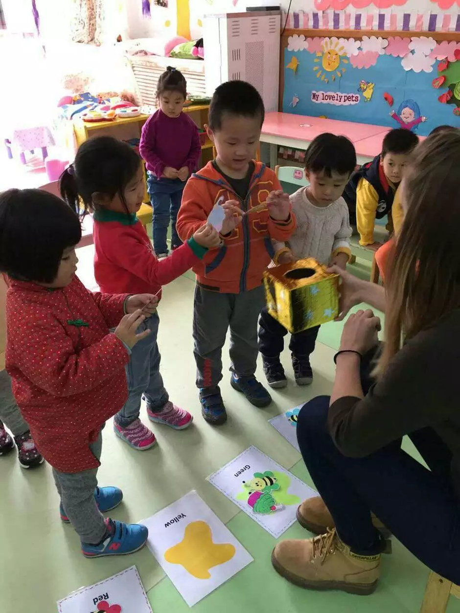 The main point of the lesson was to stick all our friends on a”appropriate color” card. For example “ Duck is yellow and should be stuck on yellow color card”. Every Child had to get one friend from the magic box and loudly say “This is the duck. The duck is blue” and stick duck to yellow “color” card. When all animals are stuck on their colors we gave color characteristic to every animal on cards