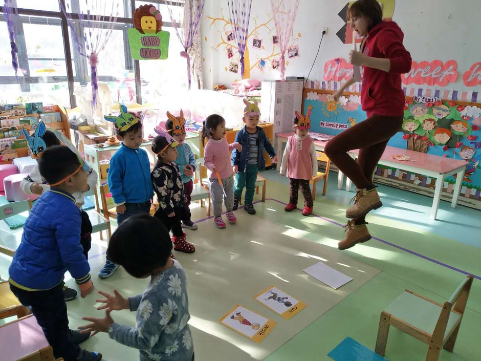 At the beginning of the lesson we got acquainted with new words. U can see rabbits masks on kids. To fix new words in memory more quickly i asked kids: “Look this is a rabbit! Tell me please, what can rabbit do?” - Rabbit can walk/ Run/ hop, yes or no? “ .
