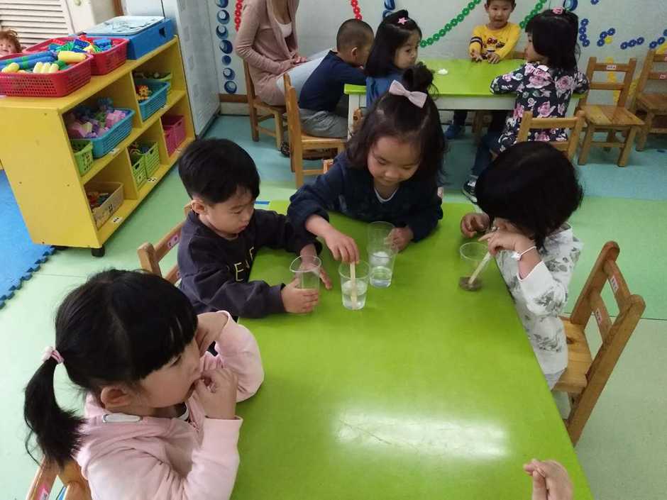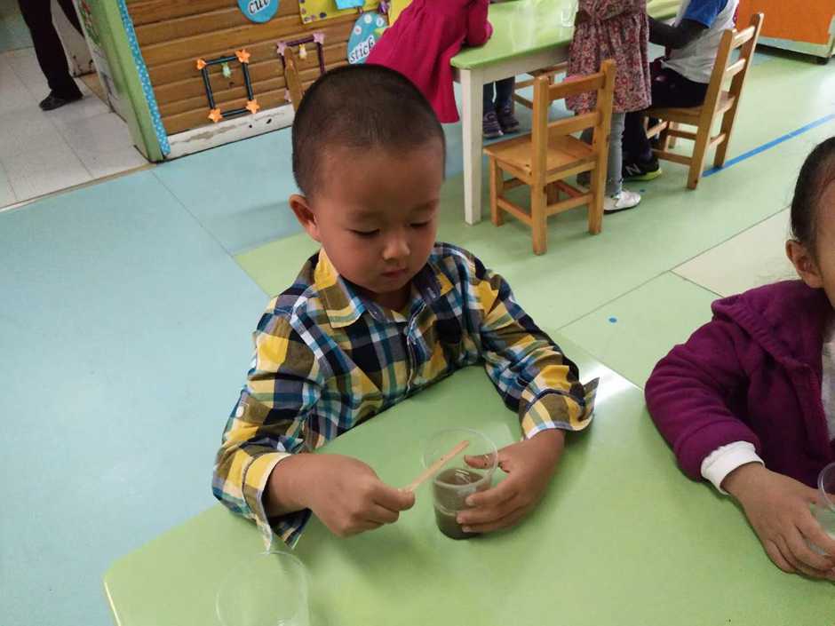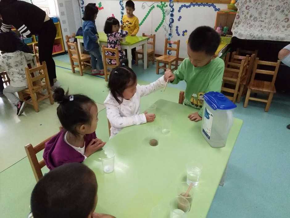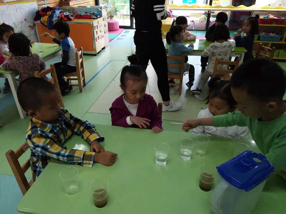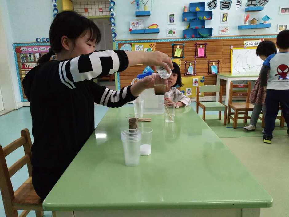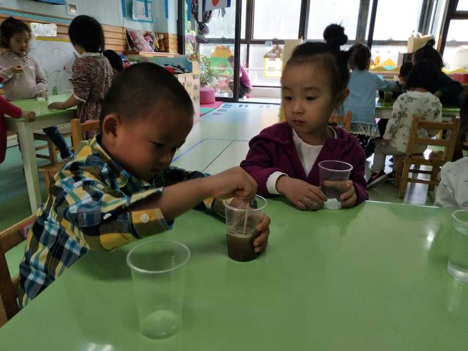 接下来我们把水分别倒入盐和沙子中,通过搅拌,最后盐不见了,但是沙子孩子。