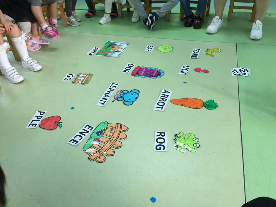 For this class I prepared printed words without first letter and kids had to guess which letter every word goes to: for example, i printed out the word “FROG” and cut off first letter (I did the same with all words) and put cut off letters separated.