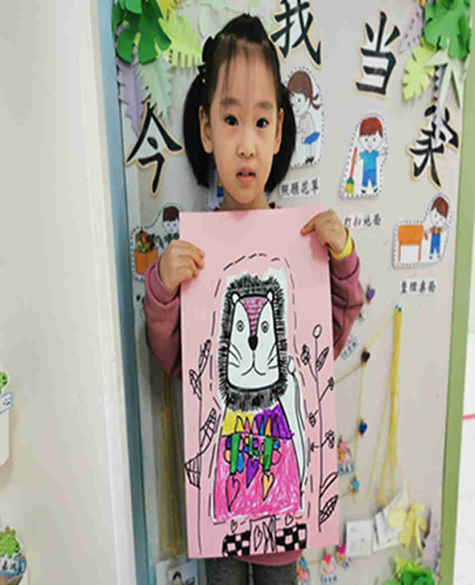 我们今天给大狮子换上漂亮的衣服啦!看我们的大狮子漂亮吧!