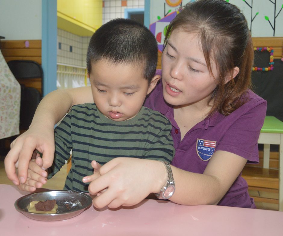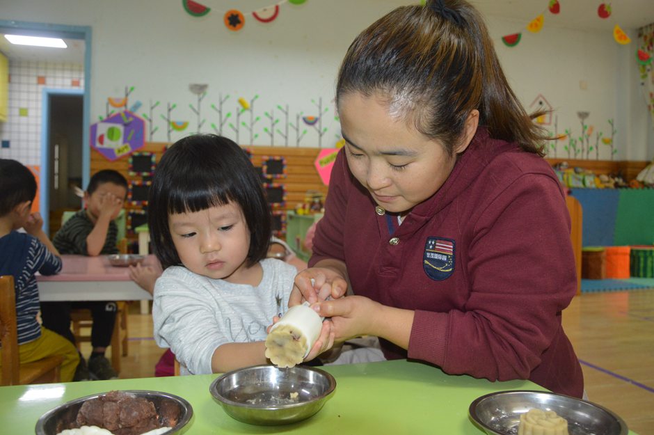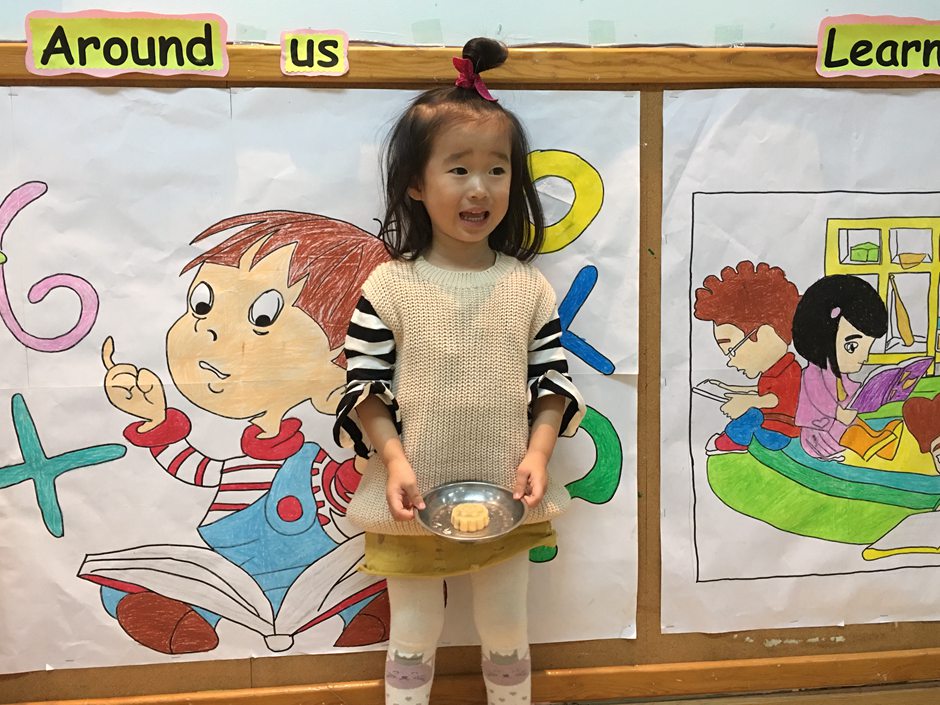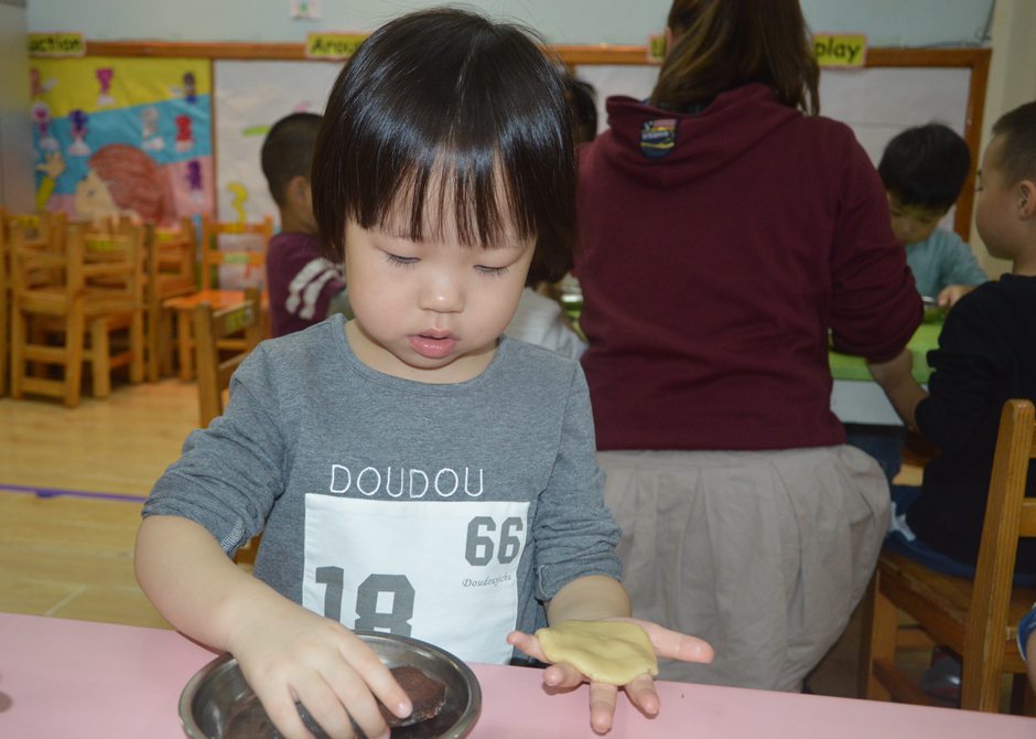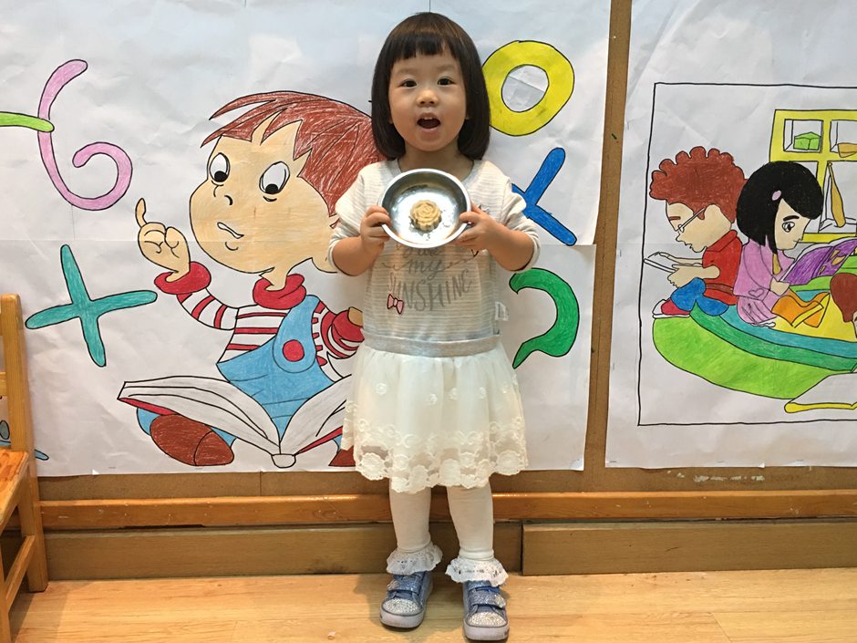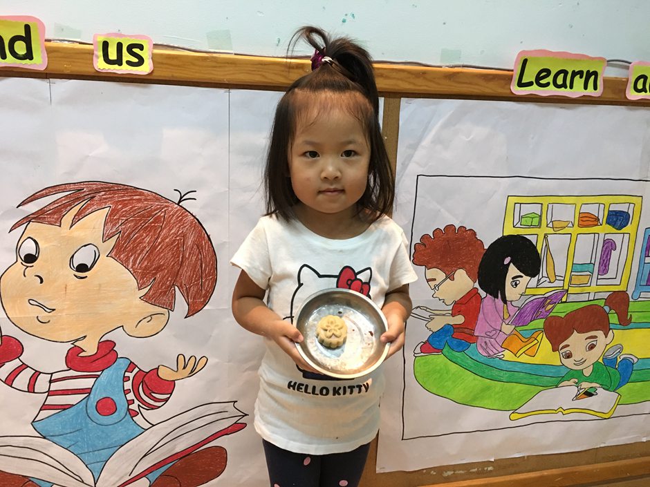 马上就要过中秋节了,老师带着孩子们了解节日的由来,先把皮压扁,然后放上豆沙馅,把它捏起来,用模具打出来,然后再烤出来,金黄色的月饼出炉了。