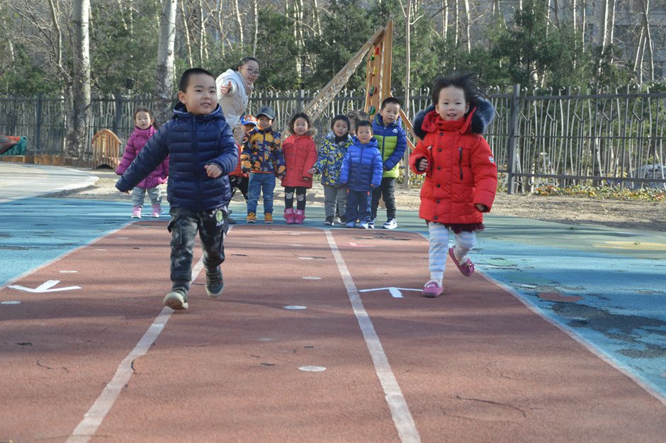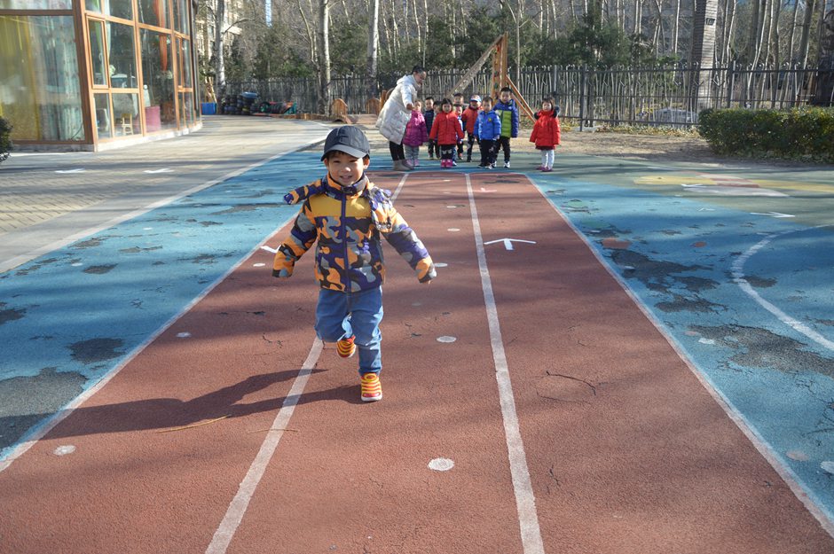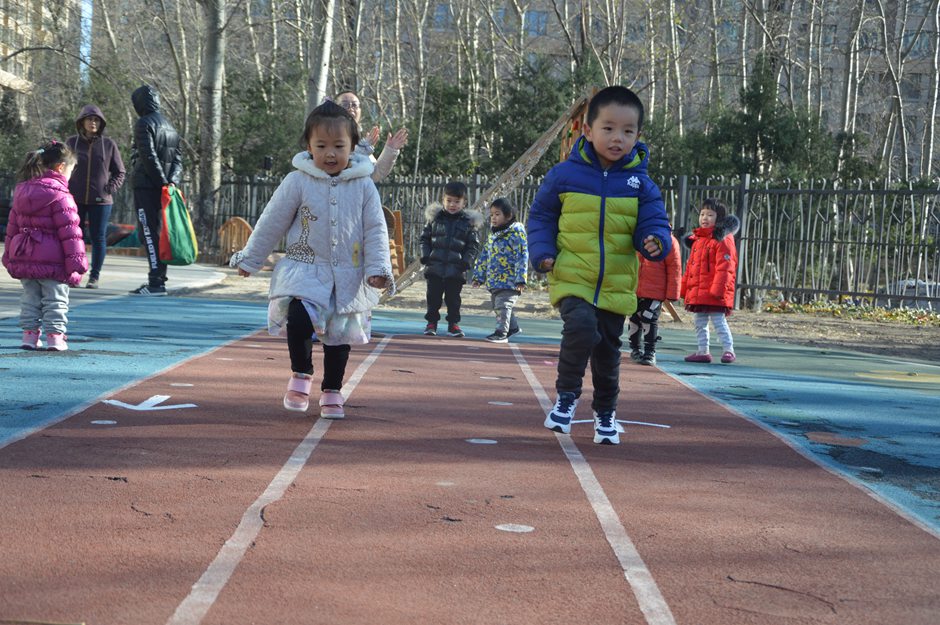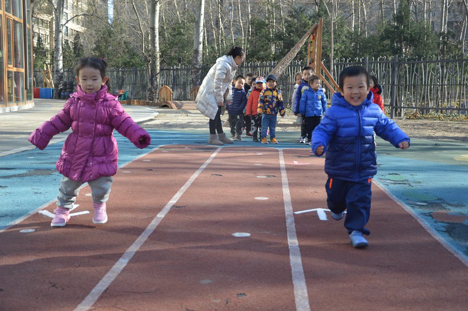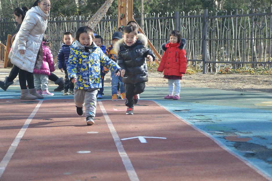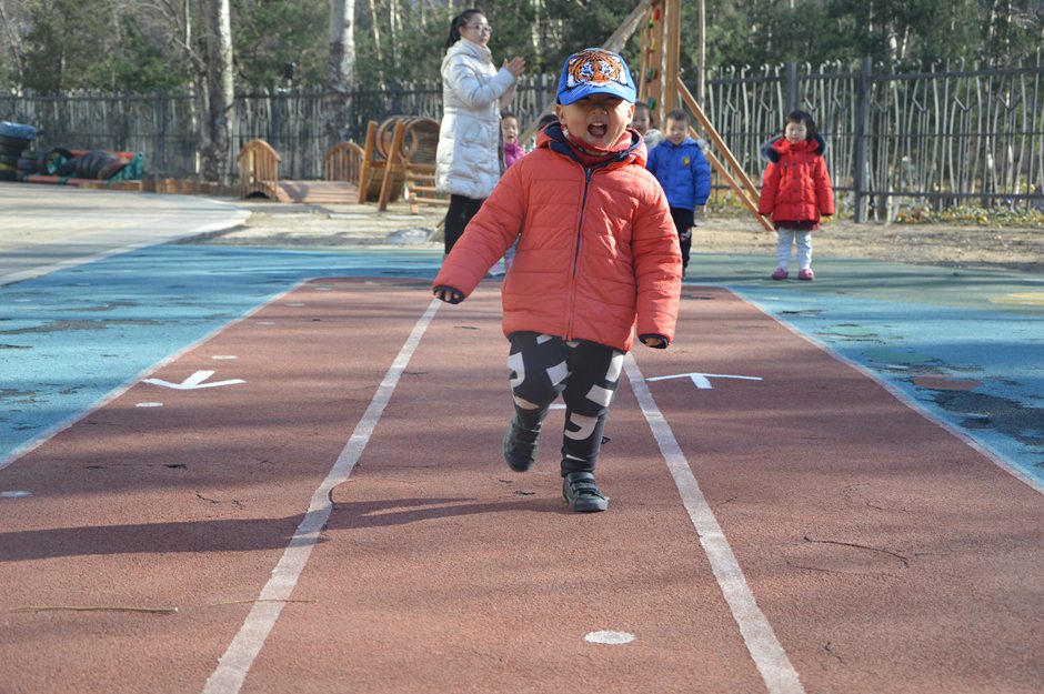短跑接力赛——通过跑拉丝锻炼幼儿的协调能力和跑的动作的规范性。老师会在玩之前和小朋友们讲好规则,我们要分成两队,每对两个人,后边的小朋友要按秩序排队,跑到前方要和老师拍到手才算胜利。(在跑的过程中要注意幼儿安全)