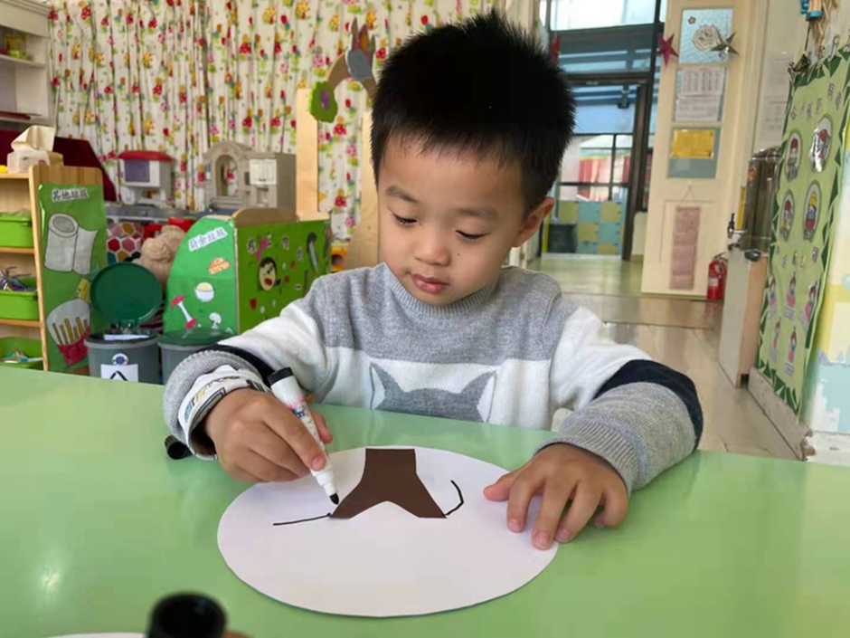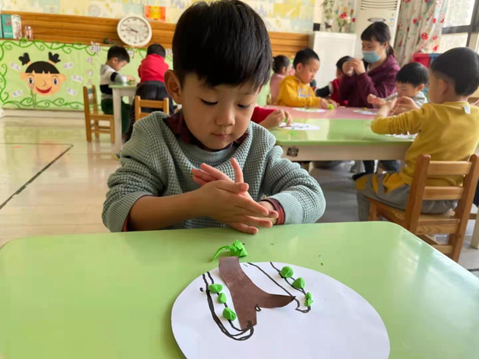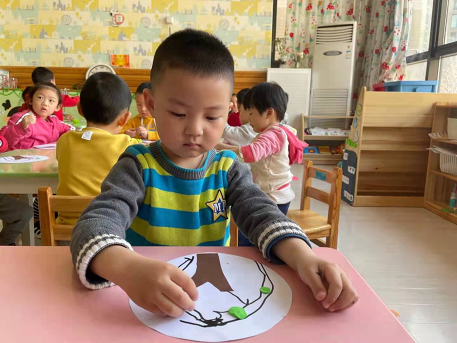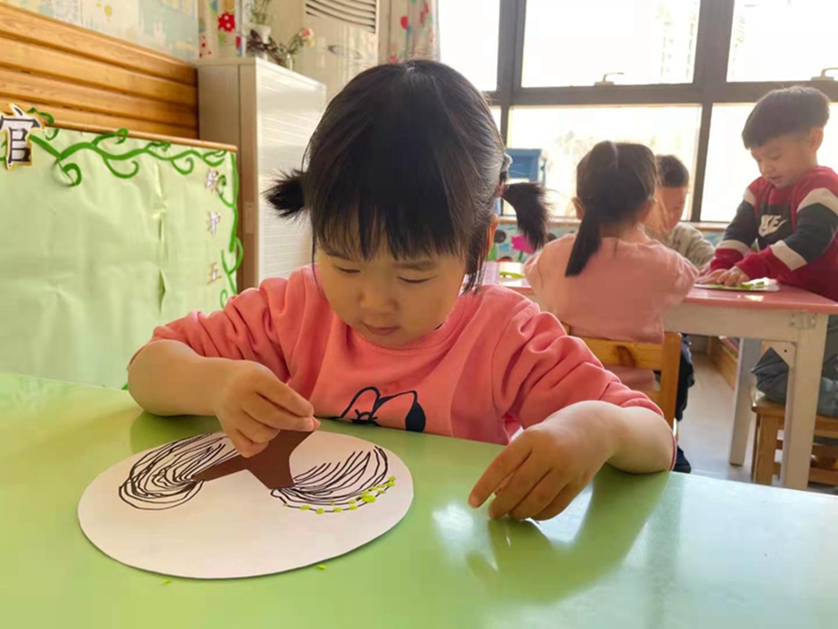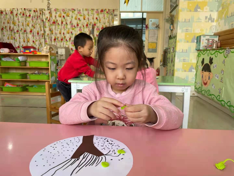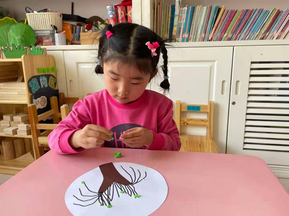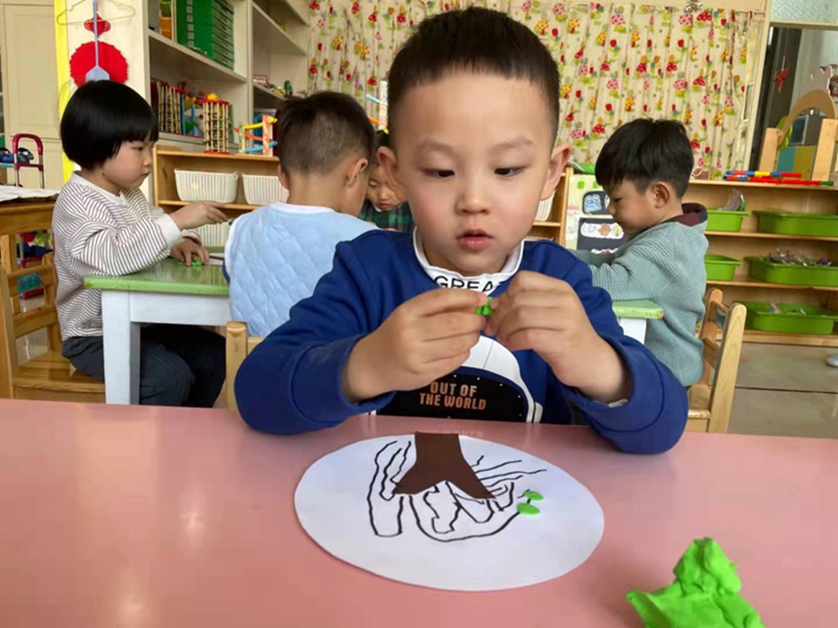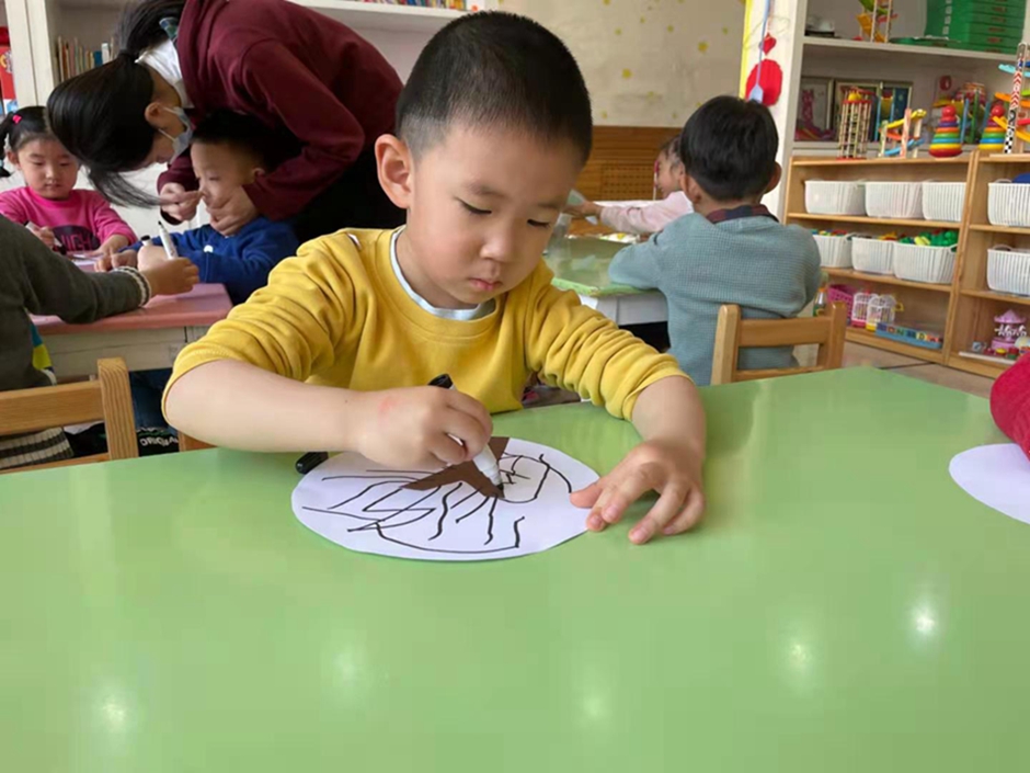 春天来啦,外面的树变绿了,小朋友手里的大树也变成绿色的啦。