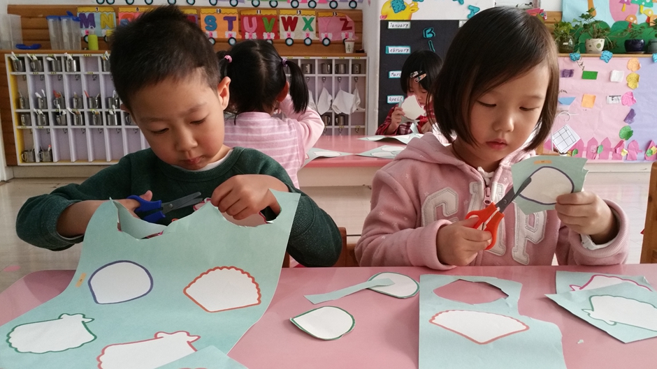 今天老师给我们带了好多各种各样漂亮的贝壳,我们都可以自己用小剪刀把它剪下来。