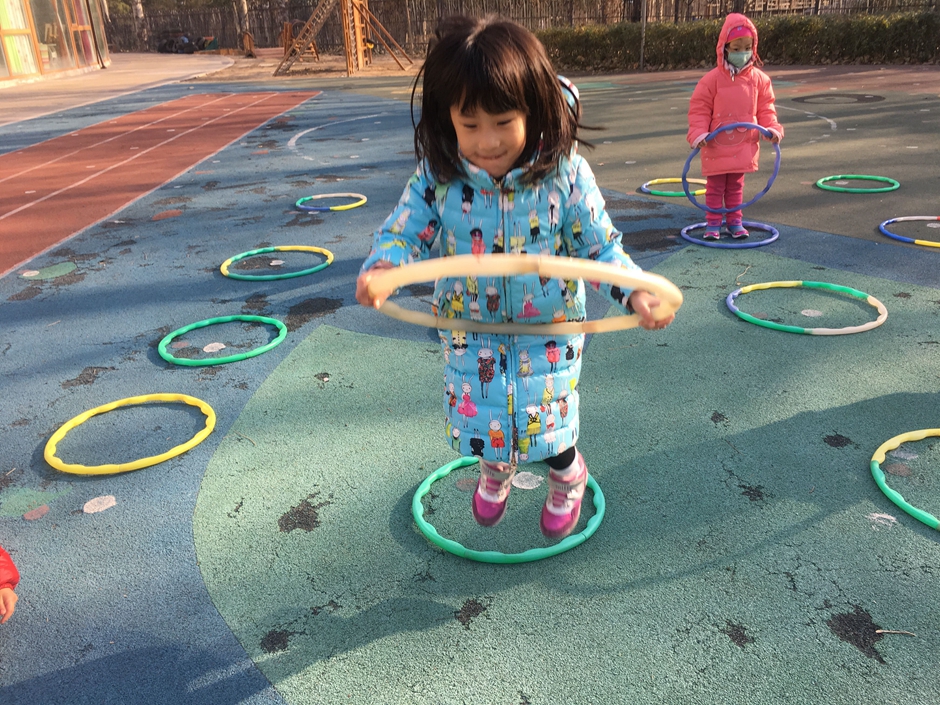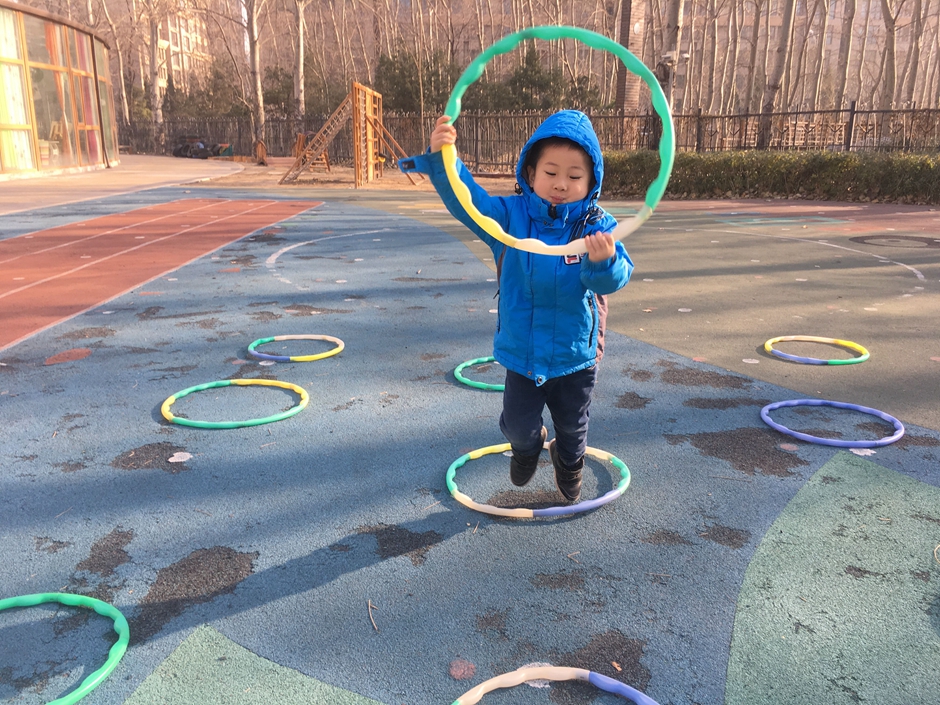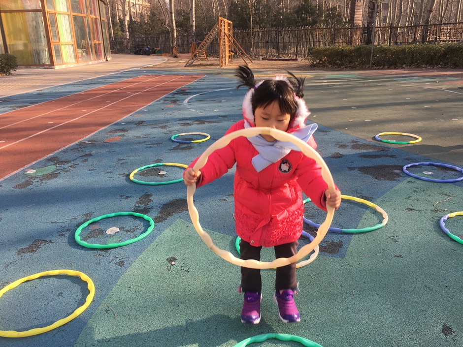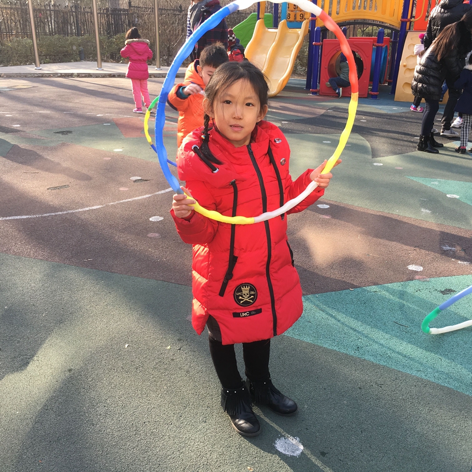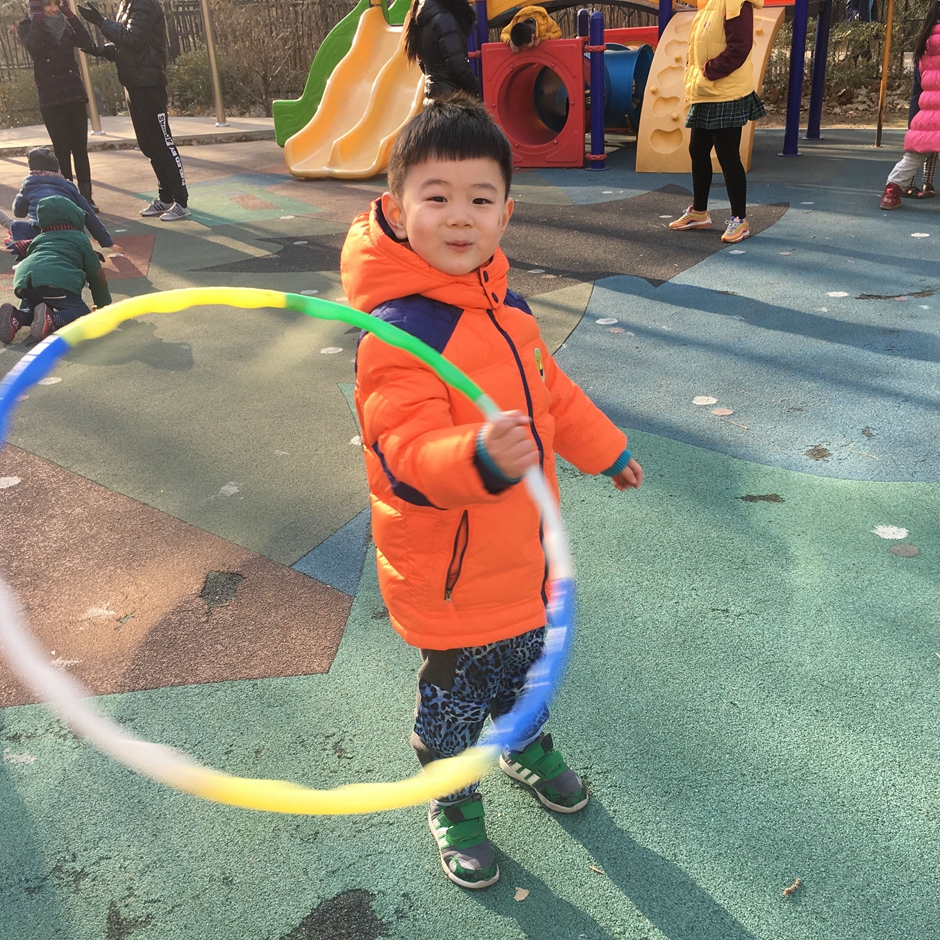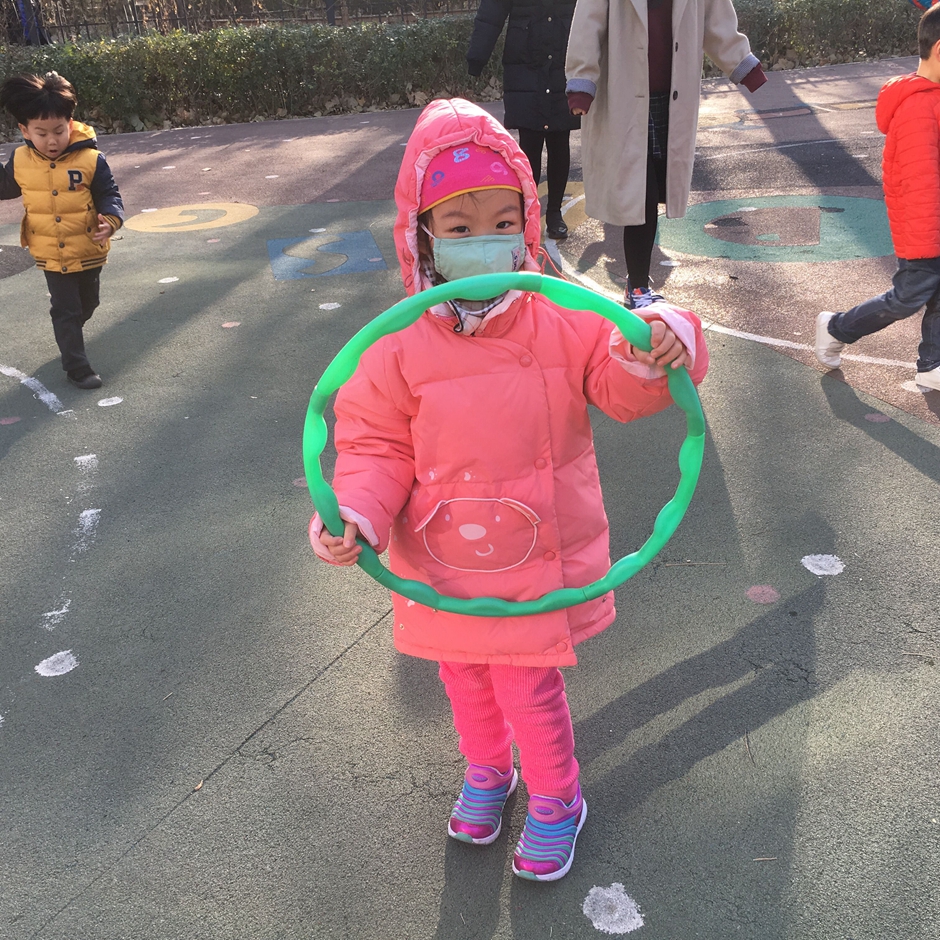 今天天气晴朗,可以去户外玩啦,看我们在玩呼啦圈呢,可以做自己想做的各种动作,还可以大家一起做一个呼啦圈操呢。