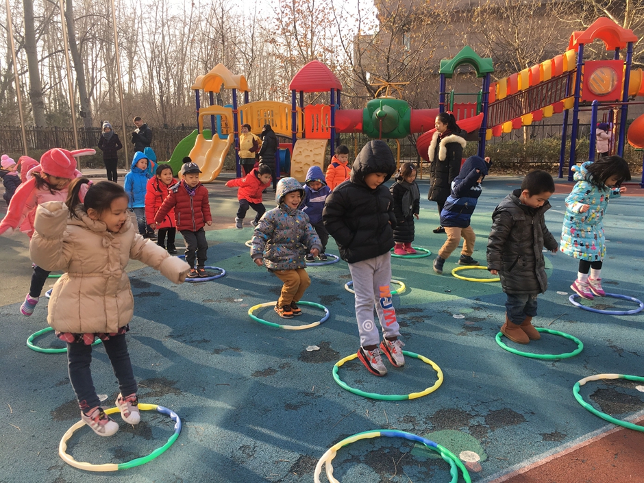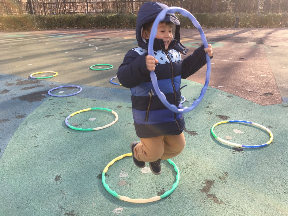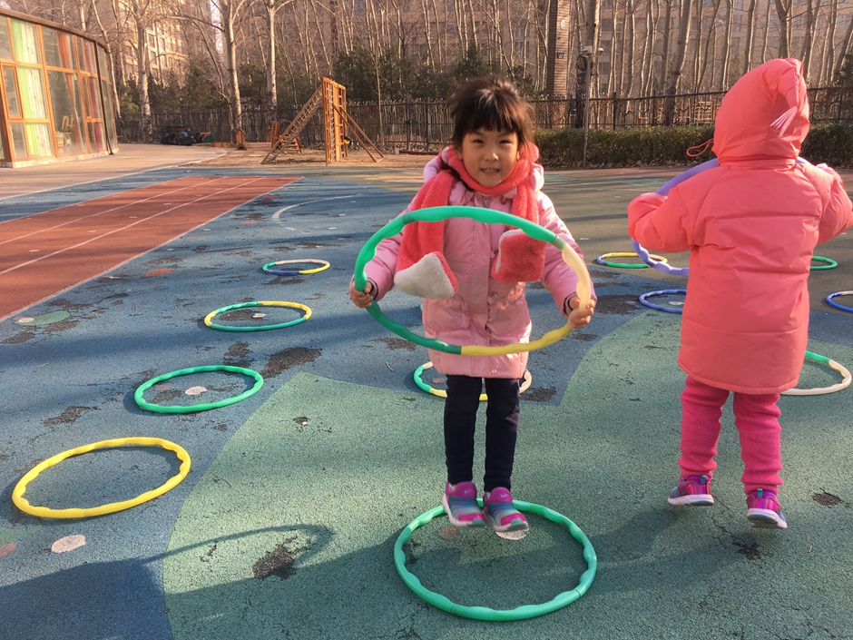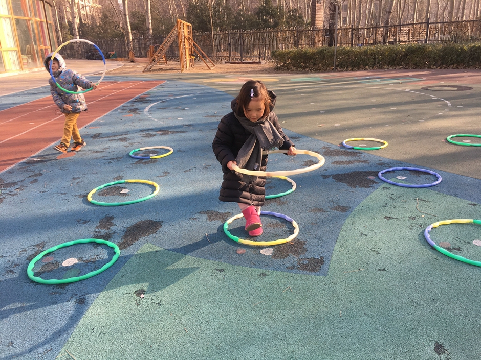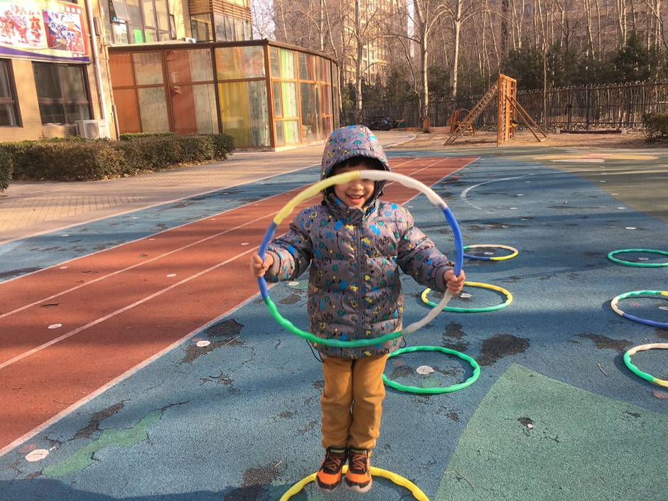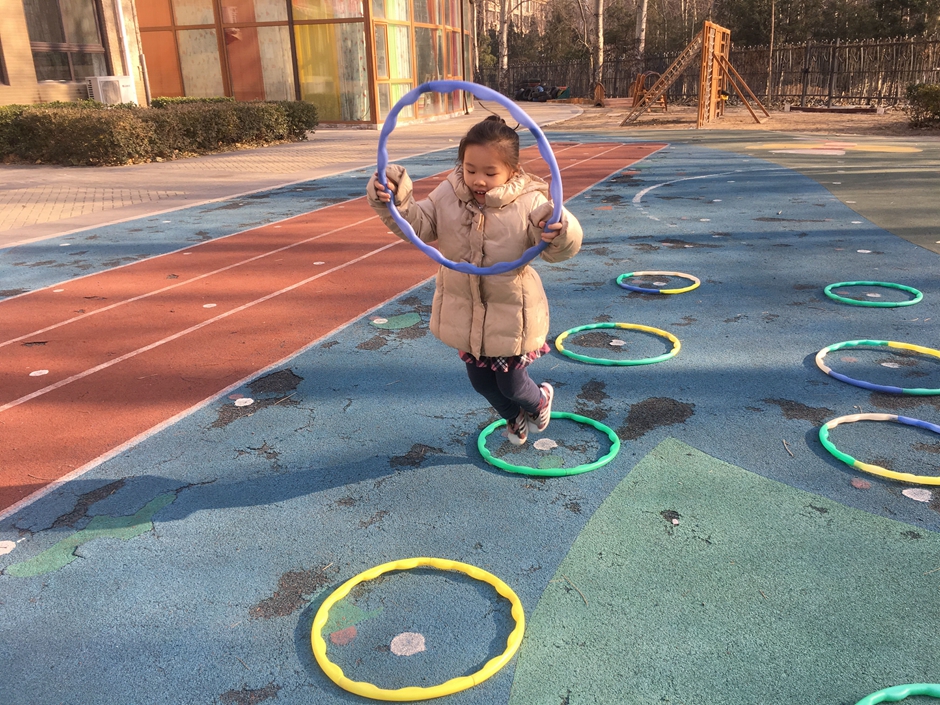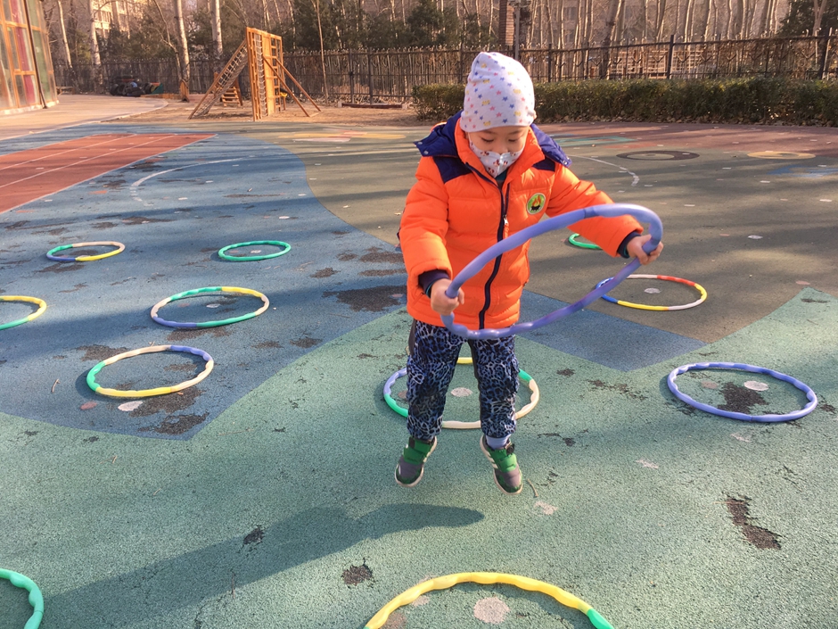 今天天气晴朗,可以去户外玩啦,看我们在玩呼啦圈呢,可以做自己想做的各种动作,还可以大家一起做一个呼啦圈操呢。