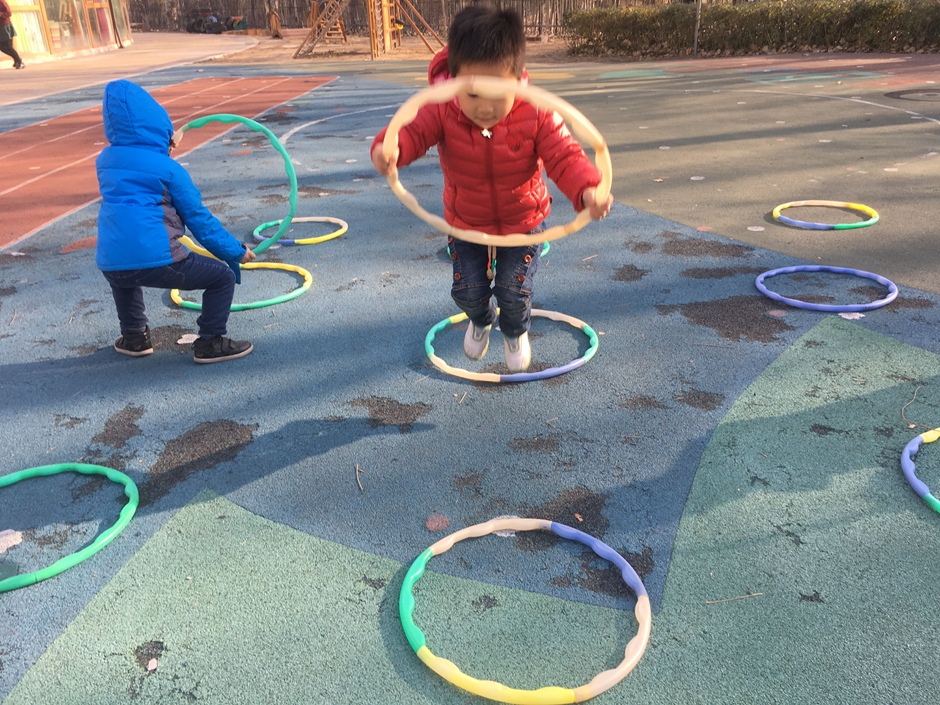 看我们自己玩的多开心啊,把它放到地上,大家一起跳,老师说数字“1”我们就跳进去,老师说“2”我们就跳出来。
