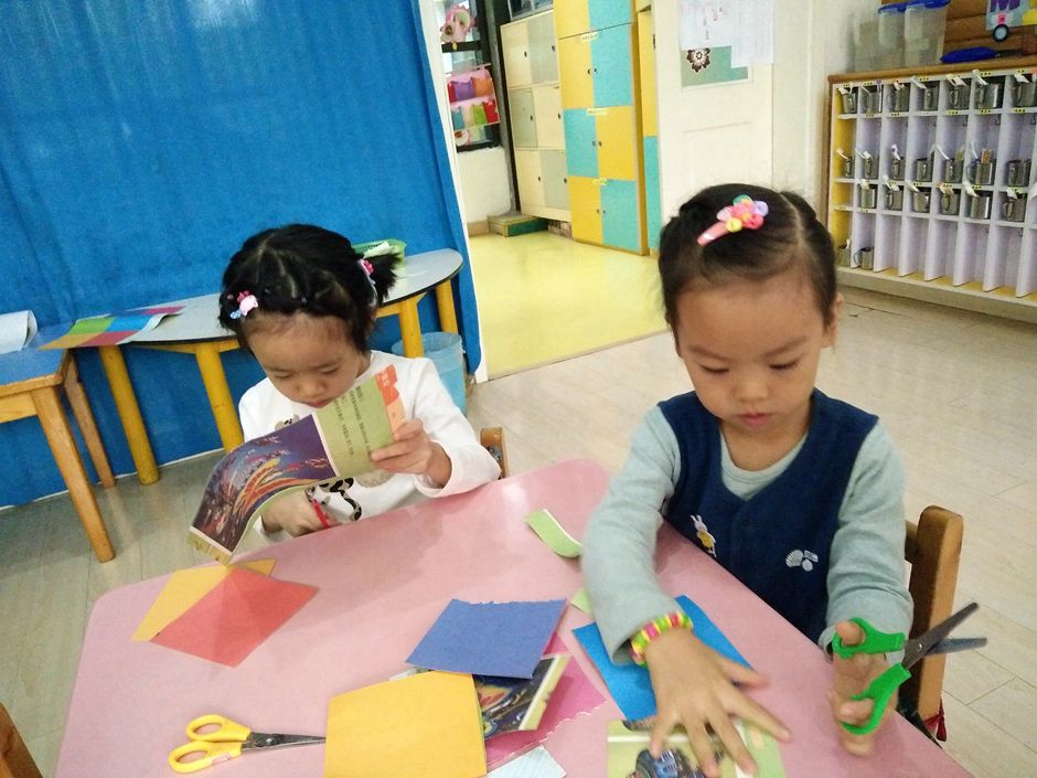 我们在很认真的为《空中舞会》做材料,要把各种的颜色减剪下来才可以