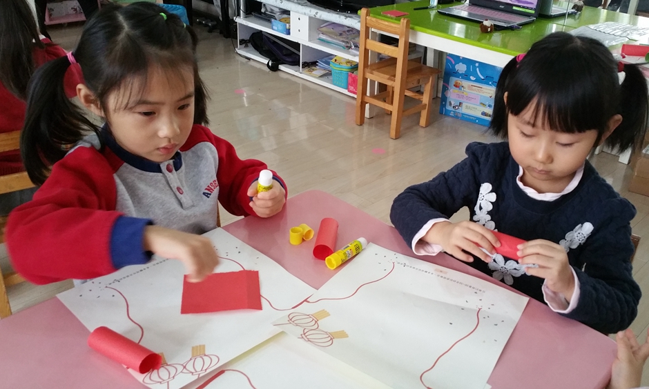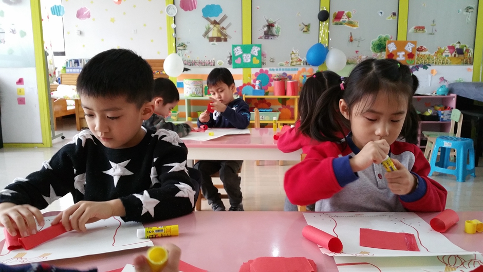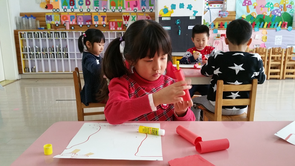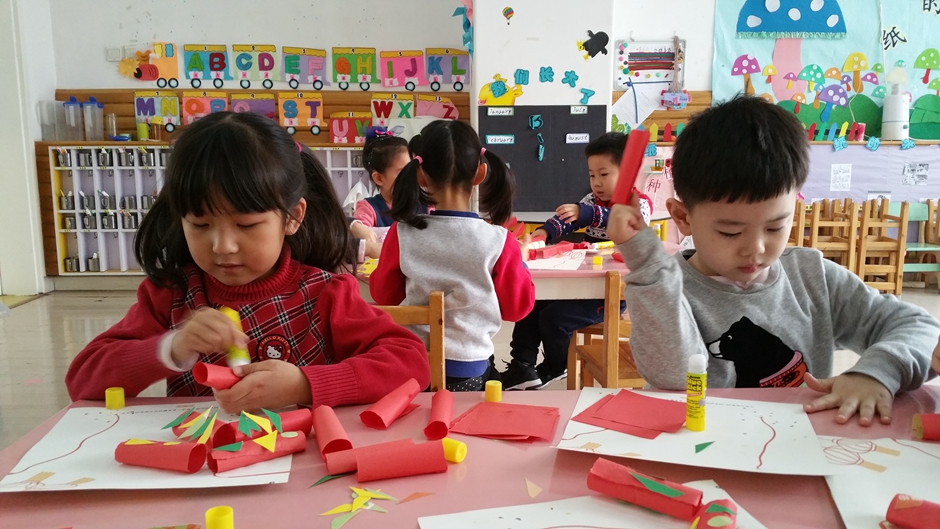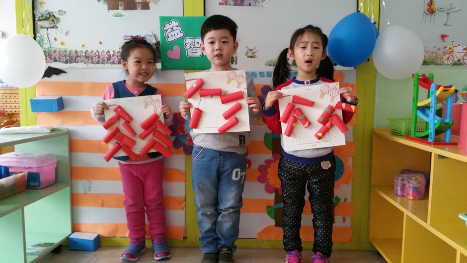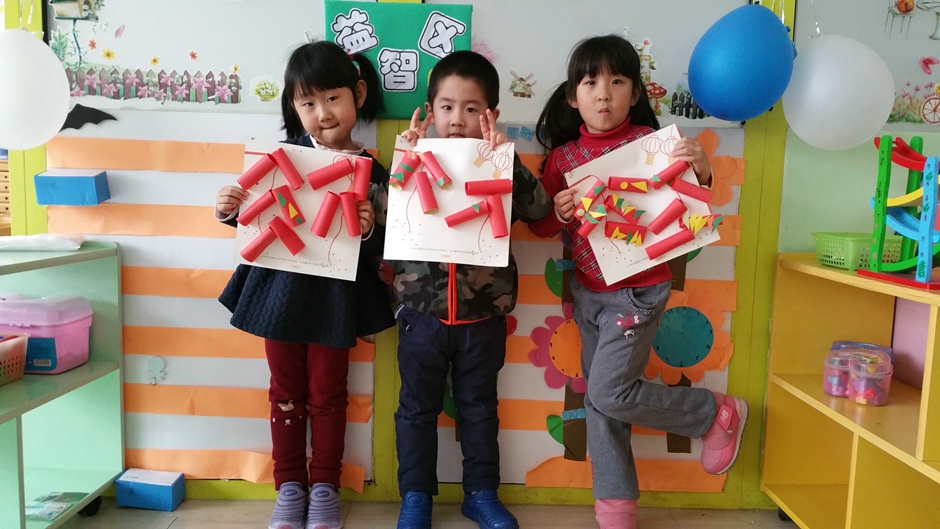 快要过年了,我们一起将活动室装饰一下吧,看!我们每位小朋友都来做一串鞭炮挂起来,让我们热热闹闹、红红火火过新年吧!