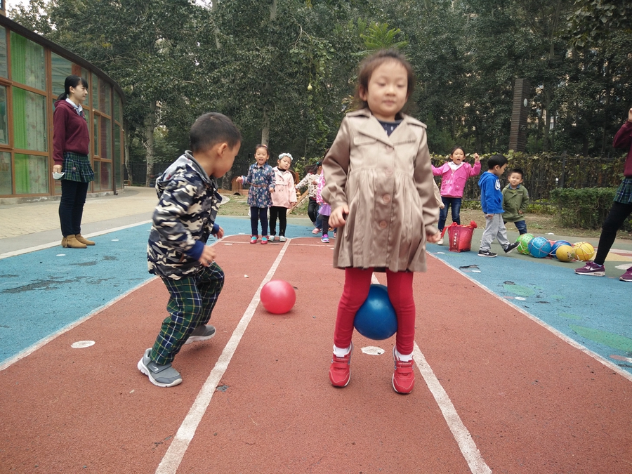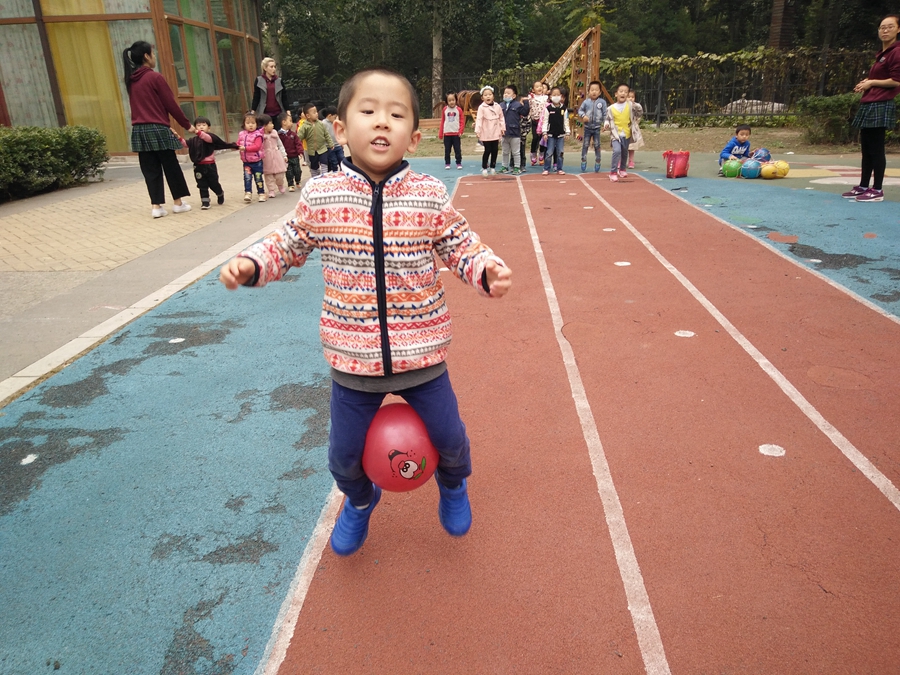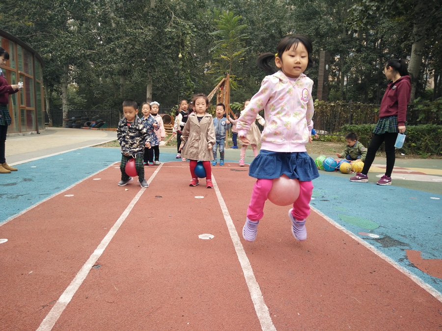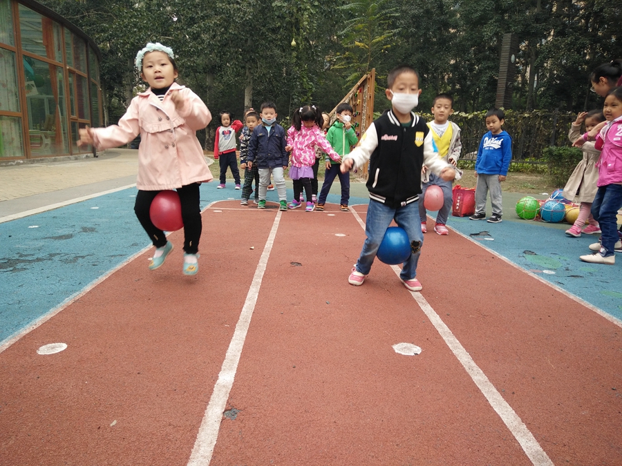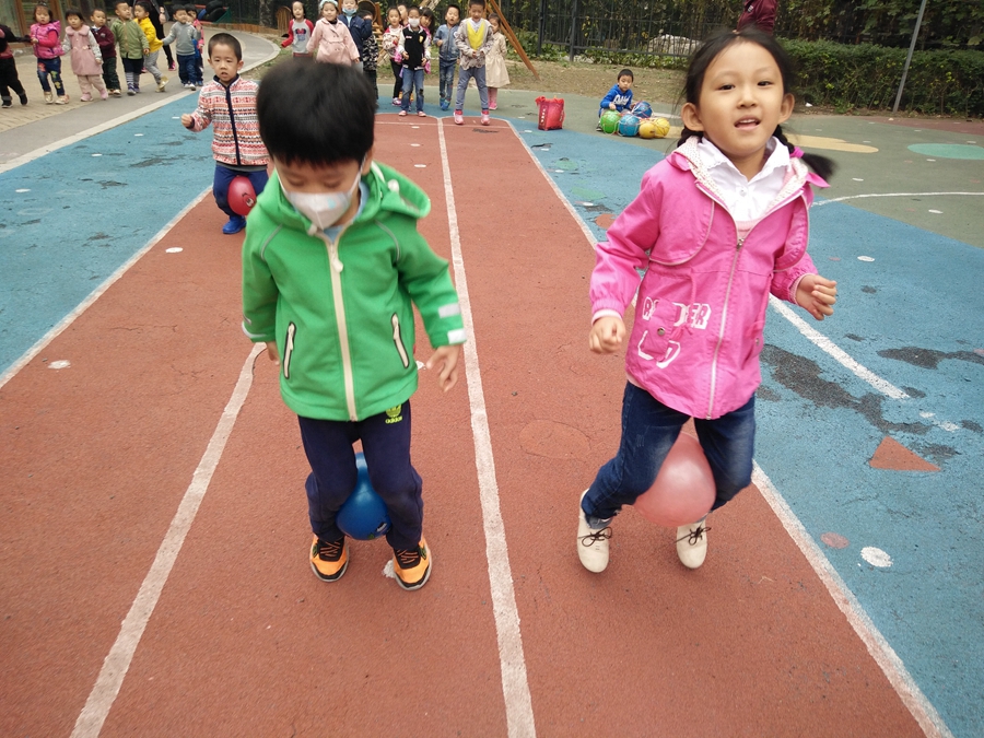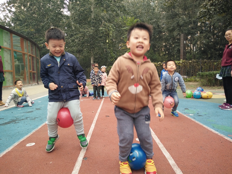 比赛开始了,我蹦我蹦,千万不要让球掉了,听见后面的小朋友为我加油呢,好开心啊