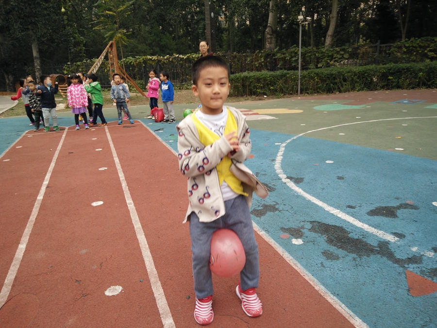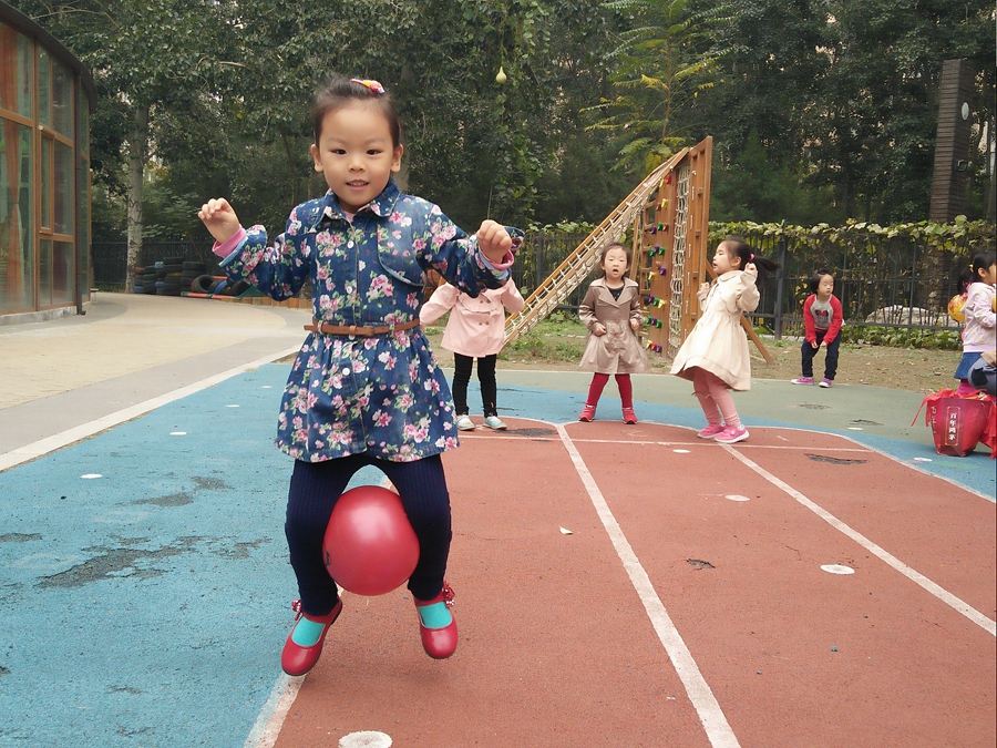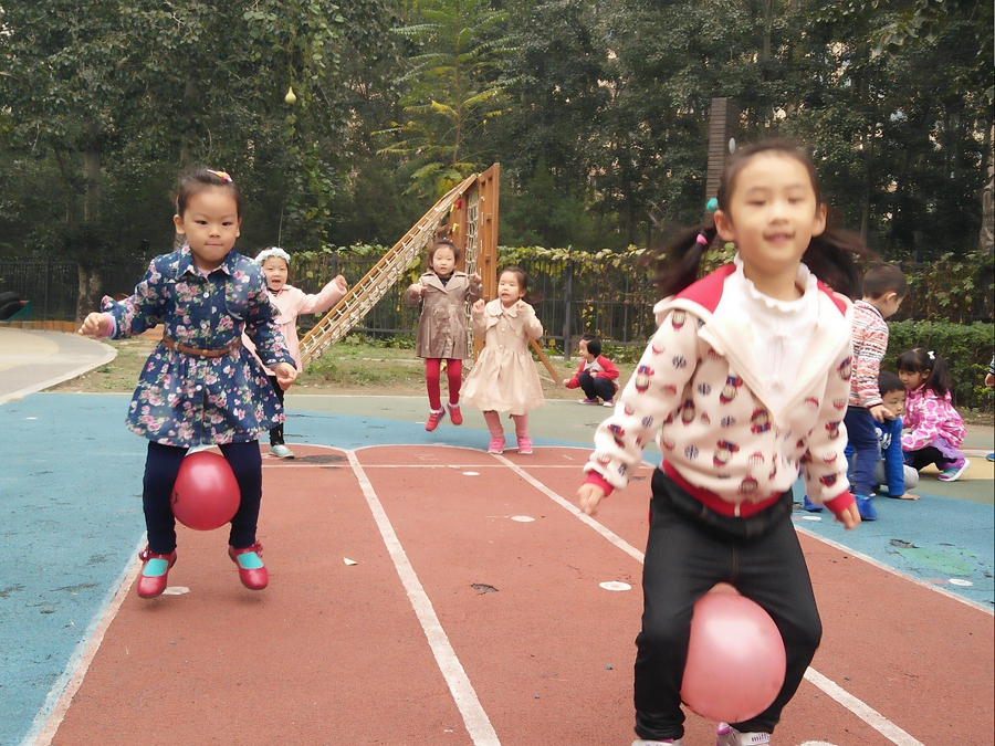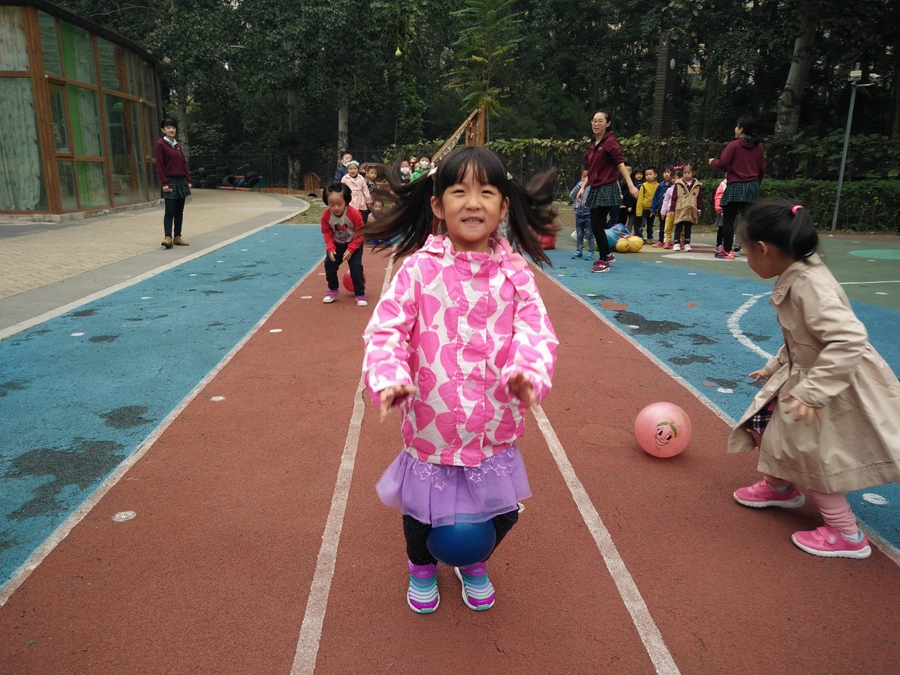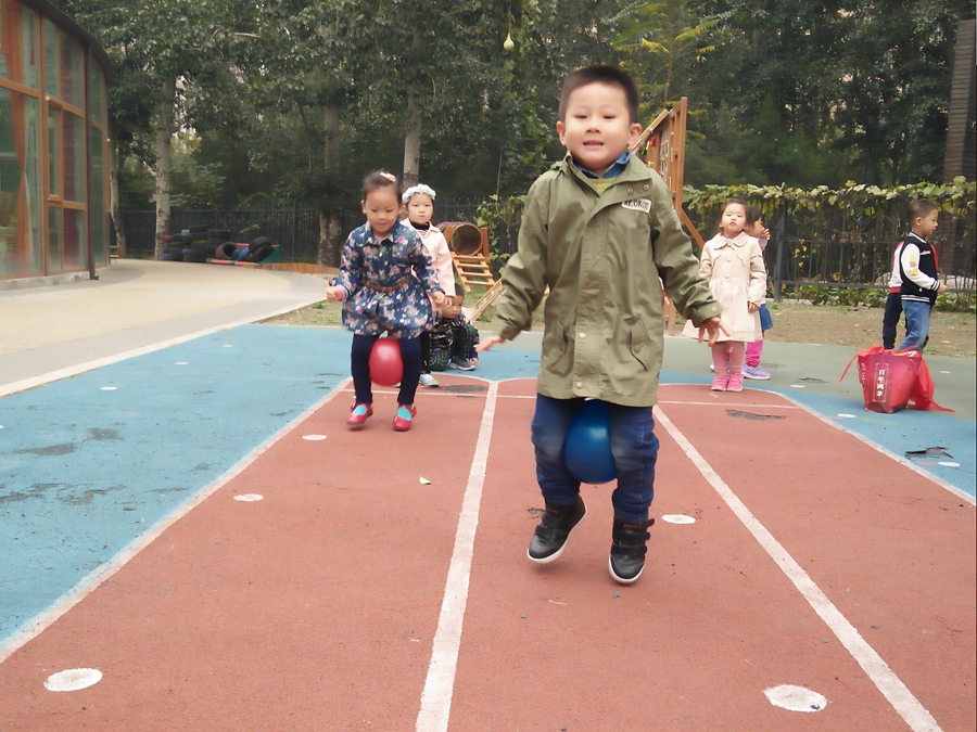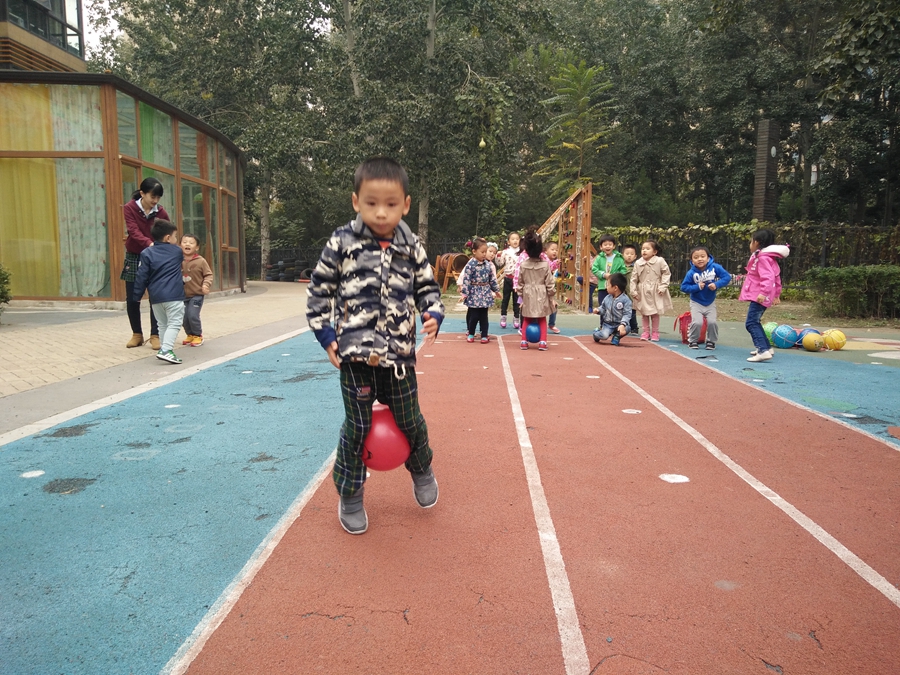 比赛开始了,我蹦我蹦,千万不要让球掉了,听见后面的小朋友为我加油呢,好开心啊