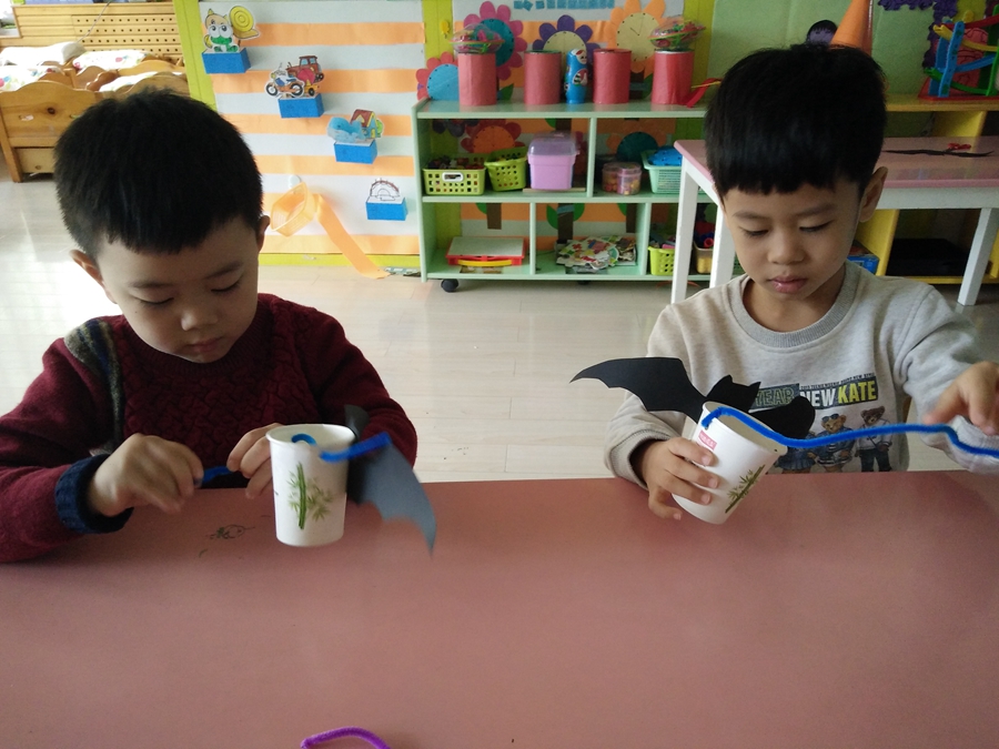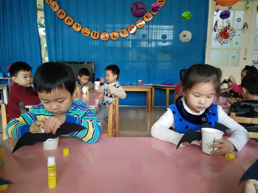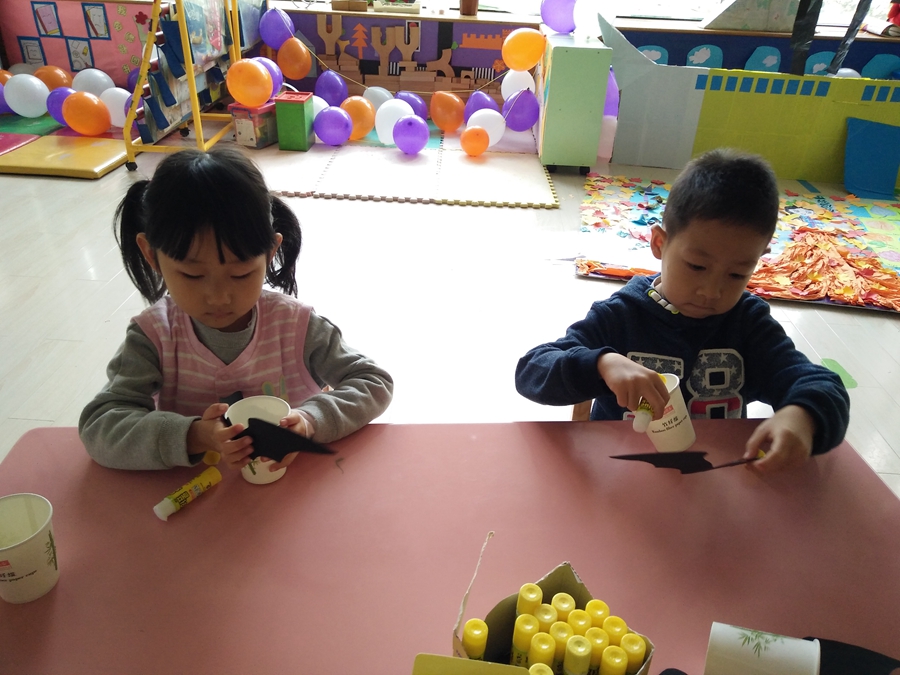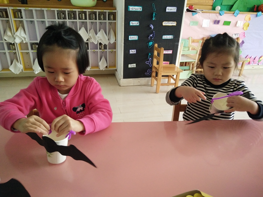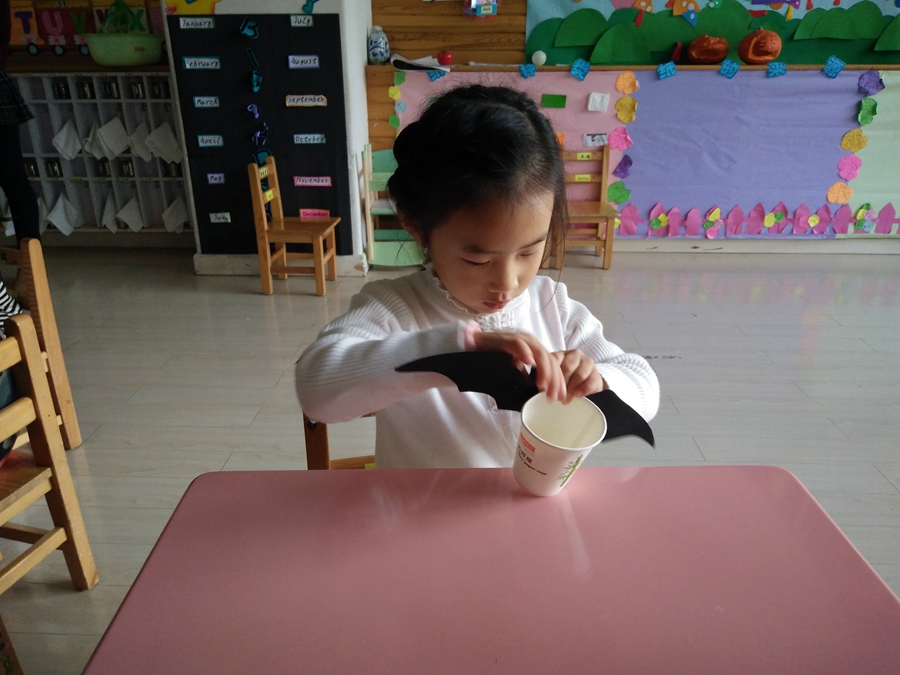 马上到万圣节了,一会赵老师带我们去要糖果,我得做一个装糖果的,给我的小杯子装饰上一个黑蝙蝠。