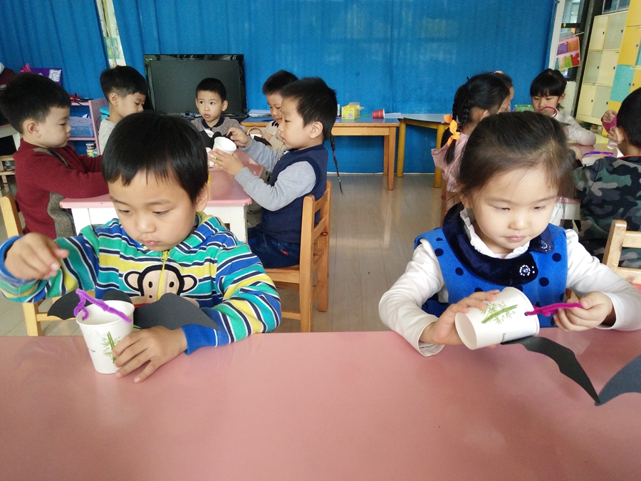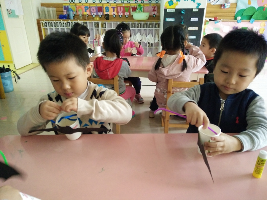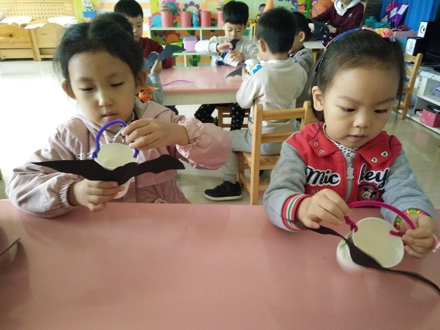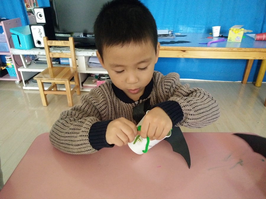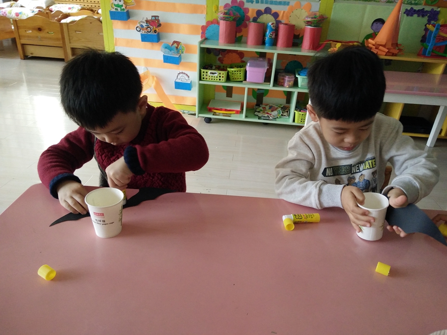 马上到万圣节了,一会赵老师带我们去要糖果,我得做一个装糖果的,给我的小杯子装饰上一个黑蝙蝠。