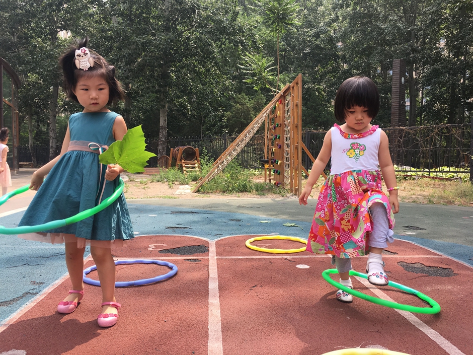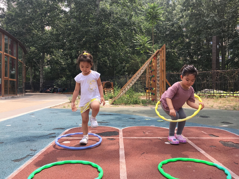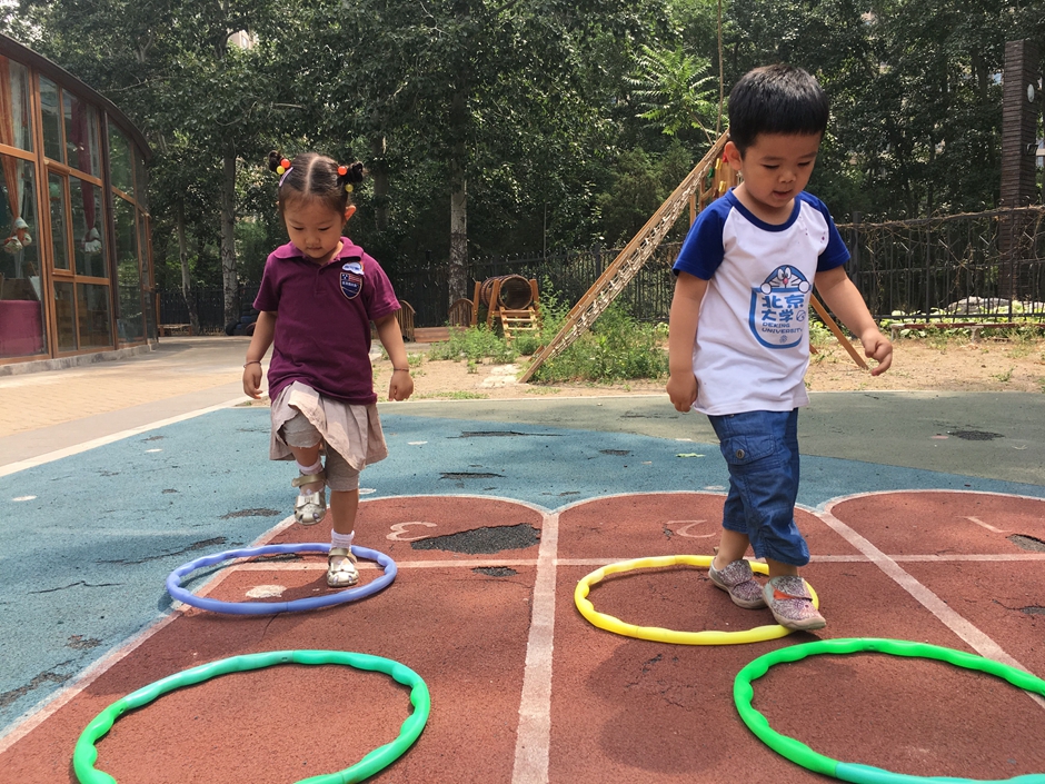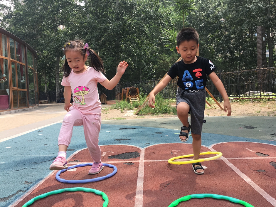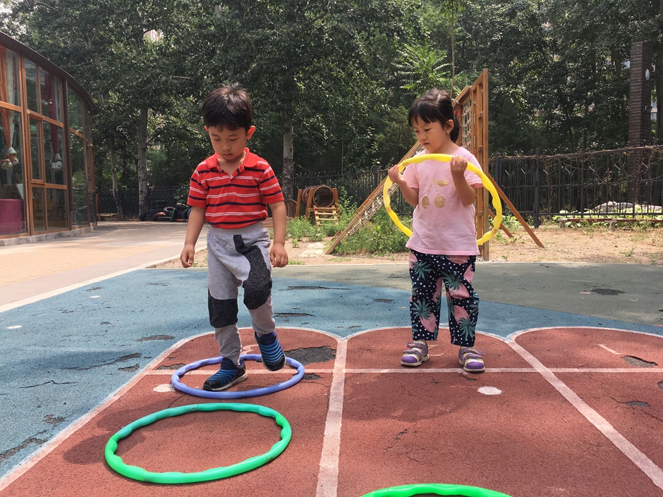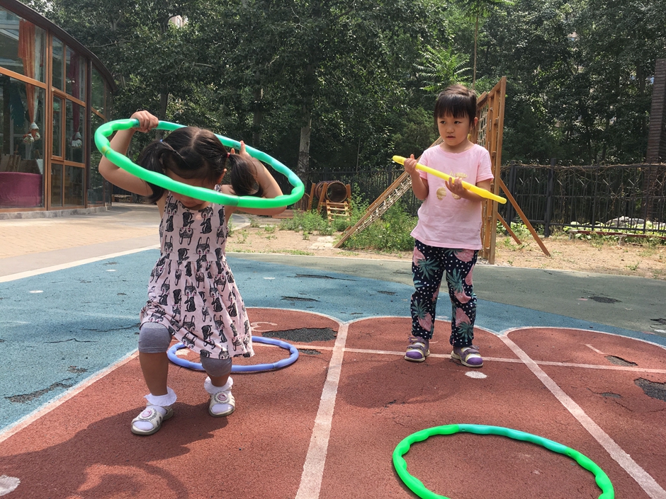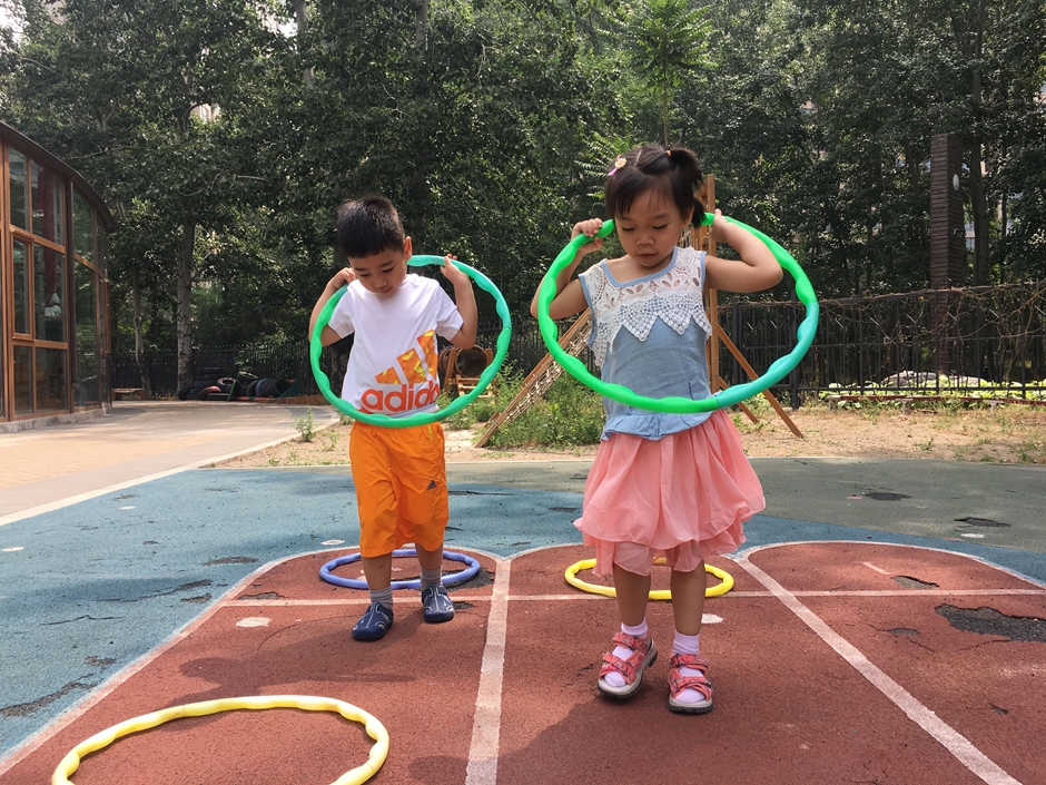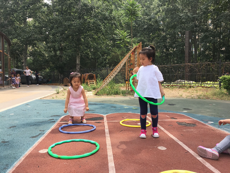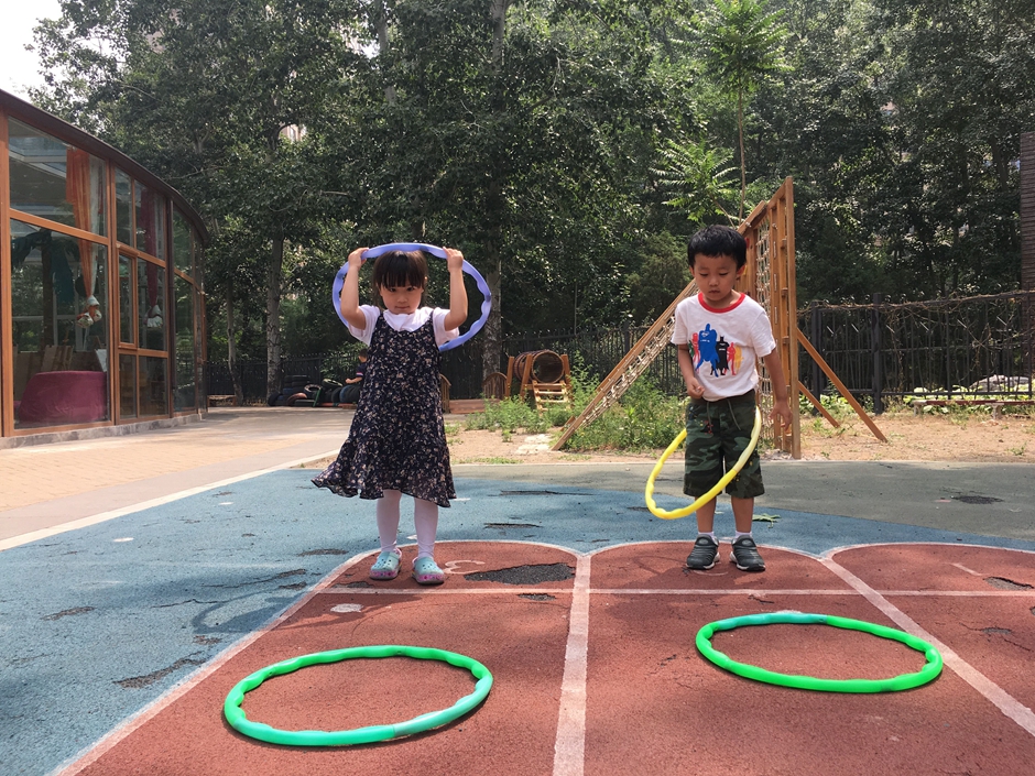 今天天气晴朗,小朋友们出来户外活动了,让我们来个套圈比赛吧,把每个圈都从头到脚套过去,看看我们多积极啊!