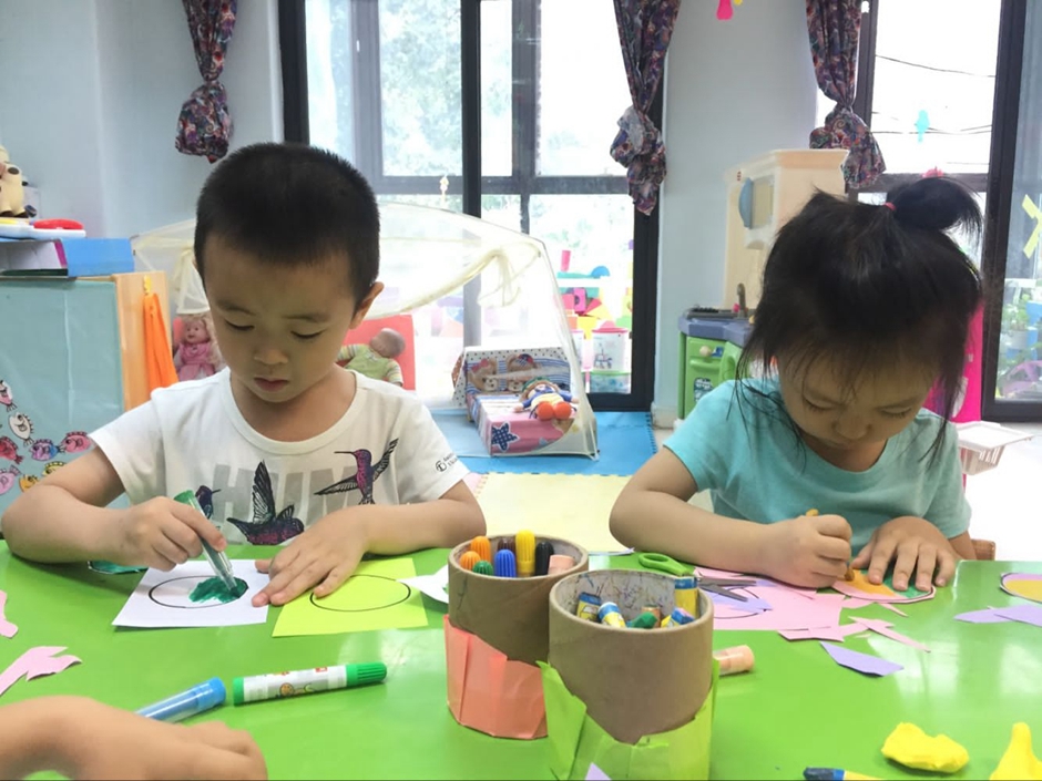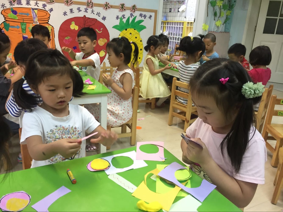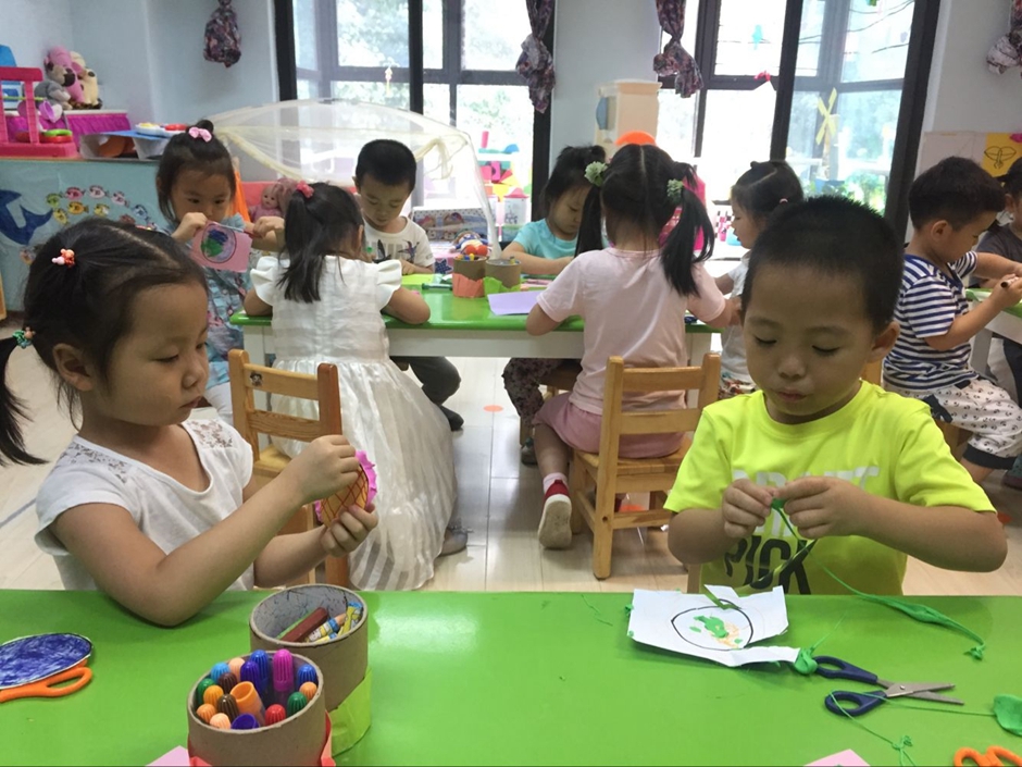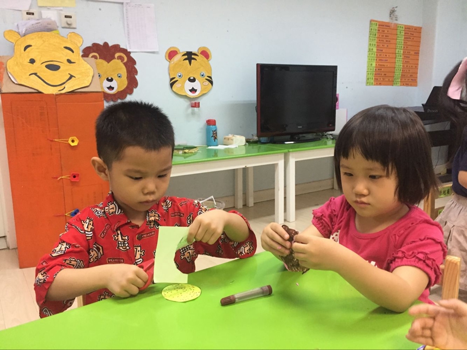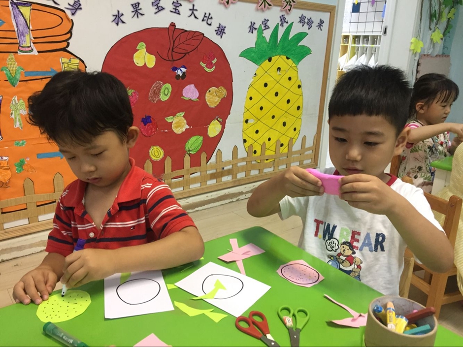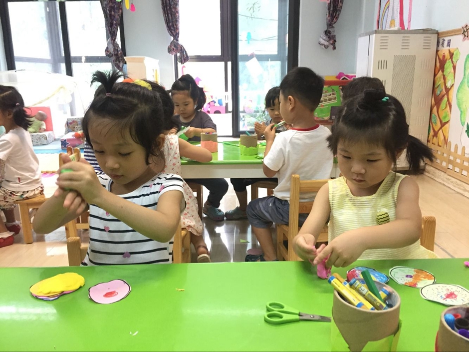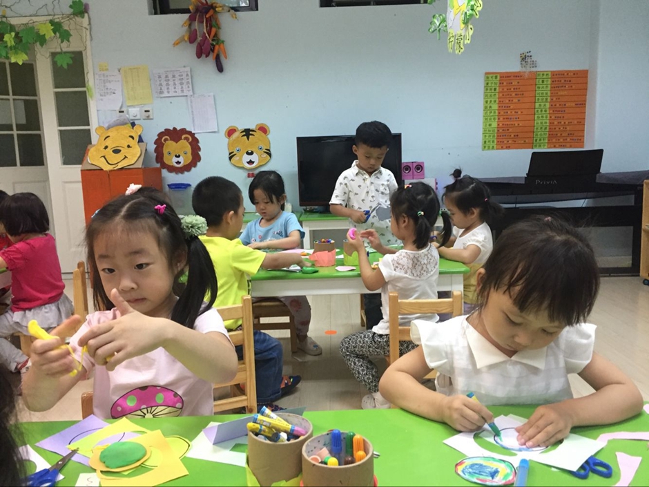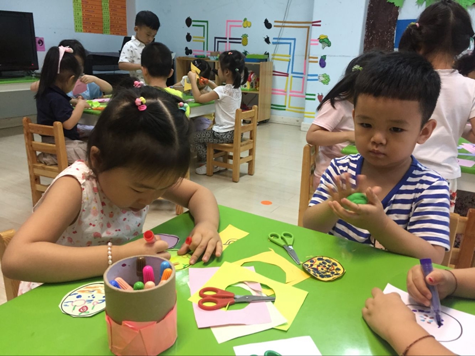 然后在第一层放上自己喜欢的“蔬菜”或“肉”,之后再剪下第二层的面包片抹好酱盖在上面,继续放上食物,这样多层健康而又有营养的汉堡包就做成了,看!我们小朋友做的多认真啊。