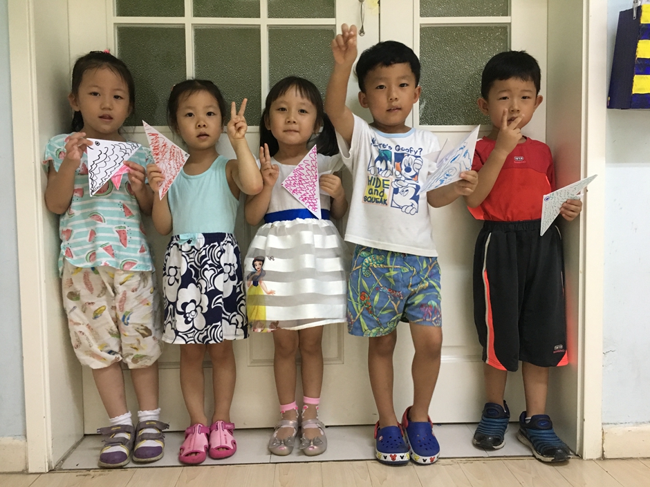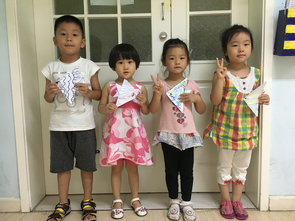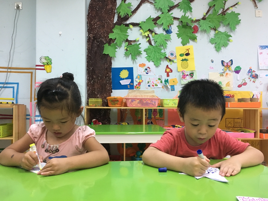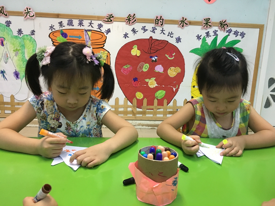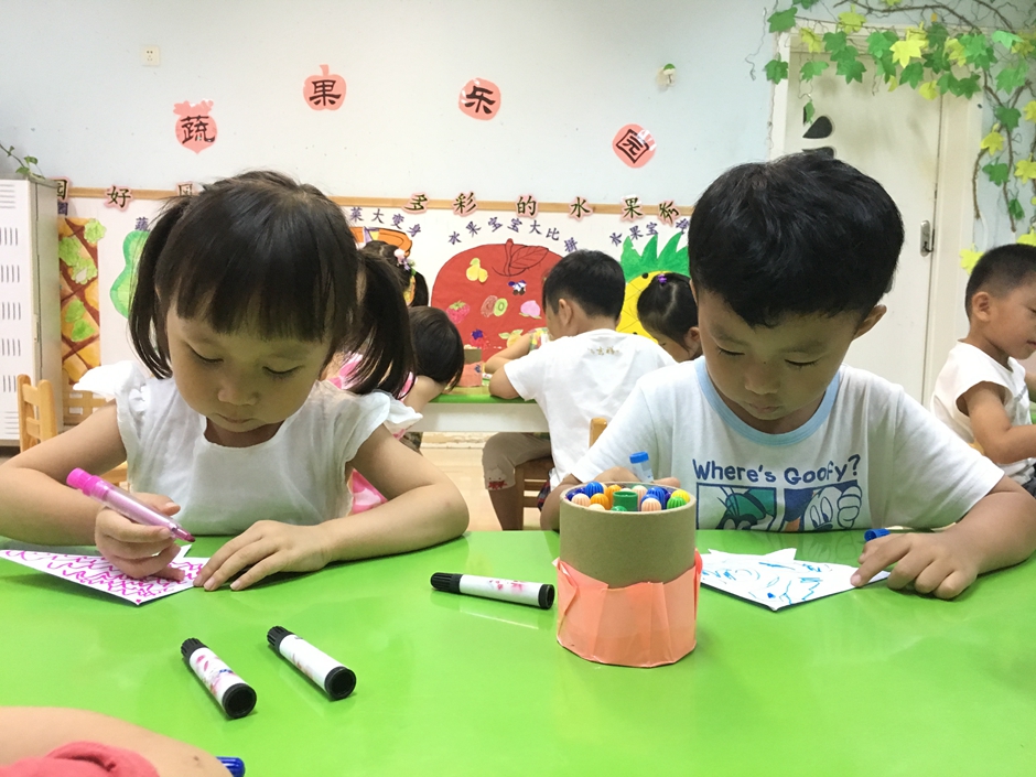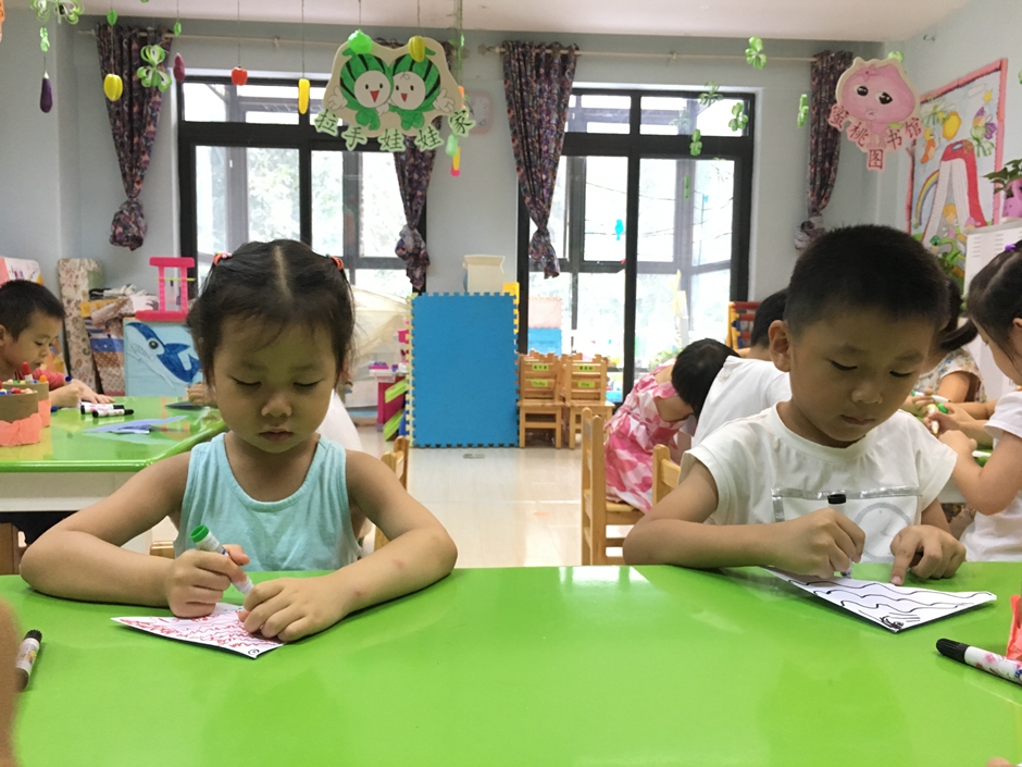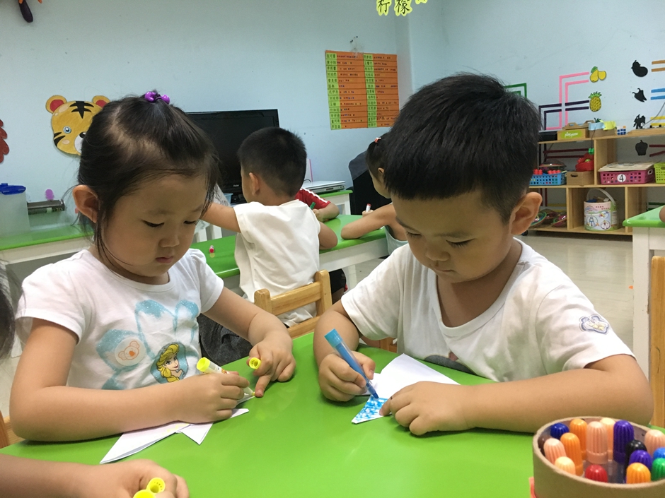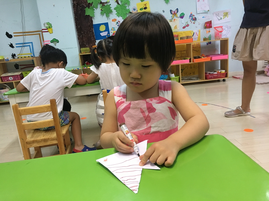 小鱼折好了,现在要给它穿上漂亮的衣服,每个小朋友都有自己的想法,画着自己喜欢的花纹,看他们多么认真啊!