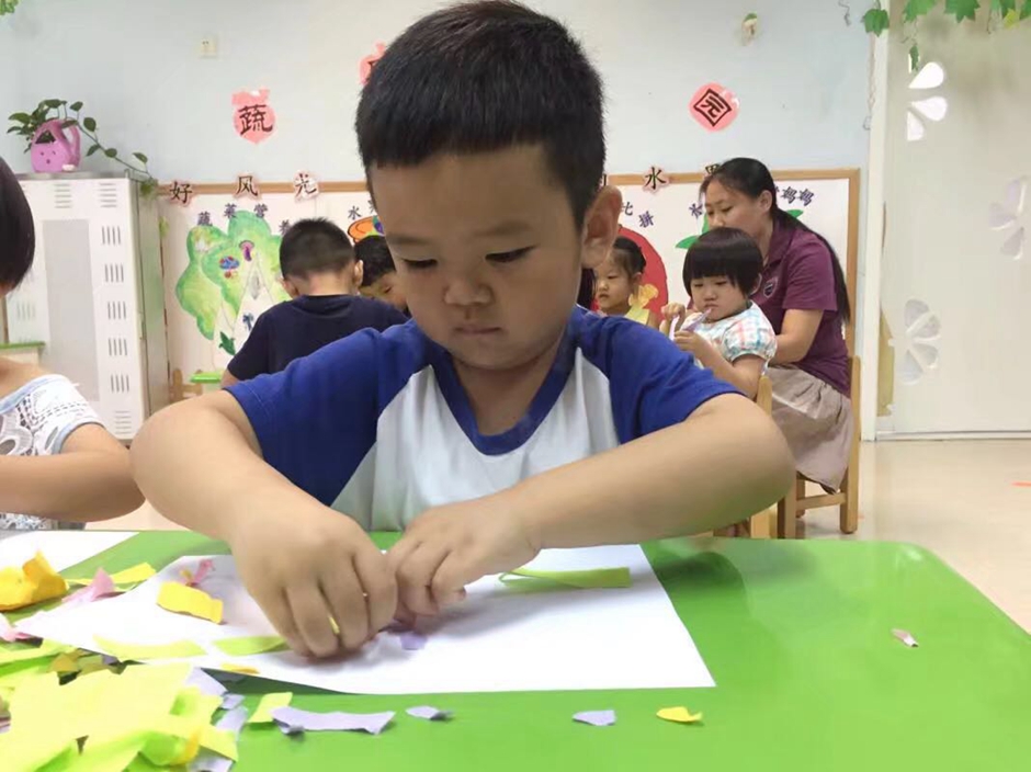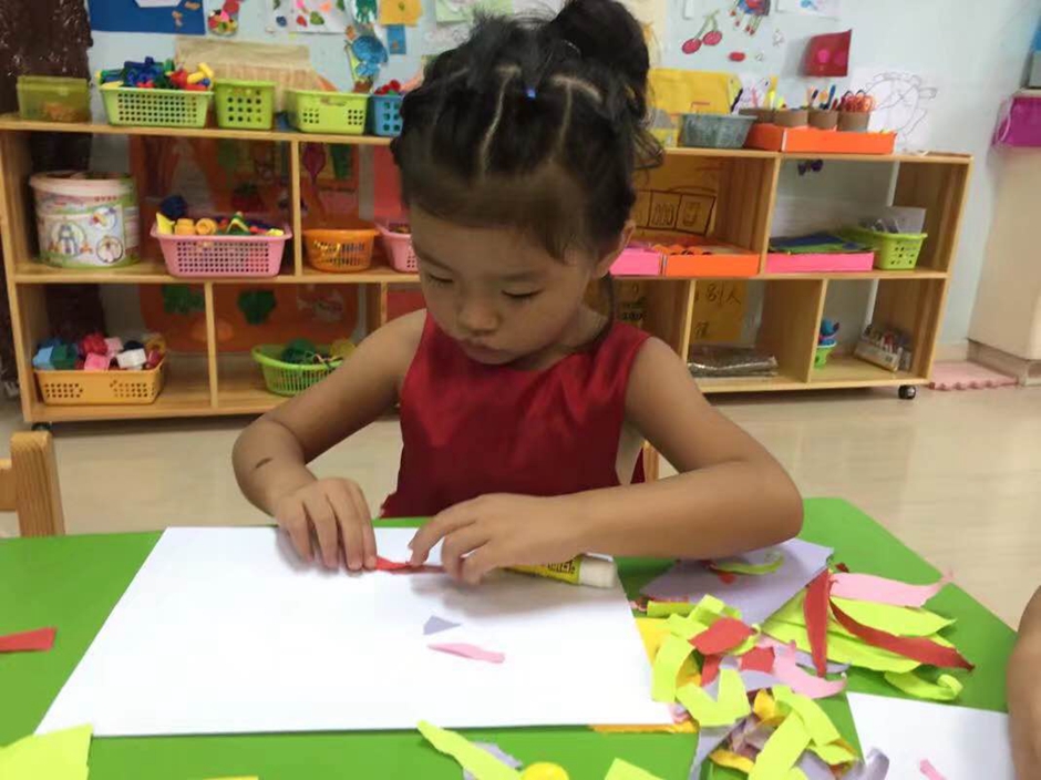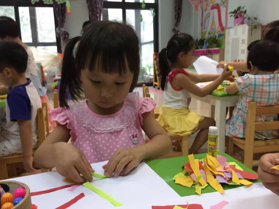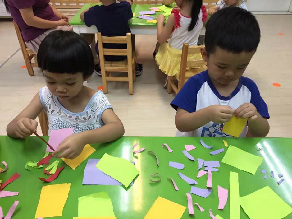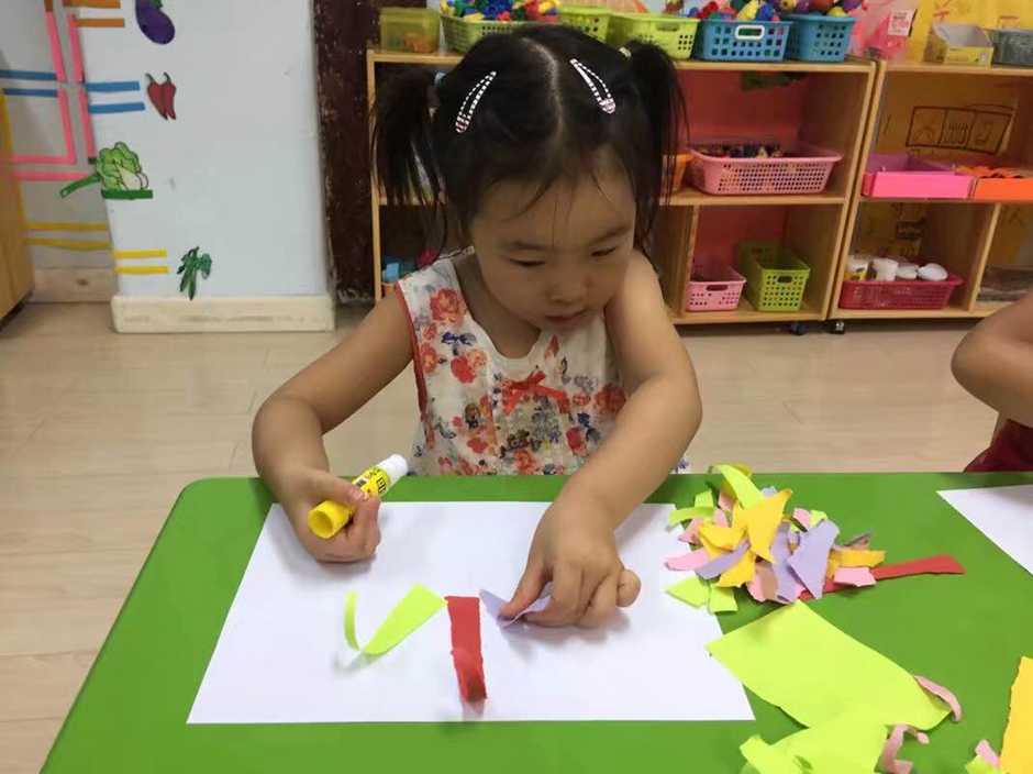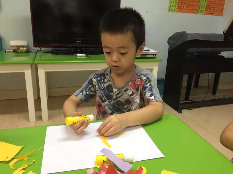现在开始用胶棒把长条有序的粘起来,让它保留在礼花绽放的漂亮瞬间,看小朋友们做的多认真啊!
