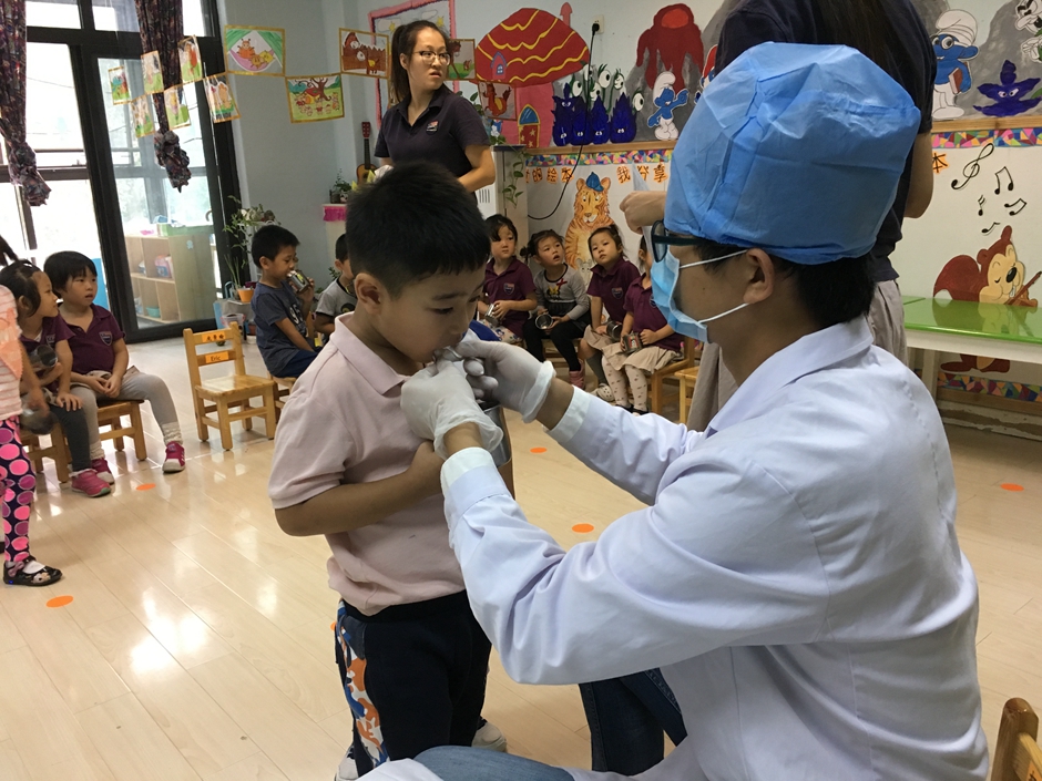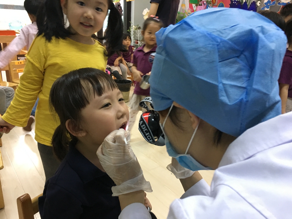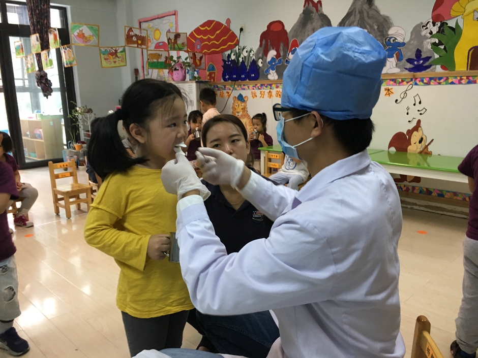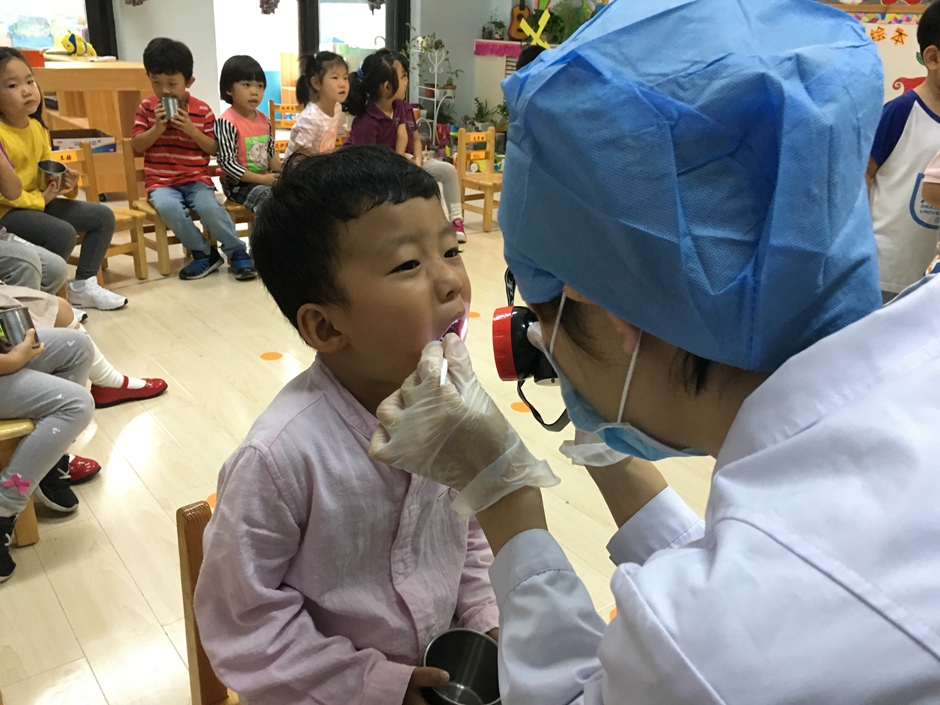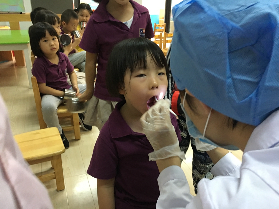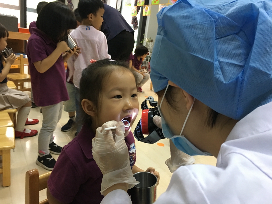 今天外面的叔叔阿姨们来给我们做涂氟啦,为的是能更好的保护我们的小牙齿,现在是检查牙齿,看看牙齿们的情况。