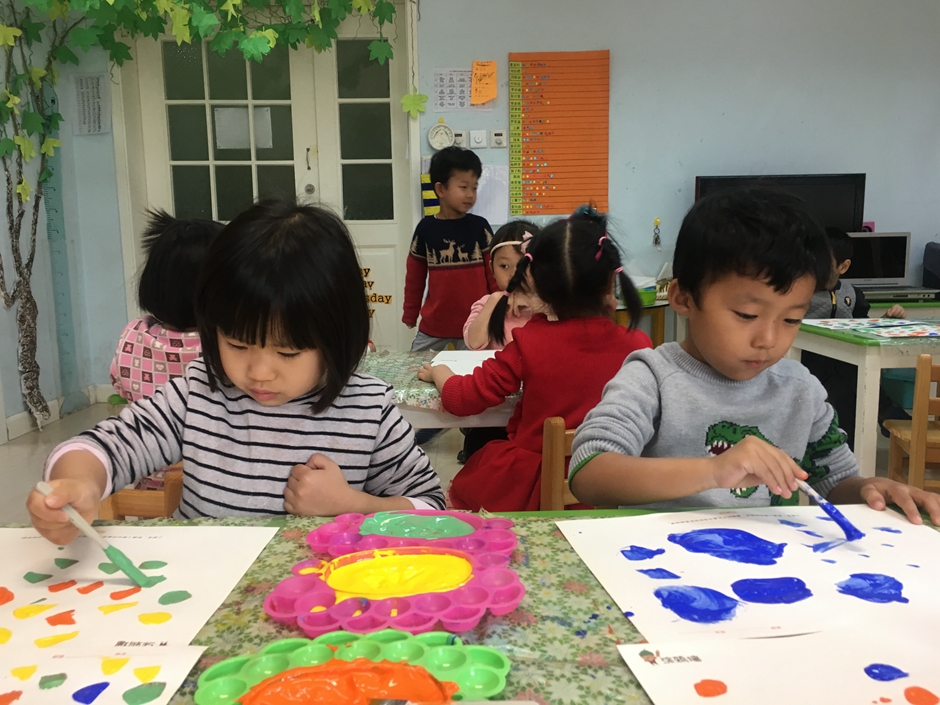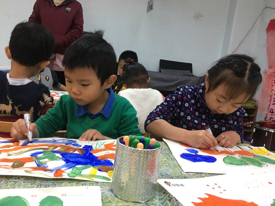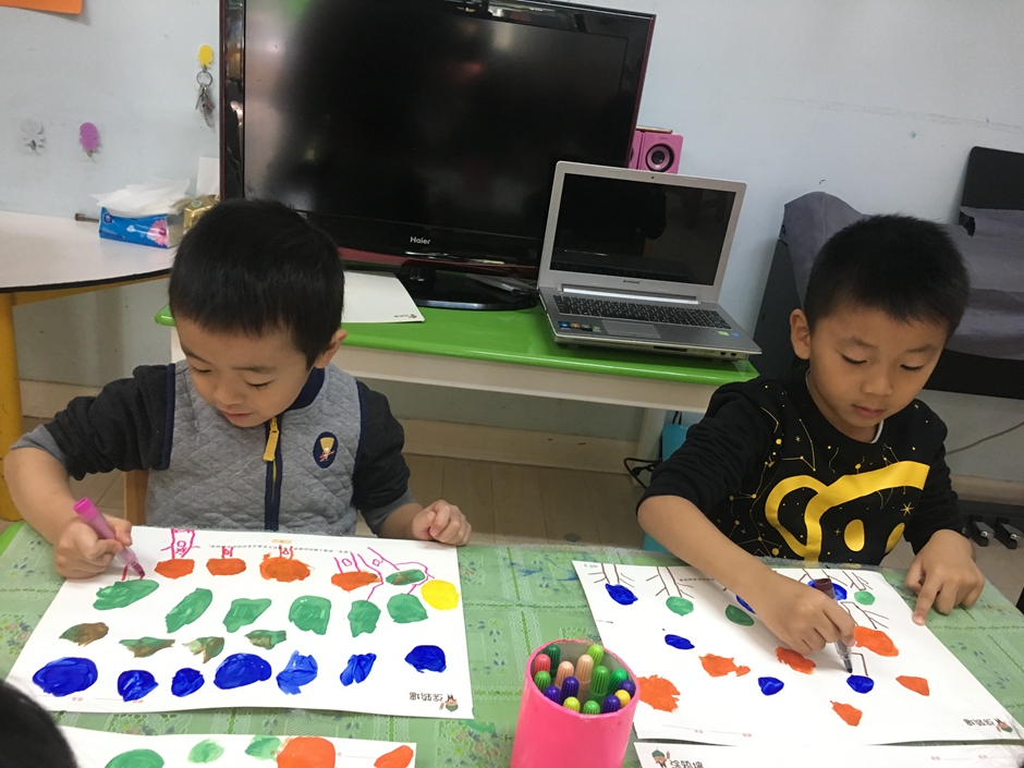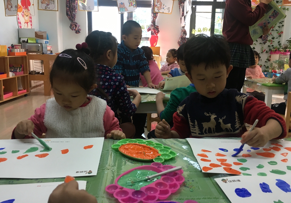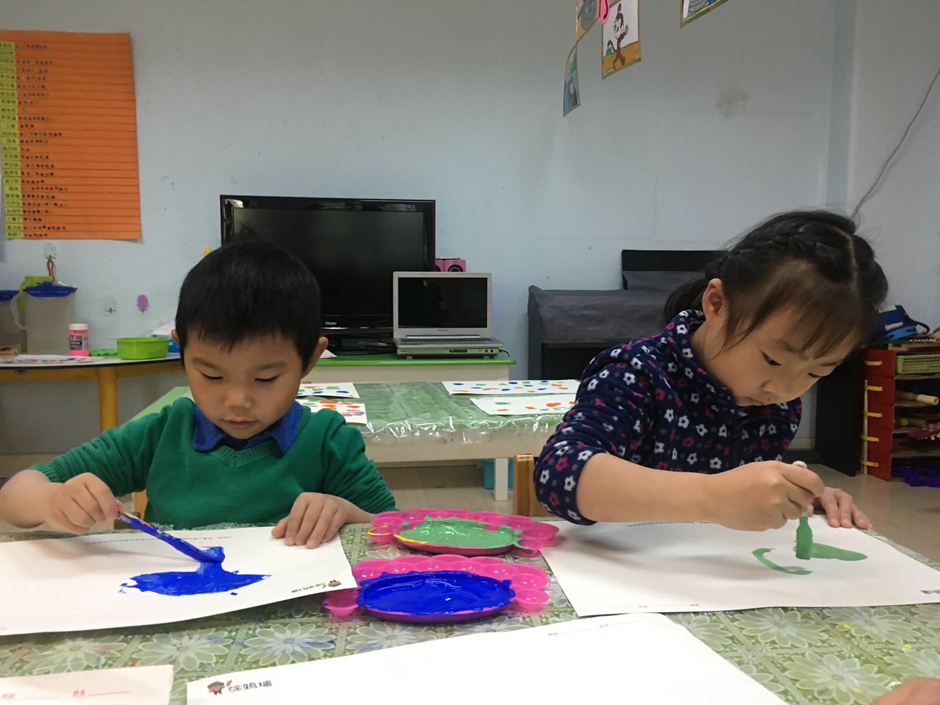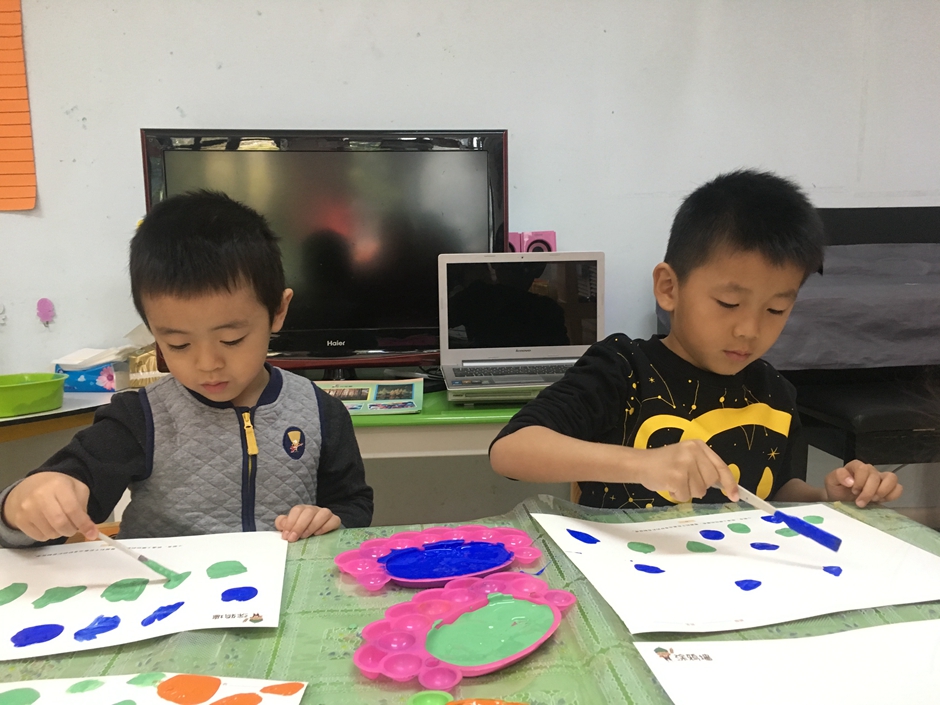 今天我们是美术活动----森林,小朋友们正在用颜料画树呢,看他们画的多认真啊!