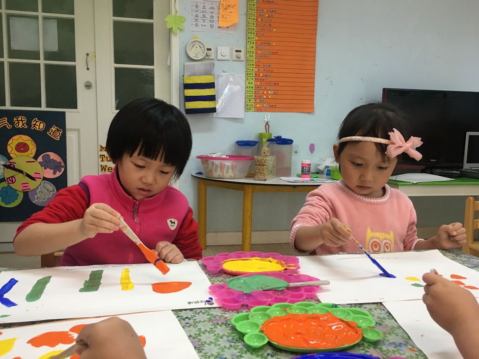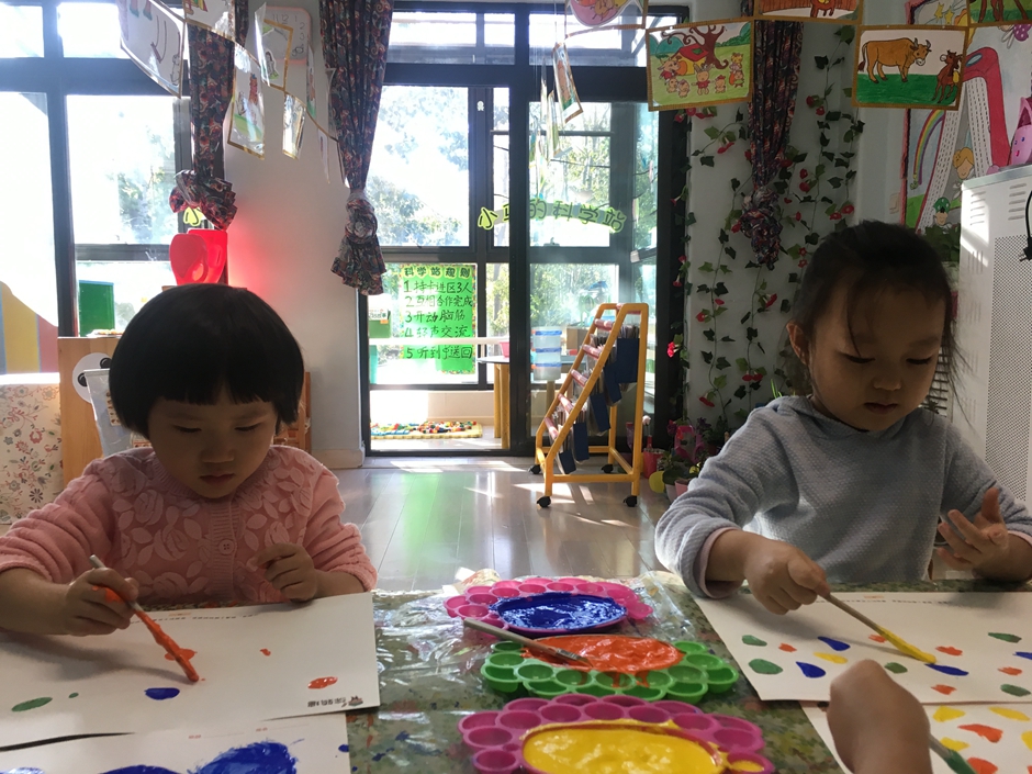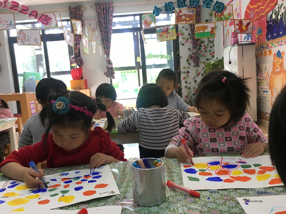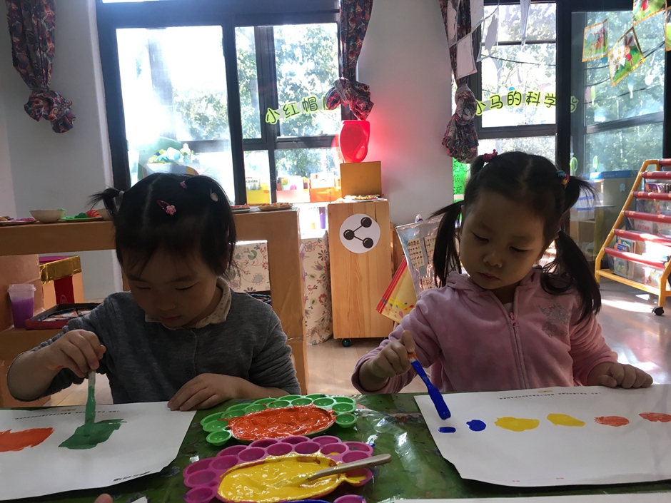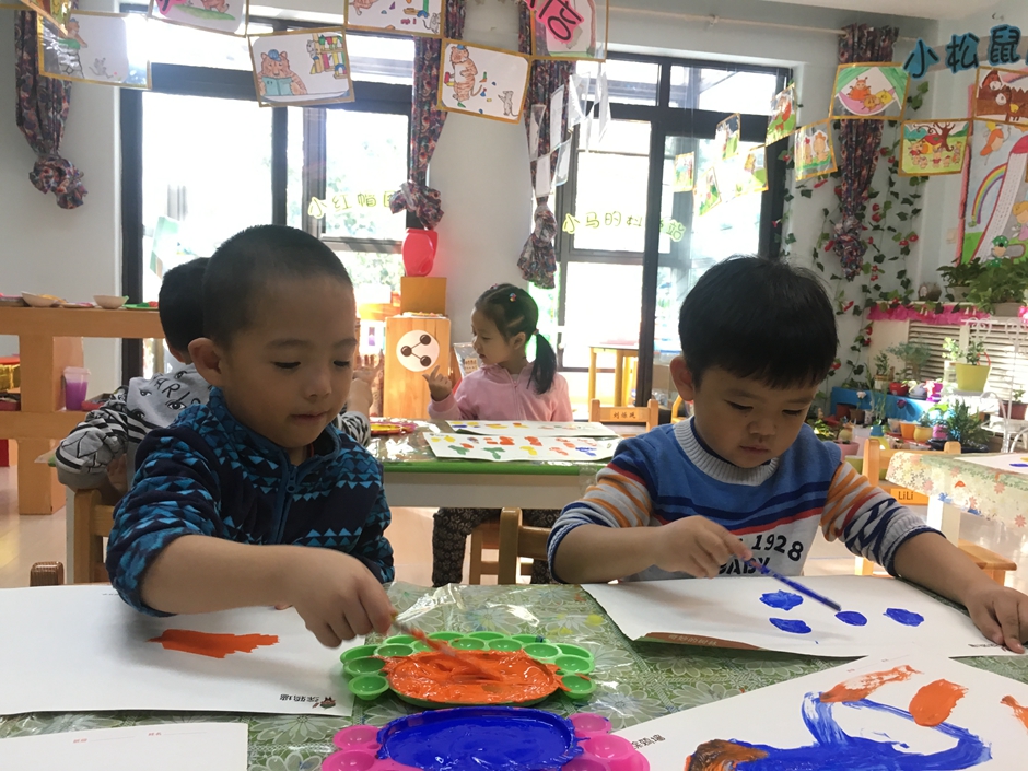 今天我们是美术活动----森林,小朋友们正在用颜料画树呢,看他们画的多认真啊!