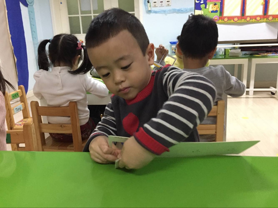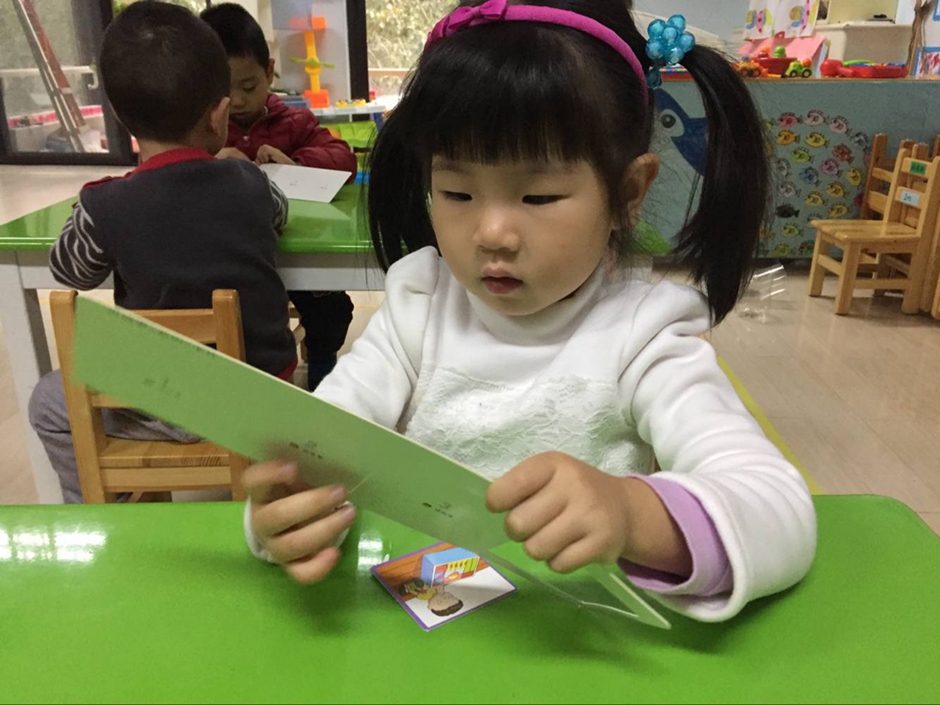孩子们认真努力地抠下小卡片,正在将卡片按照故事顺序摆放好呢!