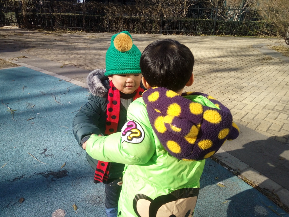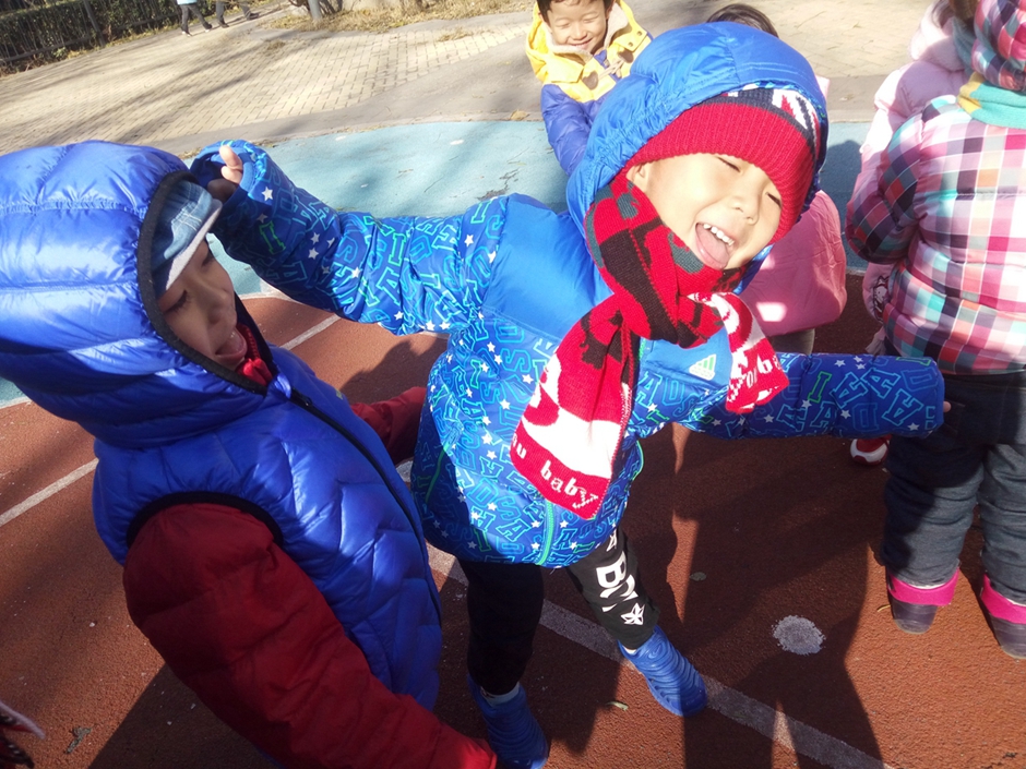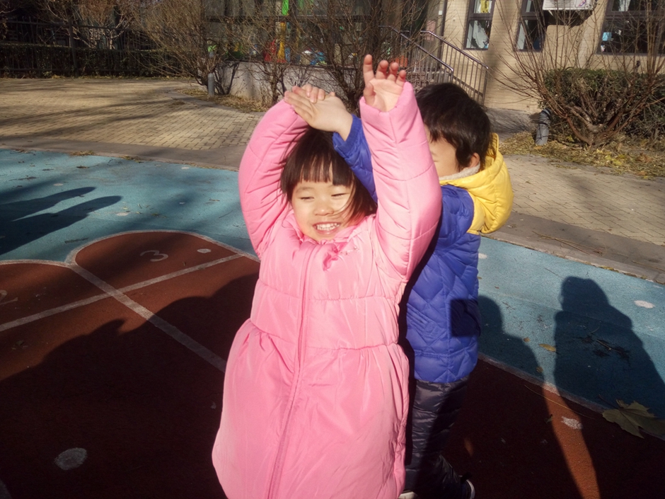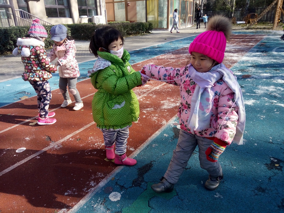 这是今年的第一场雪,初雪过后地上有了小小的冰碴,孩子们就在此翩翩起舞了!