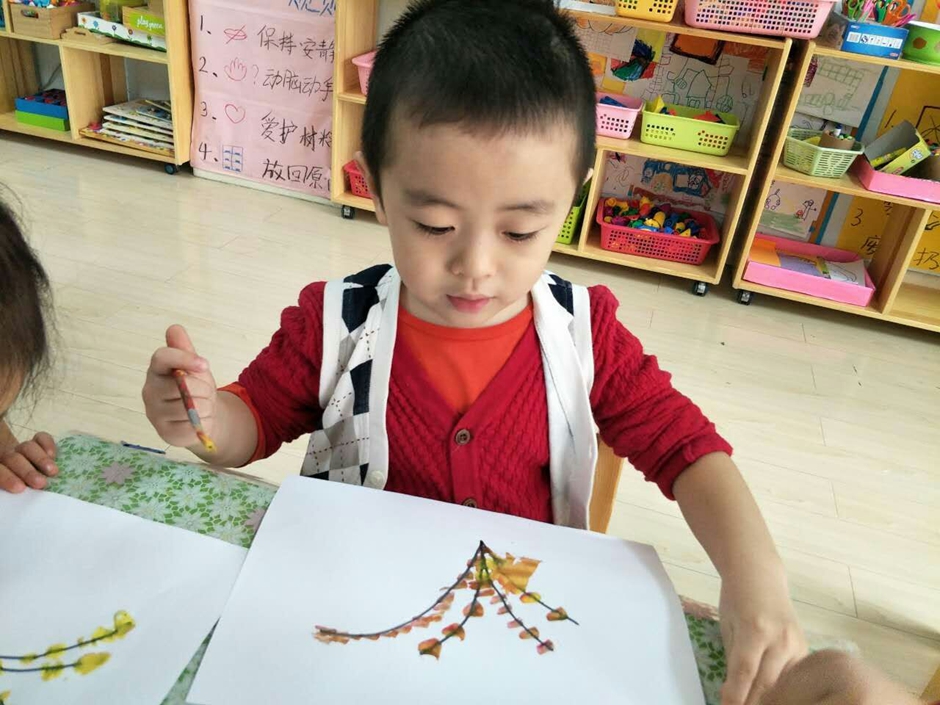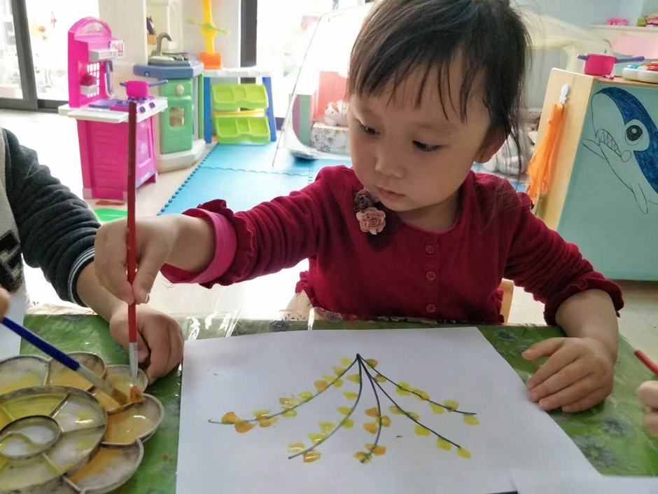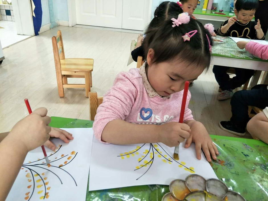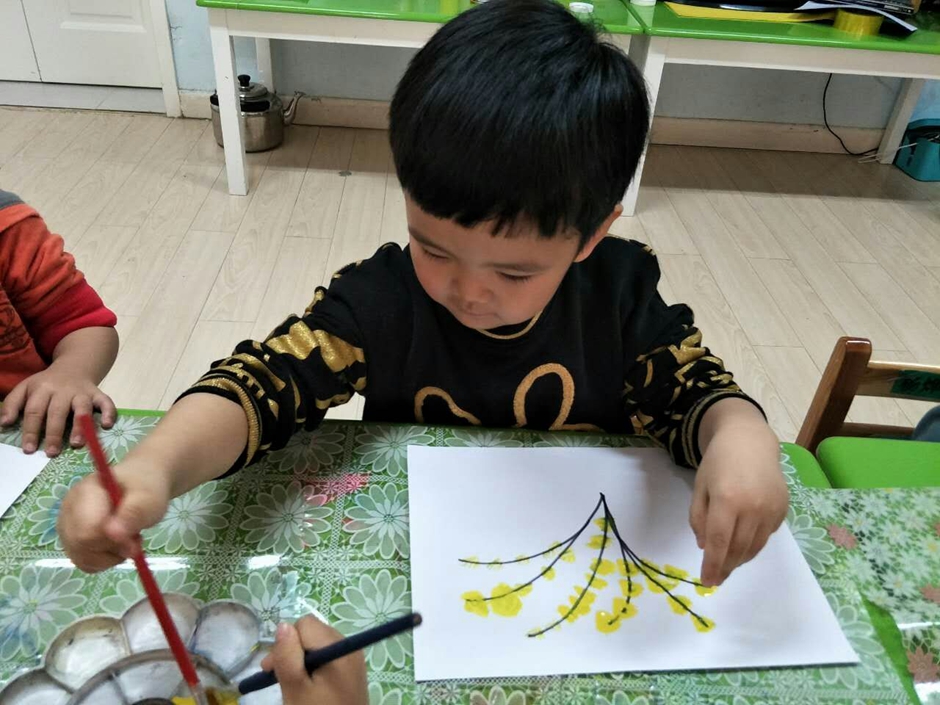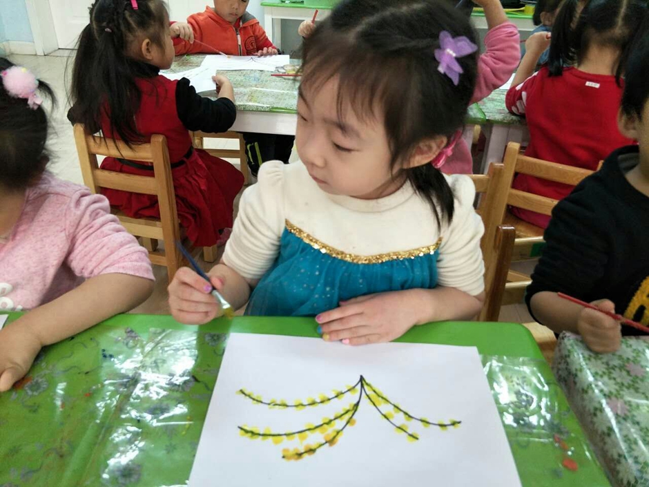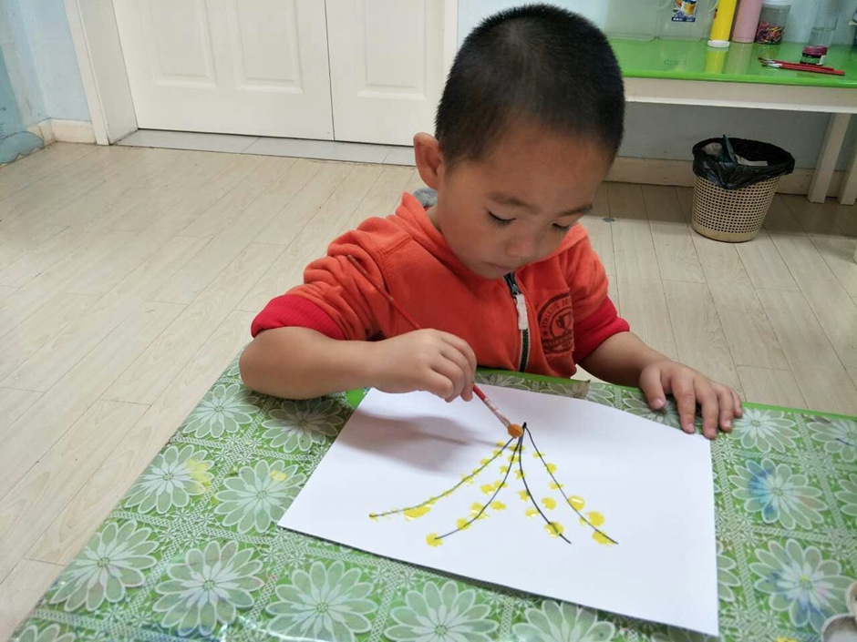 孩子们每人一只颜料笔,蘸着颜料盘里黄灿灿的颜料,正在创作一幅好风景!