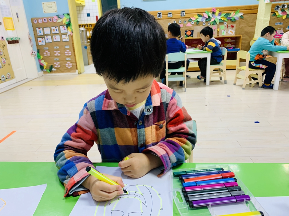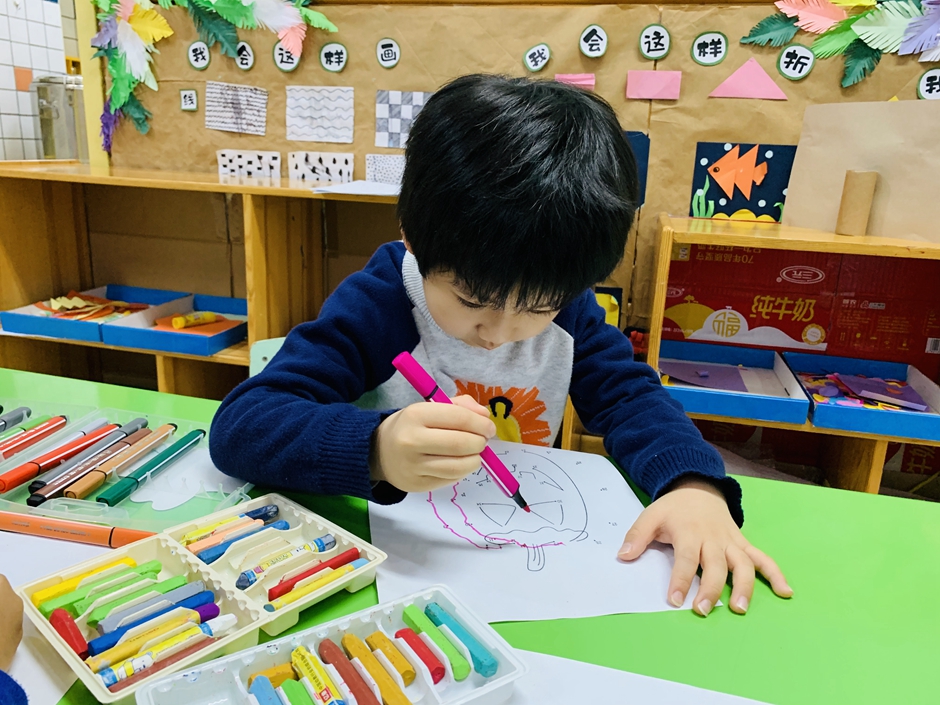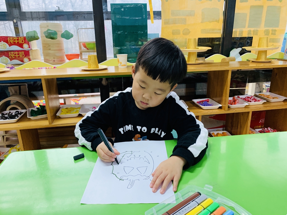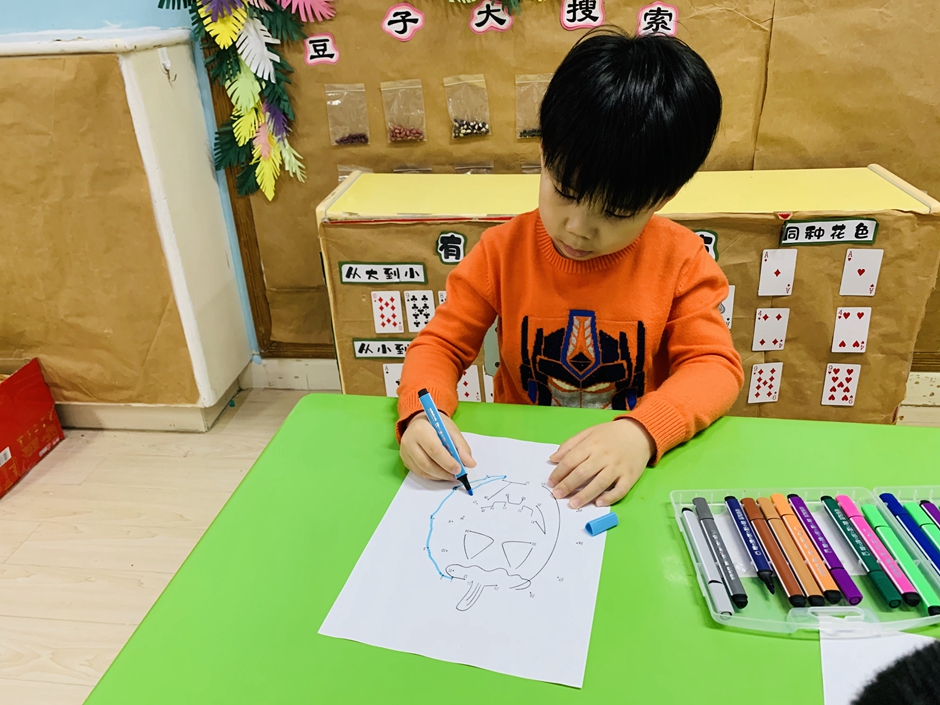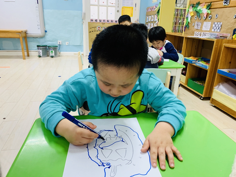 开学第一天,小朋友们回归幼儿园生活,上课时间小朋友们认真的做着,今天的南瓜是锻炼小朋友们的专注力,通过动手和眼睛观察使自己静下心来。每个人都在认真的连线。