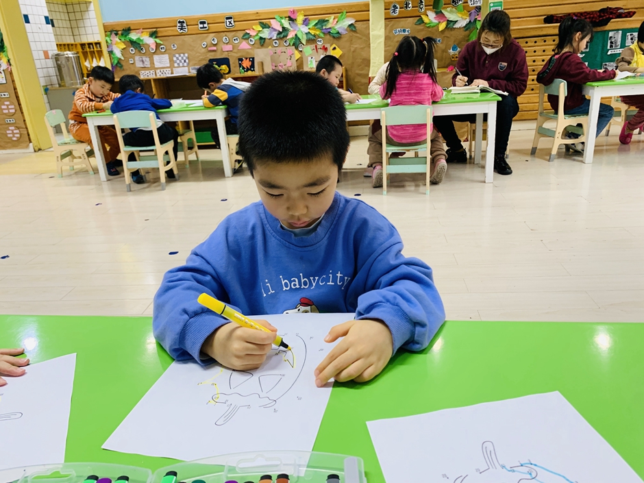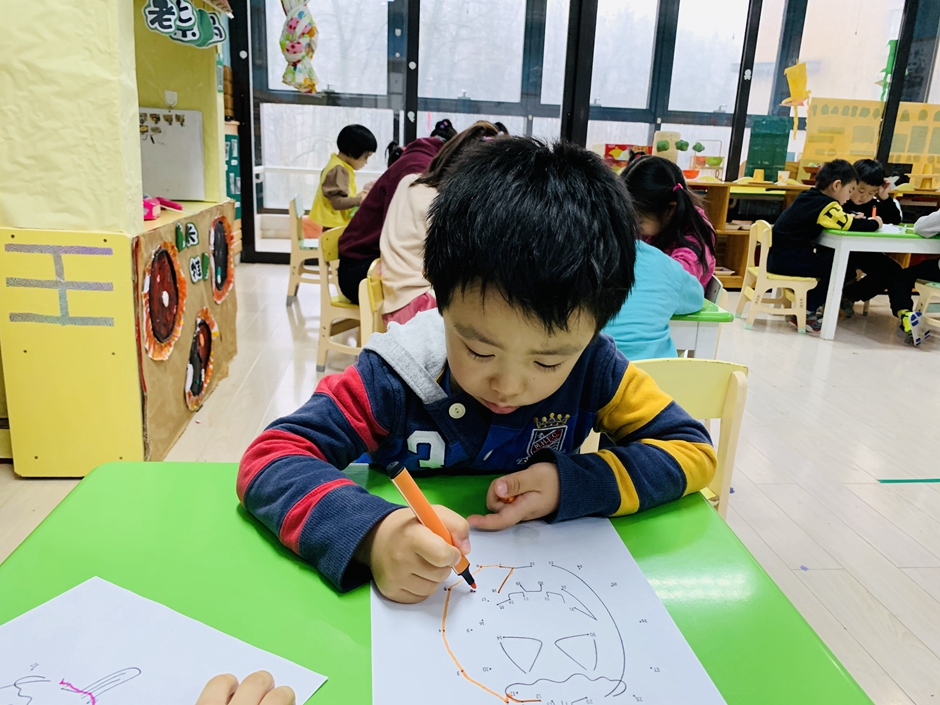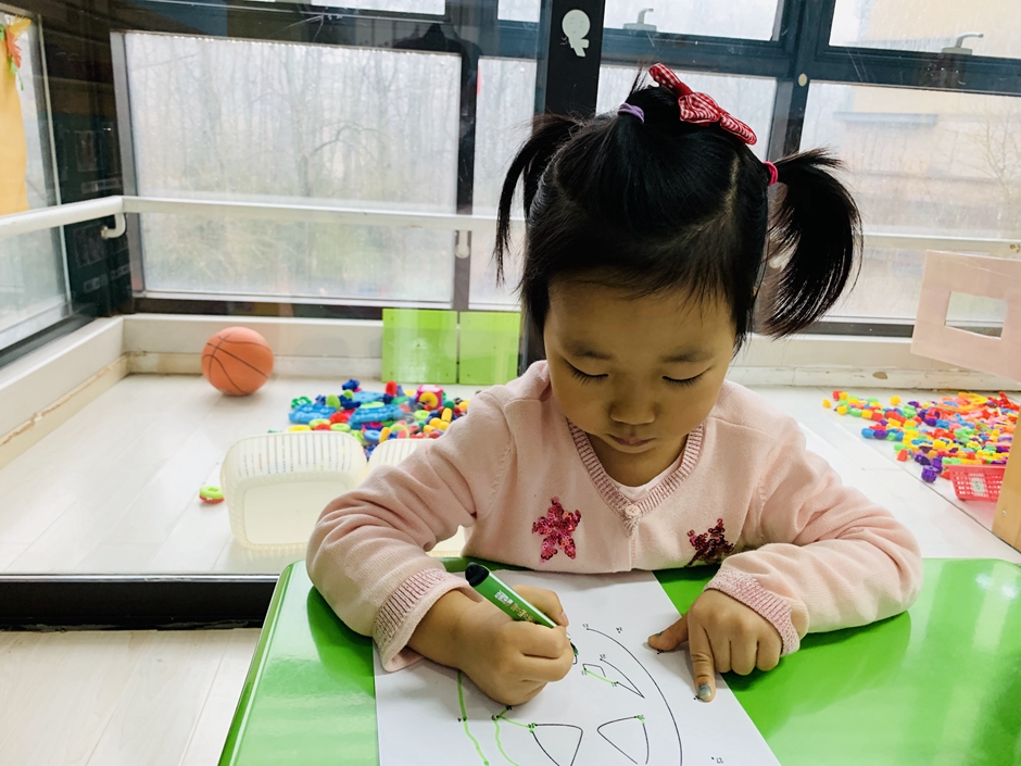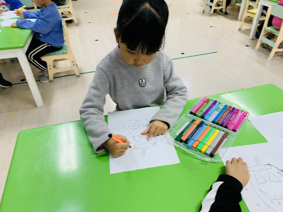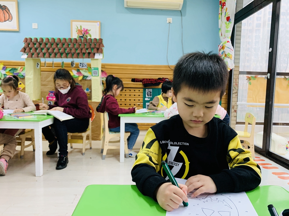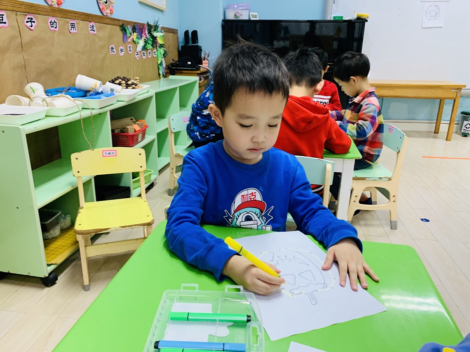 开学第一天,小朋友们回归幼儿园生活,上课时间小朋友们认真的做着,今天的南瓜是锻炼小朋友们的专注力,通过动手和眼睛观察使自己静下心来。每个人都在认真的连线。