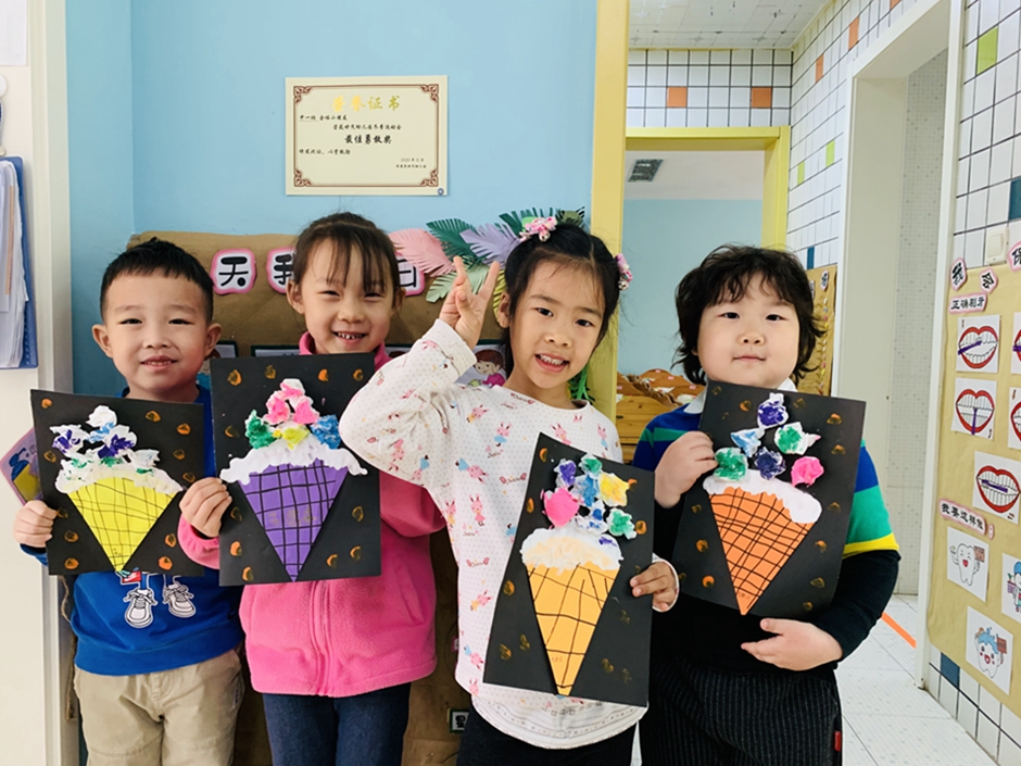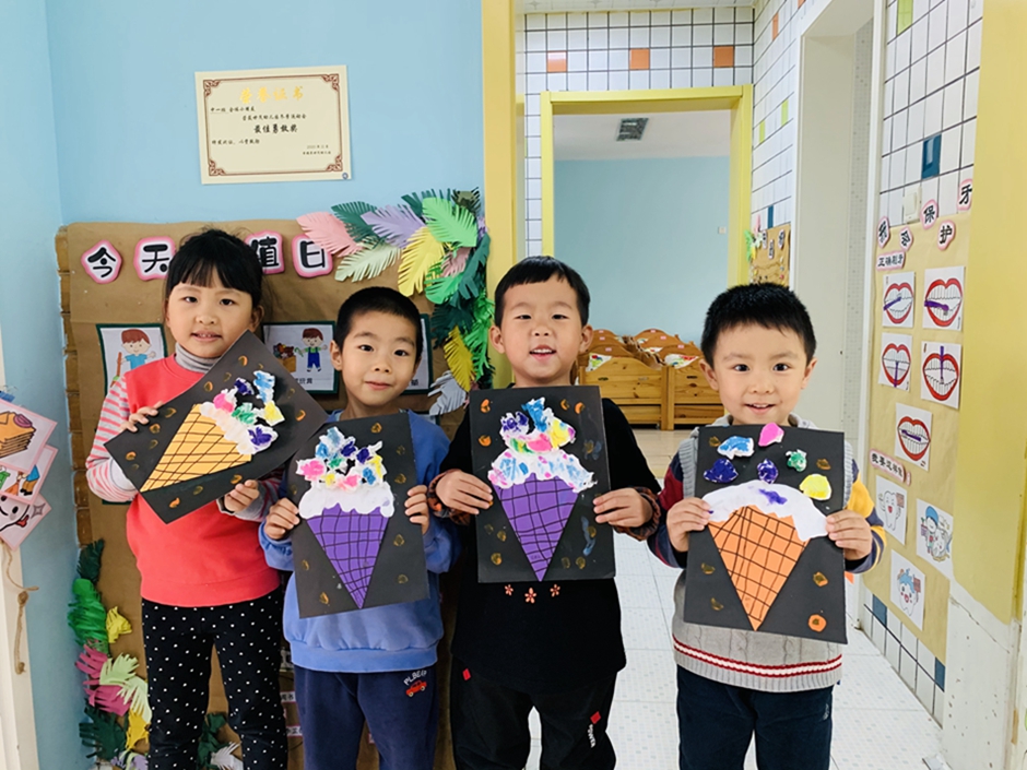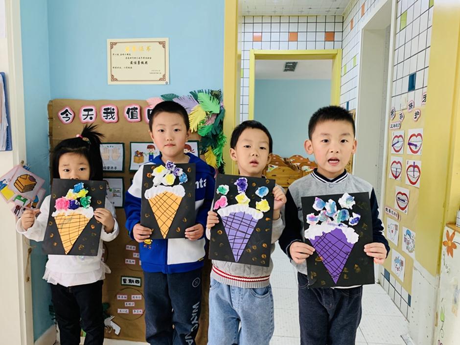 今天带小朋友做了,最喜欢吃的冰激凌,通过了解冰激凌的外形,小朋友们自己动手画冰激凌的甜筒,卫生纸做冰激凌球,每个人选择自己最爱吃的口味涂上颜色。