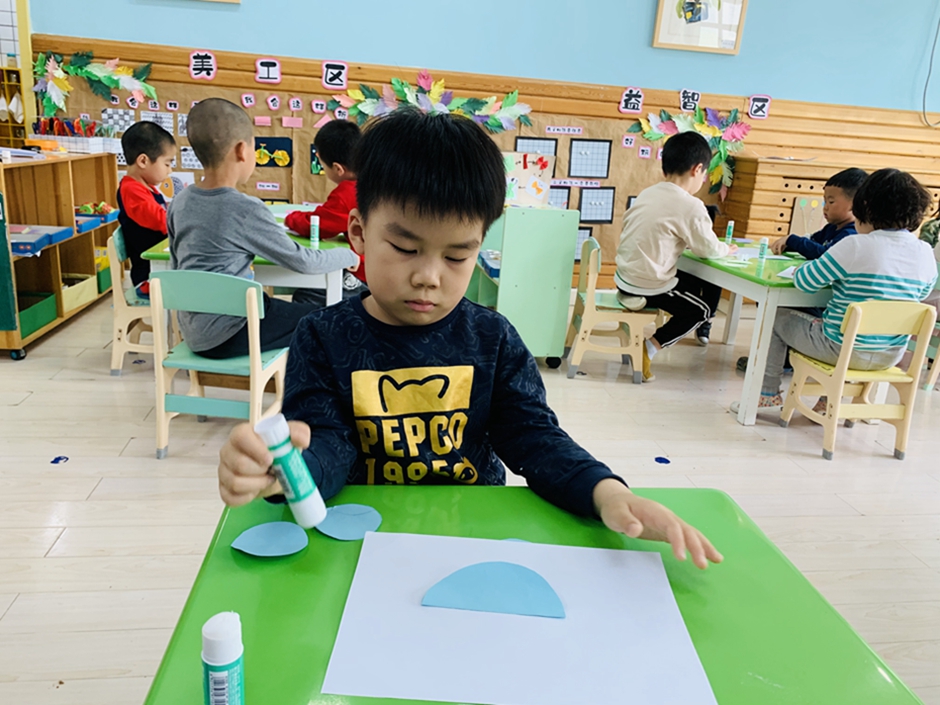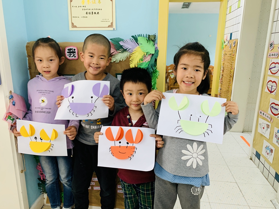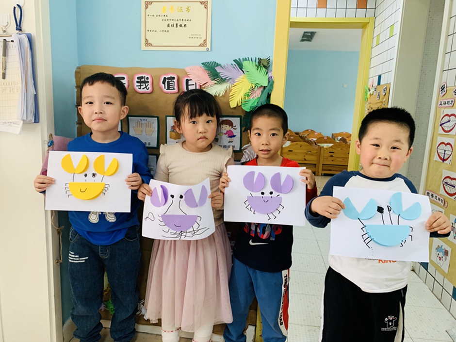 通过带小朋友了解了小螃蟹的外观特征,以及指导螃蟹有8条腿。今天小朋友们自己动手制作螃蟹。粘贴之后。自己给螃蟹画眼睛和腿。螃蟹就制作完成了。