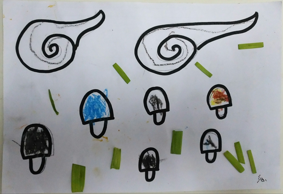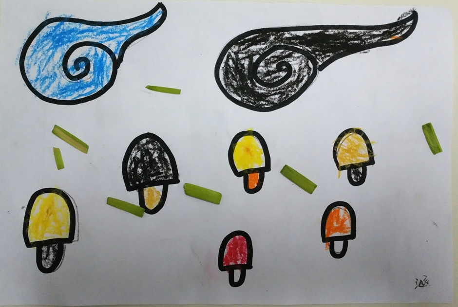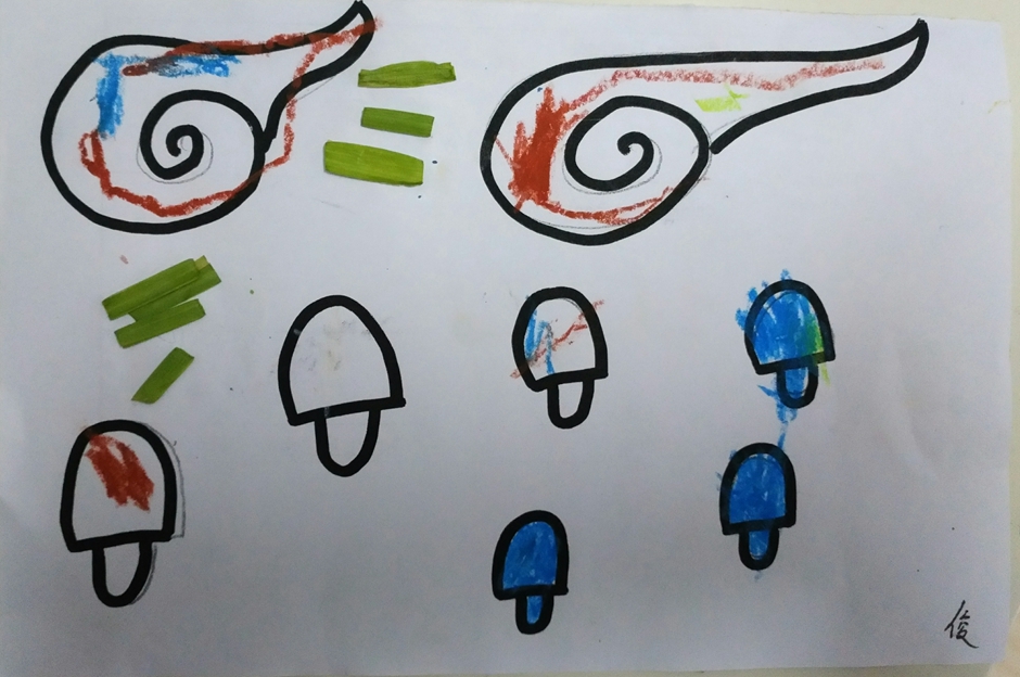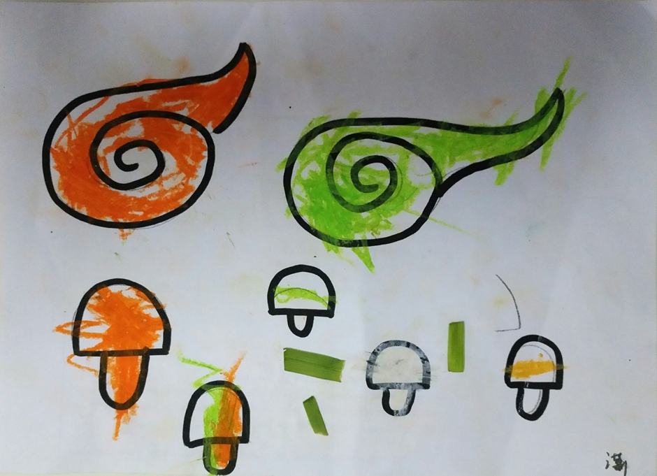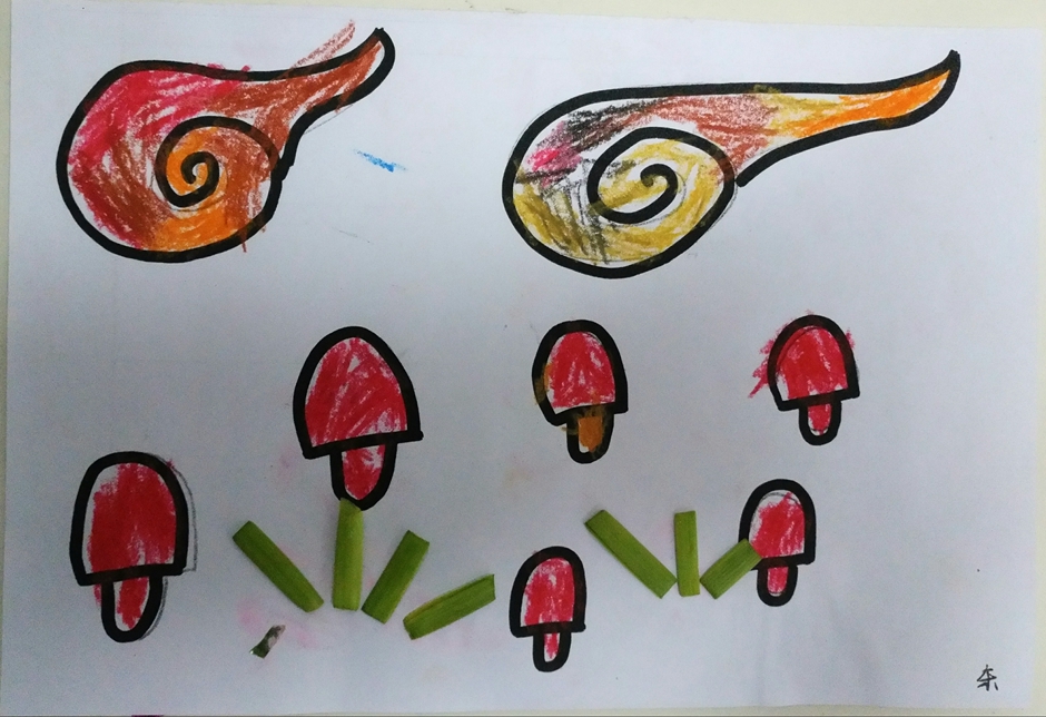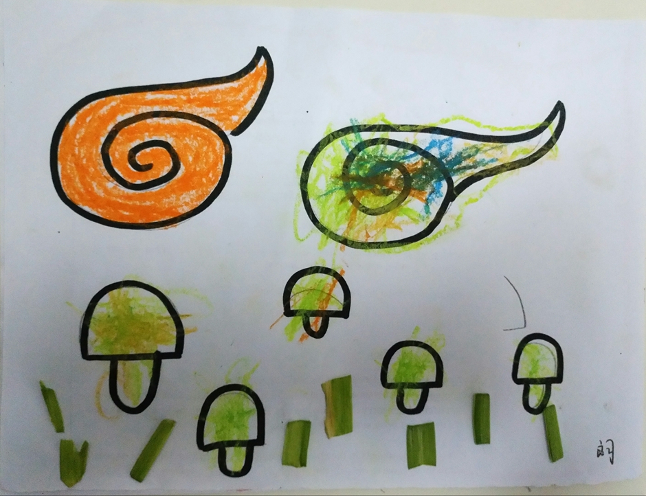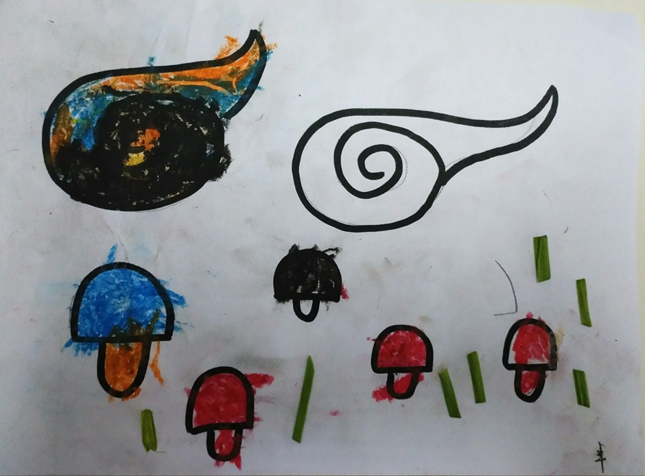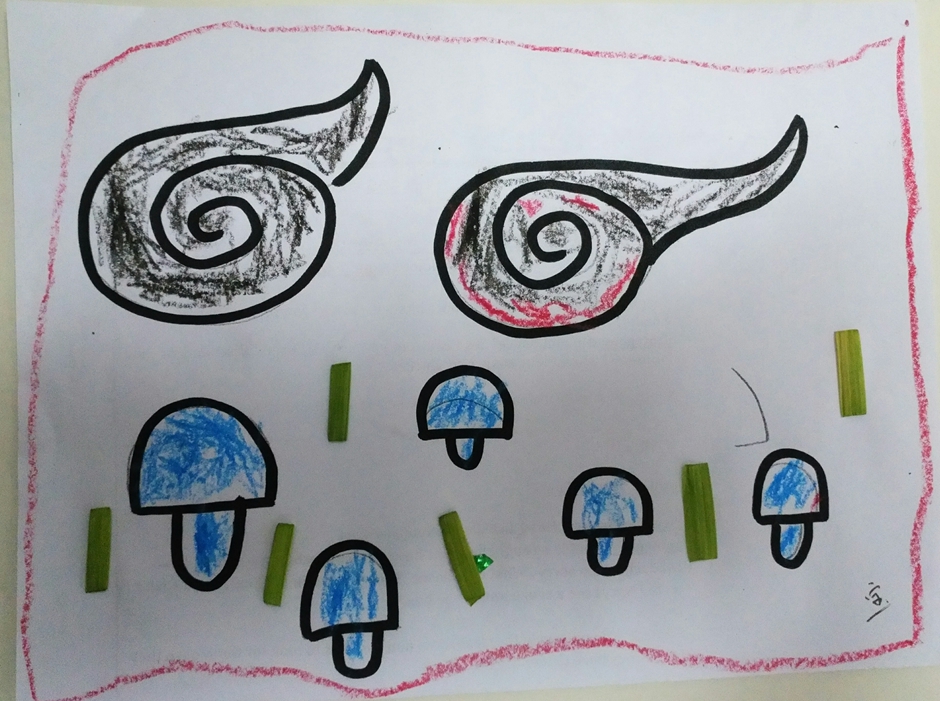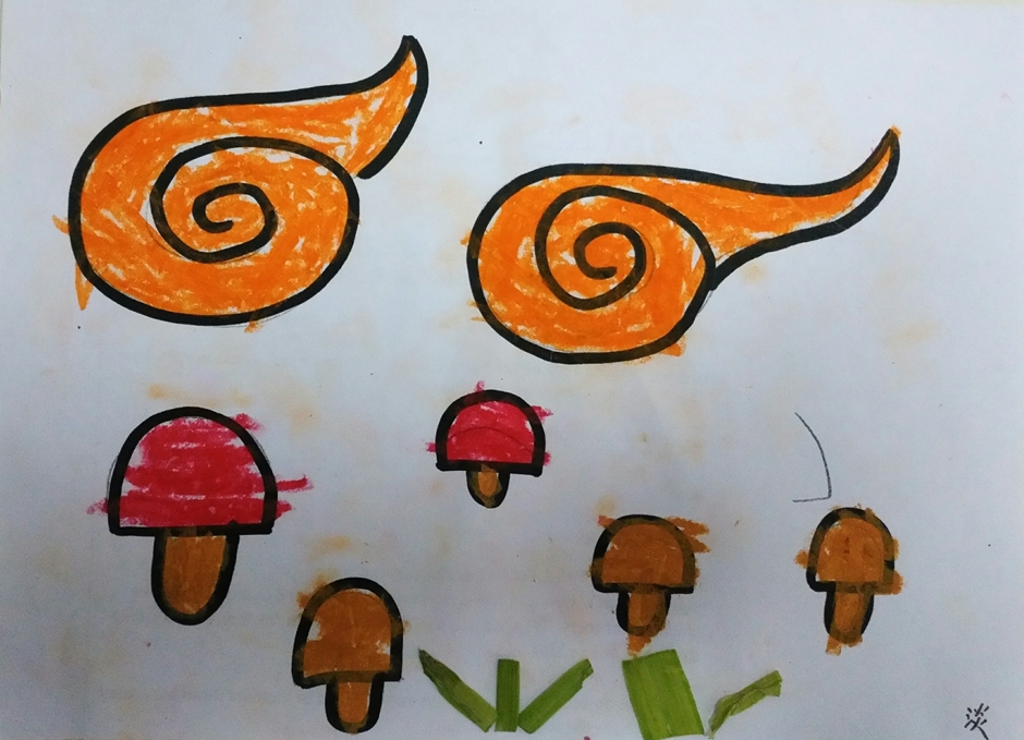 我给云朵填上了漂亮的颜色,蘑菇也有了自己的颜色,再加点青青的草地,这样这个世界就会像彩虹一样漂亮了。