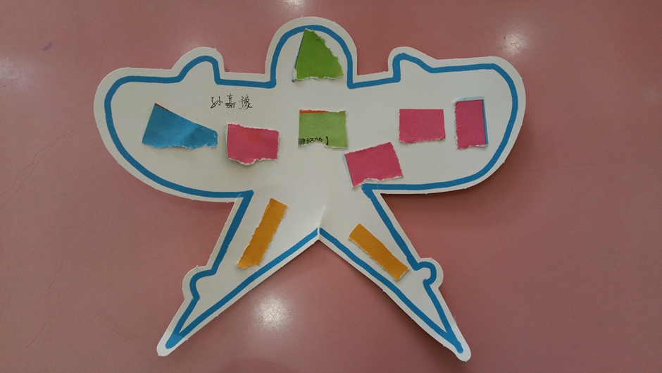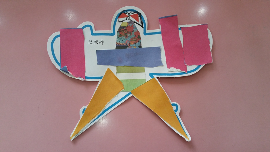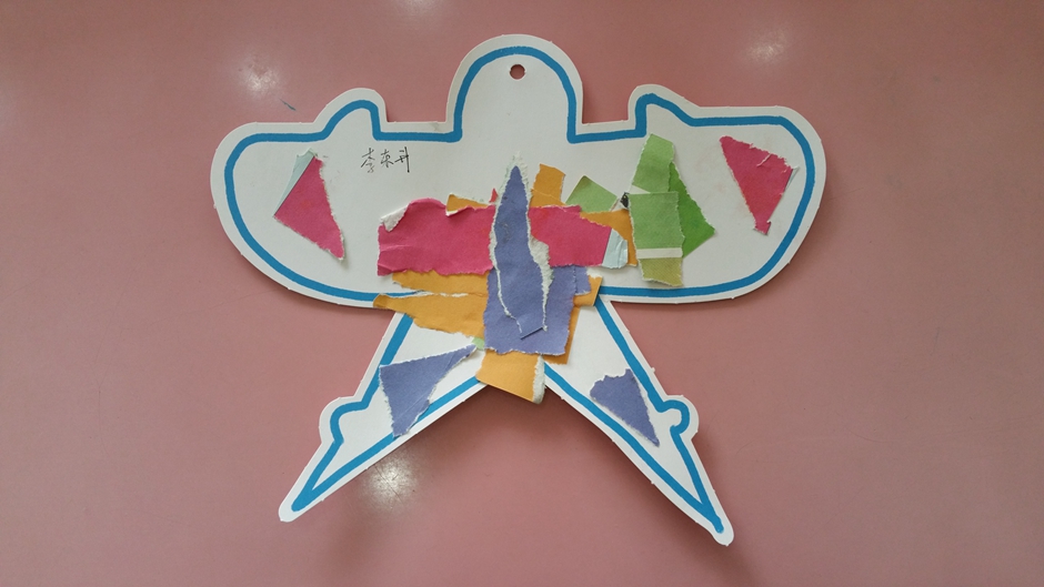 我们用撕、贴的方法制作了好多漂亮的风筝。